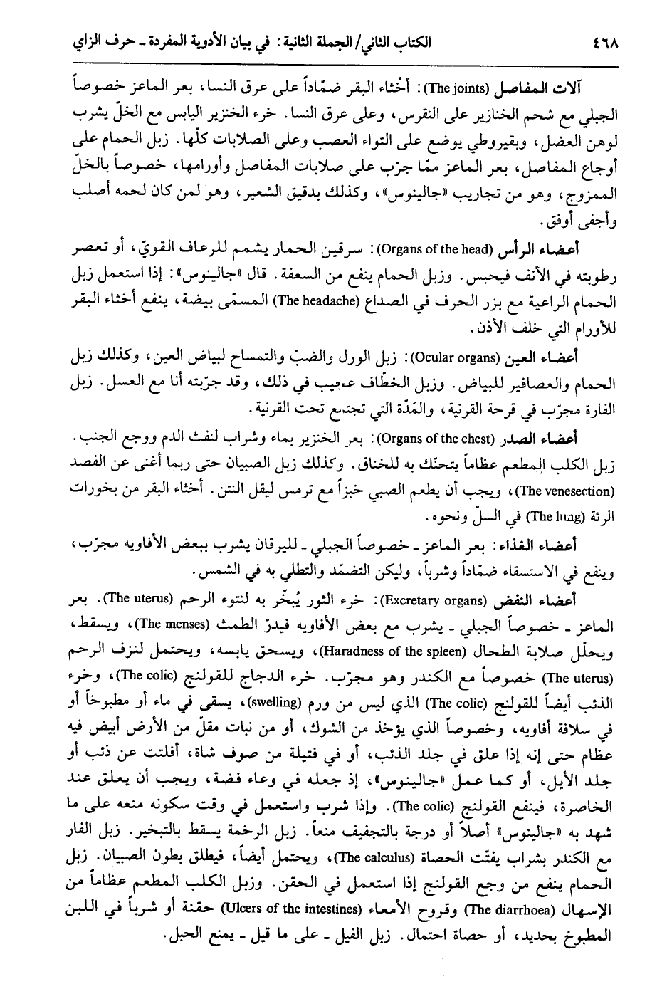 آلَات المفاصل: أخْثاء الْبَقر ضمّاداً على عرق النسا بعر الماعز خُصُوصا الْجبلي مَعَ شَحم الْخَنَازِير على النقرس وعَلى عرق النسا. خرء الْخِنْزِير الْيَابِس مَعَ الْخلّ يشرب لوهن العضل وبقيروطي يوضع على التواء العصب وعَلى الصلابات كلهَا. زبل الْحمام على أوجاع المفاصل بعر الماعز ممّا جرّب على صلابات المفاصل وأورامها خُصُوصا بالخل الممزوج وَهُوَ من تجاريب جالينوس وَكَذَلِكَ بدقيق الشّعير وَهُوَ لمن كَانَ لَحْمه صلب وأجفى أوفق. أَعْضَاء الرَّأْس: سرقين الْحمار يشمم للرعاف الْقوي أَو تعصر رطوبته فِي الْأنف فَيحْبس. وزبل الْحمام ينفع من السعفة. قَالَ جالينوس: إِذا اسْتعْمل زبل الْحمام الراعية مَعَ بزر الْحَرْف فِي الصداع الْمُسَمّى بَيْضَة ينفع أخثاء الْبَقر للأورام الَّتِي خلف الْأذن. أَعْضَاء الْعين: زبل الورل والضبّ والتمساح لبياض الْعين وَكَذَلِكَ زبل الْحمام والعصافير للبياض. وزبل الخطاف عَجِيب فِي ذَلِك وَقد جربته أَنا مَعَ الْعَسَل. زبل الفارة مجرّب فِي قرحَة القرنية والمدة الَّتِي تَجْتَمِع تَحت القرنية. أَعْضَاء الصَّدْر: بعر الْخِنْزِير بِمَاء وشراب لنفث الدَّم ووجع الْجنب. زبل الْكَلْب الْمطعم عظاماً يتحنك بِهِ للخناق. وَكَذَلِكَ زبل الصّبيان حَتَّى رُبمَا أغْنى عَن الفصد وَيجب أَن يطعم الصَّبِي خبْزًا مَعَ ترمس ليقل النتن. أخثاء الْبَقر من بخورات الرئة فِي السلّ وَنَحْوه. أَعْضَاء الْغذَاء: بعر الماعز خُصُوصا الْجبلي لليرقان يشرب بِبَعْض الأفاويه مجرب وينفع فِي الاسْتِسْقَاء ضماداً وشرباً وَليكن التضمد والتطلي بِهِ فِي الشمسْ. أَعْضَاء النفض: خرء الثور يُبخر بِهِ لنتوء الرَّحِم. بعر الماعز خصوضاً الْجبلي يشرب مَعَ بعض الأفاويه فيدر الطمث وَيسْقط ويحلل صلابة الطحال ويسحق يابسه وَيحْتَمل لنزف الرَّحِم خُصُوصا مَعَ الكندر وَهُوَ مجرب. خرء الدَّجَاج للقولنج وخرء الذِّئْب أَيْضا للقولنج الَّذِي لَيْسَ من ورم يسقى فِي مَاء أَو مطبوخاً أَو فِي سلافة أفاويه وخصوصاً الَّذِي يُؤْخَذ من الشوك أَو من نَبَات مقلّ من الأَرْض أَبيض فِيهِ عِظَام حَتَّى إِنَّه إِذا علق فِي جلد الذِّئْب أَو فِي فَتِيلَة من صوف شَاة أفلتت عَن ذِئْب أَو جلد الأيل أَو كَمَا عمل جالينوسى إِذْ جعله فِي وعَاء فضَّة وَيجب أَن يعلق عِنْد الخاصرة فينفع القولنج. وَإِذا شرب وَاسْتعْمل فِي وَقت سكونه مَنعه على مَا شهد بِهِ جالينوس أصلا أَو دَرَجَة بالتجفيف منُعاً. زبل الرخمة يسْقط بالتبخير. زبل الفار مَعَ الكندر بشراب يفتّت الْحَصَاة وَيحْتَمل أَيْضا فيطلق بطُون الصّبيان. زبل الْحمام ينفع من وجع القولنج إِذا اسْتعْمل فِي الحقن. وزْبل الْكَلْب الْمطعم عظاماً من الإسهال وقروح الأمعاء حقنة أَو شرباٌ فِي اللَّبن الْمَطْبُوخ بحديد أَو حَصَاة احْتِمَال. زبل الْفِيل على مَا قيل يمْنَع الْحَبل.