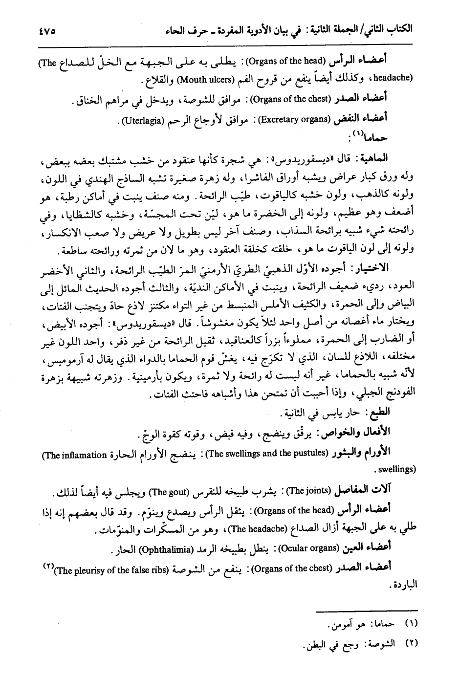 أَعْضَاء الرَّأْس: يطلى بِهِ على الْجَبْهَة مَعَ الْخلّ للصداع وَكَذَلِكَ أَيْضا ينفع من قُرُوح الْفَم والقلاع. أَعْضَاء الصَّدْر: مُوَافق للشوصة وَيدخل فِي مراهم الخناق. أَعْضَاء النفض: مُوَافق لأوجاع الرَّحِم. حَماما: الْمَاهِيّة: قَالَ ديسقوريدوس: هِيَ شَجَرَة كَأَنَّهَا عنقود من خشب مشتبك بعضه بِبَعْض وَله ورق كبار عراض وَيُشبه أوراق الفاشرا وَله زهرَة صَغِيرَة تشبه الساذج الْهِنْدِيّ فِي اللَّوْن ولونه كالذهب ولون خشبه كالياقوت طيب الرَّائِحَة. وَمِنْه صنف ينْبت فِي أَمَاكِن رطبَة هُوَ أَضْعَف وَهُوَ عَظِيم ولونه إِلَى الخضرة مَا هُوَ لين تَحت المجسة وخشبه كالشظايا وَفِي رَائِحَته شَيْء شَبيه برائحة السذاب وصنف آخر لَيْسَ بطويل وَلَا عريض وَلَا صَعب الانكسار ولونه إِلَى لون الْيَاقُوت ماهو خلقته كخلقة العنقود وَهُوَ مَا لَان من ثَمَرَته ورائحته ساطعة. الِاخْتِيَار: أجوده الأول الذَّهَبِيّ الطري الأرمني المر الطّيب الرَّائِحَة وَالثَّانِي الْأَخْضَر الْعود رَدِيء ضَعِيف الرَّائِحَة وينبت فِي الْأَمَاكِن الندية وَالثَّالِث أجوده الحَدِيث المائل إِلَى الْبيَاض وَإِلَى الْحمرَة والكثيف الأملس المنبسط من غير التواء مكتنز لاذع حاد ويتجنب الفتات ويختار مَاء أغصانه من أصل وَاحِد لئلآ يكون مغشوشاً. قَالَ ديسقوريدوس: أجوده الْأَبْيَض أَو الضَّارِب إِلَى الْحمرَة مملوءاً بزراً كالعناقيد ثقيل الرَّائِحَة من غير ذفر وَاحِد اللَّوْن غير مُخْتَلفه اللاذع للسان الَّذِي لَا تكرج فِيهِ يغش قوم الْحمام بالدواء الَّذِي يُقَال لَهُ آرموميس لِأَنَّهُ شَبيه بالحماما غير أَنه لَيست لَهُ رَائِحَة وَلَا ثَمَرَة وَيكون بأرمينية. وزهرته شَبيهَة بزهرة الفودنج الْجبلي وَإِذا أَحْبَبْت أَن تمتحن هَذَا وأشباهه فاحتث الفتات. الطَّبْع: حَار يَابِس فِي الثَّانِيَة. الآفعال والخواص: يرقق وينضج وَفِيه قبض وقوته كقوة الوج. الأورام والبثور: ينضج الأورام الحارة. أَعْضَاء الرَّأْس يثقل الرَّأْس ويصدع وينوم. وَقد قَالَ بَعضهم أَنه إِذا طلي بِهِ على الْجَبْهَة أَزَال الصداع وَهُوَ من المسكرات والمنومات. أَعْضَاء الْعين: ينطل بطبيخه الرمد الْحَار. أَعْضَاء الصَّدْر: ينفع من الشوصة الْبَارِدَة.