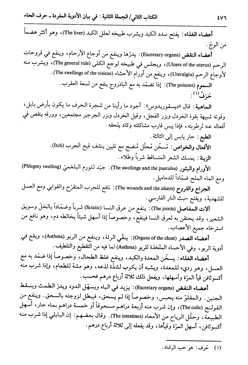 أَعْضَاء الْغذَاء: يفتح سدد الكبد وَيشْرب طبيخه لعلل الكبد وَهُوَ أَكثر هضماً من الوج. أَعْضَاء النفض: يدرها وينفع من أوجاع الْأَرْحَام وينفع فِي قروحات الرَّحِم وَيجْلس فِي طبيخه لوجع الكلى وَيشْرب مِنْهُ لأوجاع الرَّحِم وينفع من أورام الأحشاء. السمُوم: إِذا تضمد بِهِ مَعَ الباذروح ينفع من لسعة الْعَقْرَب. حرف: الْمَاهِيّة: قَالَ ديسقوريدوس: أَجود مَا رَأينَا من شَجَرَة الْحَرْف مَا يكون بِأَرْض بابل وقوته شَبيهَة بِقُوَّة الْخَرْدَل وبزر الفجل وَقيل الْخَرْدَل وبزر الجرجير مُجْتَمعين وورقه ينقص فِي أَفعاله عَنهُ لرطوبته فَإِذا يبس قَارب مشاكلته وَكَاد يلْحقهُ. الطَّبْع: حَار يَابِس إِلَى الثَّالِثَة. الْأَفْعَال والخواص: مُسخن مُحَلل مُنضج مَعَ تليين ينشف قيح الجرب. الأورام والبثور: جيد للورم البلغمي وَمَعَ المَاء الْملح ضمّاداً للدماميل. الجروح والقروح: نَافِع للجرب المتقرح والقوابي مَعَ الْعَسَل للشهدية ويقلع خبث النَّار الْفَارِسِي. آلَات المفاصل: ينفع من عرق النسا شرباً وضماداً بالخل وَسَوِيق الشّعير وَقد يحتقن بِهِ لعرق النسا فينفع وخصوصاً إِذا أسهل شَيْئا يخالطه دم وَهُوَ نَافِع من استرخاء جَمِيع الأعصاب. أَعْضَاء الصَّدْر: ينقي الرئة وينفع من الربو وَيَقَع فِي أدوية الربو وَفِي الإحساء المتخذة للربو لمافيه من التقطيع والتلطيف. أَعْضَاء الْغذَاء: يسخن الْمعدة والكبد وينفع غلظ الطحال وخصوصاً إِذا ضمد بِهِ مَعَ الْعَسَل وَهُوَ رَدِيء للمعدة وَيُشبه أَن يكوب لشدَّة لذعه وَهُوَ مشه للطعام وَإِذا شرب مِنْهُ أكسوثافن قيأ الْمرة وأسهلها وَيفْعل ذَلِك ثَلَاثَة أَربَاع دِرْهَم فَحسب. أَعْضَاء النفض: يزِيد فِي الباه ويسهل الدُّود ويدر الطمث وَيسْقط الْجَنِين. والمقلو مِنْهُ يحبس وخصوصاً إِذا لم يسحق فَيبْطل لزوجته بالسحق. وينفع من القولنج وَإِن شرب مِنْهُ أَرْبَعَة دَرَاهِم مسحوقاً أَو خَمْسَة دَرَاهِم بِمَاء حَار أسهل الطبيعة وحلل الرِّيَاح من الأمعاء. وَقَالَ بَعضهم: إِن البابلي إِذا شرب مِنْهُ أكسوثافن أسهل الْمرة وقيأها وَقد يَفْعَله ثَلَاثَة أَربَاع دِرْهَم.