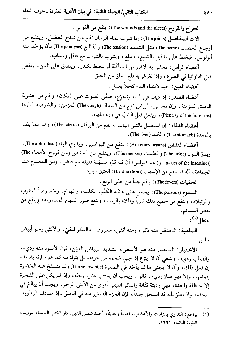 الجروح والقروح: ينفع من القوابي. آلَات المفاصل: إِذا شرب بِمَاء الرُّمَّان نفع من شدخ العضل وينفع من أوجاع العصب مثل التمدد والفالج بِأَن يُؤْخَذ مِنْهُ أنولوس فيخلط على مَا قيل بالشمع ويبلع وَيشْرب بِالشرابِ مَعَ فلفل وسذاب. أَعْضَاء الرَّأْس: تحشى بِهِ الأضراس المتأكلة أَو يخلط بكندر ويلصق على السن وَيفْعل فعل الفاوانيا فِي الصرع وَإِذا تغرغر بِهِ قلع العلق من الْحلق. أَعْضَاء الْعين: جيد لابتداء المَاء كحلاً بِعَسَل. أَعْضَاء الصَّدْر: إِذا ديف فِي المَاء وتجرع صفى الصَّوْت على الْمَكَان ونفع من خشونة الْحلق المزمنة. وَإِن تحسّى بالبيض نفع من السعال المزمن والشوصة الْبَارِدَة وَيفْعل فعل الشب فِي ورم اللهاة. أَعْضَاء الْغذَاء: إِن اسْتعْمل بِالتِّينِ الْيَابِس نفع من اليرقان وَهُوَ مِمَّا يضر بالمعدة والكبد. أَعْضَاء النفض: ينفع من البواسير وَيُقَوِّي الباه ويدر الْبَوْل والطمث وينفع من المغص وَمن قُرُوح الأمعاء. وَزعم بولس أَن فِيهِ قُوَّة مسهلة قَليلَة مَعَ قبض. وَمن الْمَعْلُوم عَنهُ الْجَمَاعَة أنّه قد ينفع من الإسهال الْعَتِيق الْبَارِد. الحميات: ينفع جدا من حمى الرّبع. السمُوم: يَجْعَل على عضة الكَلْب الكَلِب والهوام وخْصوصاً الْعَقْرَب والرتيلاء وينفع من جَمِيع ذَلِك شرباً وطلاء بالزيت وينفع ضَرَر السِّهَام المسمومة وينفع من بعض السمائم. حنظل: الِاخْتِيَار: الْمُخْتَار مِنْهُ هُوَ الْأَبْيَض الشَّديد الْبيَاض اللين فَإِن الْأسود مِنْهُ رَدِيء والصلب رَدِيء. وَيَنْبَغِي أَن لَا ينْزع إِذا جني شحمه من جَوْفه بل يتْرك فِيهِ كَمَا هُوَ فَإِنَّهُ يضعف إِن فعل ذَلِك ث وَأَن لَا يجنى مَا لم يَأْخُذ فِي الصُّفْرَة وَلم تنسلخ عَنهُ الخضرة بِتَمَامِهَا وَإِلَّا فَهُوَ ضارّ رَدِيء. قَالُوا: وَيجب أَن يجْتَنب قشره وحبه وَإِذا لم يكن على الشَّجَرَة إِلَّا حَنْظَلَة وَاحِدَة فَهِيَ رَدِيئَة قتّالة وَالذكر الليفي أقوى من الْأُنْثَى الرخو وَيجب أَن يُبَالغ فِي سحقه وَلَا يغتر بِأَنَّهُ قد انسحق جيدا فَإِن الْجُزْء الصَّغِير مِنْهُ فِي الحسّ إِذا صَادف الرُّطُوبَة
