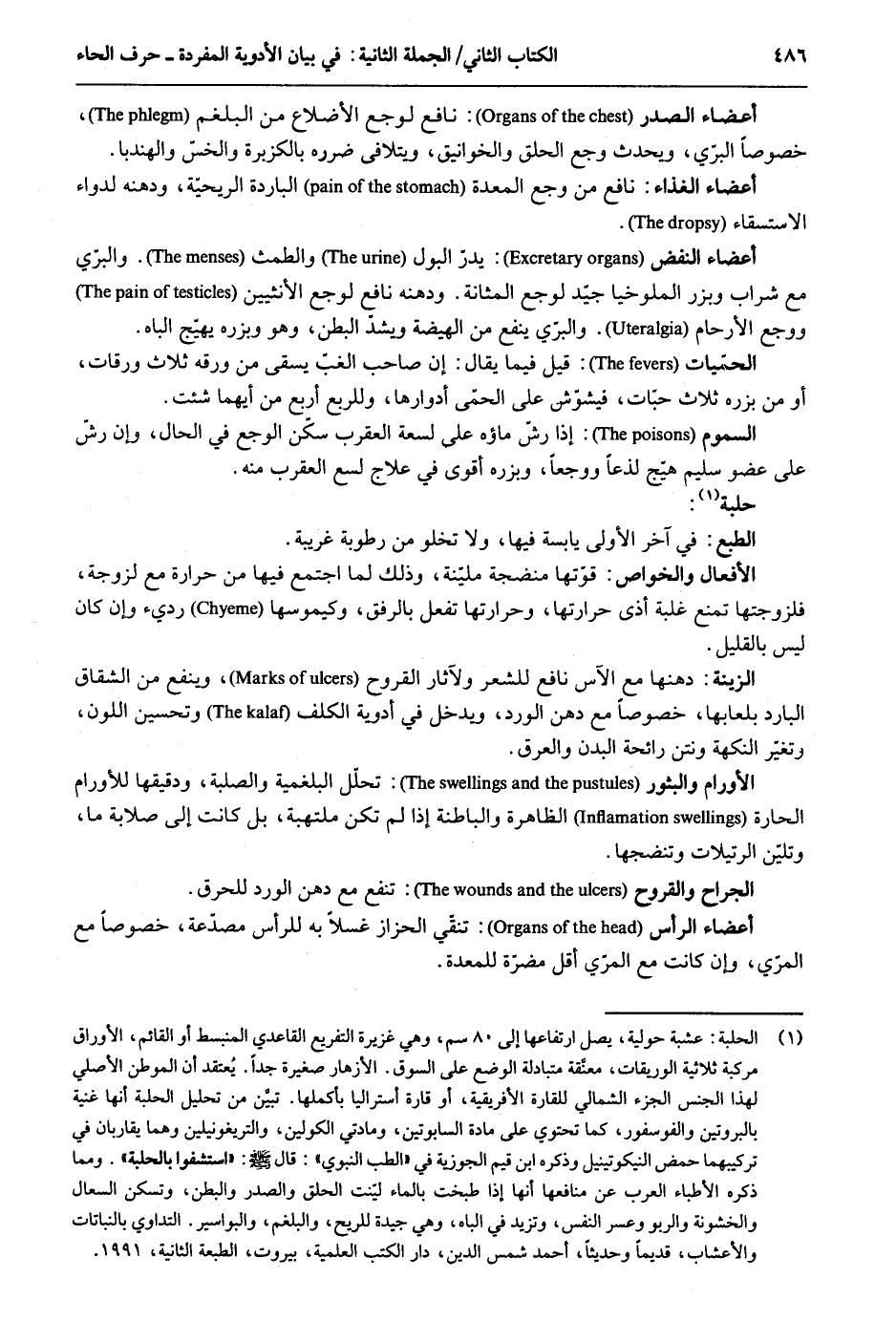 أَعْضَاء الصَّدْر: نَافِع لوجع الأضلاع من البلغم خصوضاً البرّي وَيحدث وجع الْحلق والخوانيق ويتلاقى ضَرَره بالكزبرة والخسّ والهندبا. أَعْضَاء النفض: يدرّ الْبَوْل والطمث. والبرّي مَعَ شراب وبزر الملوخيا جيّد لوجع المثانة. ودهنه نَافِع لوجع الْأُنْثَيَيْنِ ووجع الْأَرْحَام. والبرّي ينفع من الهيضة ويشد الْبَطن وَهُوَ وبزره يهيّج الباه. الحمّيات: قيل فِيمَا يُقَال: إِن صَاحب الغبّ يُسمى من ورقه ثَلَاث وَرَقَات أَو من بزره ثَلَاث حبّات فيشوش على الْحمى أدوارها وللربع أَربع من أَيهمَا شِئْت. السمُوم: إِذا رش مَاؤُهُ على لسعة الْعَقْرَب سكّن الوجع فِي الْحَال وَإِن رشّ على عُضْو سليم هيج لذعاً ووجعاً وبزره أقوى فِي علاج لسع الْعَقْرَب مِنْهُ. حلبة: الطَّبْع: فِي آخر الأولى يابسة فِيهَا وَلَا تَخْلُو من رُطُوبَة غَرِيبَة. الْأَفْعَال والخواص: قوتها منضجة ملينة وَذَلِكَ لما اجْتمع فِيهَا من حرارة مَعَ لزوجة فلزوجتها تمنع غَلَبَة أَذَى حَرَارَتهَا وحرارتها تفعل بالرفق وكيموسها رَدِيء وَإِن كَانَ لَيْسَ بِالْقَلِيلِ. الزِّينَة: دهنها مَعَ الآس نَافِع للشعر ولآثار القروح وينفع من الشقاق الْبَارِد بلعابها خُصُوصا مَعَ دهن الْورْد وَيدخل فِي أدوية الكلف وتحسين اللَّوْن وَتغَير النكهة ونتن رَائِحَة الْبدن والعرق. الأورام والبثور: تحلل البلغمية والصلبة ودقيقها للأورام الحارة الظَّاهِرَة والباطنة إِذا لم تكن ملتهبة بل كَانَت إِلَى صلابة مَا وتلين الرتيلات وتنضجها. أَعْضَاء الرَّأْس: تنقي الحزاز غسلا بِهِ للرأس مصدعة خُصُوصا مَعَ المري وَإِن كَانَت مَعَ المرّي أقل مضرَّة للمعدة.
