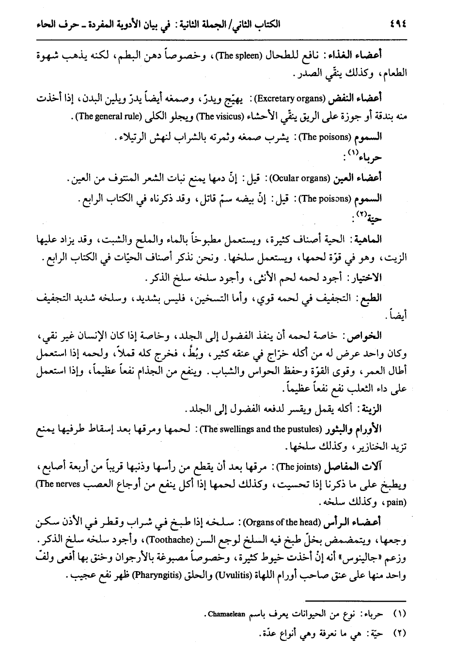 أَعْضَاء الْغذَاء: نَافِع للطحال وخصوصاً دهن البطم لكنه يذهب شَهْوَة الطَّعَام وَكَذَلِكَ ينقّي الصَّدْر. أَعْضَاء النفض: يهيج ويدر وصمغه أَيْضا يدر ويلين الْبدن إِذا أخذت مِنْهُ بندقة أَو جوزة على الرِّيق ينقّي الأخشاء ويجلو الْكُلِّي. السمُوم: يشرب صمغه وثمرته بِالشرابِ لنهش الرتيلاء. حرباء أَعْضَاء الْعين: قيل: إنّ دَمهَا يمْنَع نَبَات الشّعْر المنتوف من الْعين. حَيَّة الْمَاهِيّة: الْحَيَّة أَصْنَاف كَثِيرَة وَيسْتَعْمل مطبوخاً بِالْمَاءِ وَالْملح والشبت وَقد يُزَاد عَلَيْهَا الزَّيْت وَهُوَ فِي قوّة لَحمهَا وَيسْتَعْمل سلخها. وَنحن نذْكر أَصْنَاف الْحَيَّات فِي الْكتاب الرَّابِع. الِاخْتِيَار: أَجود لَحْمه دم الْأُنْثَى وأجود سلخه سلخ الذّكر. الطَّبْع: التجفيف فِي دَمه قوي وَأما التسخين فَلَيْسَ بشديد وسلخه شَدِيد التجفيف أَيْضا. الْخَواص: خَاصَّة لَحْمه أَن ينفذ الفضول إِلَى الْجلد وخاصة إِذا كَانَ الْإِنْسَان غير نقي وَكَانَ وَاحِد عرض لَهُ من أكله خراج فِي عُنُقه كثير وبُط فَخرج كُله قملاً ولحمه إِذا اسْتعْمل أَطَالَ الْعُمر وقوى الْقُوَّة وَحفظ الْحَواس والشباب. وينفع من الجذام نفعا عَظِيما وَإِذا اسْتعْمل على دَاء الثَّعْلَب نفع نفعا عَظِيما. الزِّينَة: أكله يقمل ويقسر لدفعه الفضول إِلَى الْجلد. الأورام والبثور: لَحمهَا ومرقها بعد إِسْقَاط طرفيها يمْنَع تزيد الْخَنَازِير وَكَذَلِكَ سلخها. آلَات المفاصل: مرقها بعد أَن يقطع من رَأسهَا وذنبها قَرِيبا من أَرْبَعَة أَصَابِع ويطبخ على مَا ذكرنَا إِذا تحسيت وَكَذَلِكَ لَحمهَا إِذا كل ينفع من أوجاع العصب وَكَذَلِكَ سلخه. أَعْضَاء الرَّأْس: سلخه إِذا طبخ فِي شراب وقطر فِي الْأذن سكن وجعها ويتمضمض بخلّ طبخ فِيهِ السلخ لوجع السن وأجود سلخه سلخ الذّكر. وَزعم جالينوس أَنه إنْ أخذت خيوط كَثِيرَة وخصوصاً مصبوغة بالأرجوان وخنق بهَا أَفْعَى ولف وَاحِد مِنْهَا على عنق صَاحب أورام اللهاة وَالْحلق ظهر نفع عَجِيب.