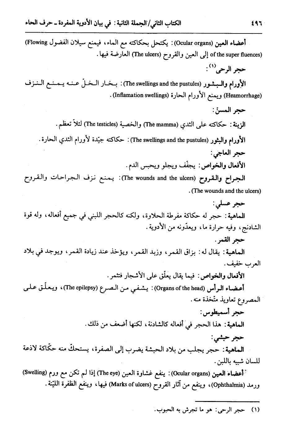 أَعْضَاء الْعين: يكتحل بحكاكته مَعَ المَاء فَيمْنَع سيلان الفضول إِلَى الْعين والقروح الْعَارِضَة فِيهَا. حجر الرَّحَى. الأورام والبثور: بخار الْخلّ عَنهُ يمْنَع النزف وَيمْنَع الأورام الحارة. حجرالمسن. الزِّينَة: حكاكته على الثدي والخصية لِئَلَّا تعظم. الأورام والبثور: حكاكته جَيِّدَة لأورام الثدي الحارة. حجر العاجي. الْأَفْعَال والخواص: يجفف ويجلو وَيحبس الدَّم. الْجراح والقروح: يمْنَع نزف الْجِرَاحَات والقروح. حجرعسلي: الْمَاهِيّة: حجر لَهُ حكاكة مفرطة الْحَلَاوَة وَلكنه كالحجر اللبني فِي جَمِيع أَفعاله وَله قُوَّة الشادنج وَفِيه حرارة مَا ويعدونه من الْأَدْوِيَة. حجرالقمر. الْمَاهِيّة: يُقَال لَهُ: بزاق الْقَمَر وزبد الْقَمَر وَيُؤْخَذ عَنهُ زِيَادَة الْقَمَر وَيُوجد فِي بِلَاد الْعَرَب خَفِيف. الْأَفْعَال والخواص: فِيمَا يُقَال يعلق على الْأَشْجَار فتثمر. أَعْضَاء الرَّأْس: يشفي من الصرع ويعلق على المصروع تعاويذ متخذة مِنْهُ. حجر أسميطوس. الْمَاهِيّة: هَذَا الْحجر فِي أَفعاله كالشادنة لَكِنَّهَا أَضْعَف من ذَلِك. حجرحبشي. الْمَاهِيّة: حجر يجلب من بِلَاد الْحَبَشَة يضْرب إِلَى الصفر يستحكّ مِنْهُ حكّاكة لاذعة للسان شَبيه بِاللَّبنِ. أَعْضَاء الْعين: ينفغ غشاوة الْعين إِذا لم تكن مَعَ ورم ورمد وينفع من آثَار القروح فِيهَا وينفع الظفرة اللينة.
