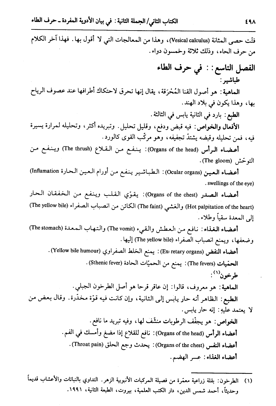 فتت حَصى المثانة وَهَذَا من المعالجات الَّتِي لَا أَقُول بهَا. فَهَذَا آخر الْكَلَام من حرف الْحَاء وَذَلِكَ ثَلَاثَة وَخَمْسُونَ دَوَاء. الْفَصْل التَّاسِع حرف الطَّاء طباشير. الْمَاهِيّة: هُوَ أصُول القنا المحرَقة يُقَال أَنَّهَا تحرق لاحتكاك أطرافها عِنْد عصوف الرِّيَاح بهَا وَهَذَا يكون فِي بِلَاد الْهِنْد. الْأَفْعَال والخواص: فِيهِ قبض وَدفع وَقَلِيل تَحْلِيل. وتبريده أَكثر وتحليله لمرارة يسيرَة فِيهِ فَمن تَحْلِيله وَقَبضه يشْتَد تجفيفه وَهُوَ مركب القوى كالورد. أَعْضَاء الرَّأْس: ينفع من القلاع وينفع من التوحش. أَعْضَاء الْعين: الطباشير ينفع من أورام الْعين الحارة. أَعْضَاء الصَّدْر: يُقَوي الْقلب وينفع من الخفقان الْحَار والغشى الْكَائِن من انصباب الصَّفْرَاء إِلَى الْمعدة سقيا وطلاء. أَعْضَاء الْغذَاء: نَافِع من الْعَطش والقيء والتهاب الْمعدة وضعفها وَيمْنَع انصباب الصَّفْرَاء إِلَيْهَا. أَعْضَاء النفض: يمْنَع الْخَلْط الصفراوي. الحميات: يمْنَع من الحميات الحادة. طرخون: الْمَاهِيّة: هُوَ مَعْرُوف قَالُوا: أَن عَاقِر قرحا هُوَ أصل الطرخون الْجبلي. الطَّبْع: الظَّاهِر أَنه حَار يَابِس إِلَى الثَّانِيَة وَإِن كَانَت فِيهِ قُوَّة مخدرة. وَقَالَ بعض من لَا يعْتَمد عليهِ: إِنَّه حَار يَابِس. الْخَواص: هُوَ يجفف الرطوبات منشف لَهَا وَفِيه تبريد مَا نَافِع. أَعْضَاء النَّفس: يحدث وجع الْحلق. أَعْضَاء الْغذَاء: عسر الهضم.