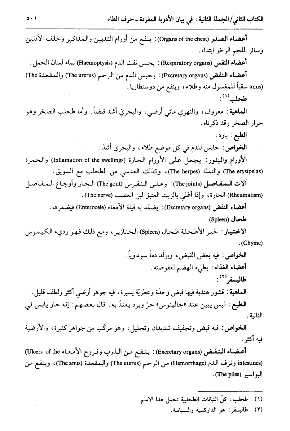 أَعْضَاء الصَّدْر: ينفع من أورام الثديين والمذاكير وَخلف الْأُذُنَيْنِ وَسَائِر اللَّحْم الرخو ابْتِدَاء. أعضاءالنفس: يحبس نفث الدَّم بِمَاء لِسَان الْحمل. أَعْضَاء النفض: يحبس الدَّم من الرَّحِم والمقعدة سقيا للمغسول مِنْهُ وطلاء وينفع من دوسنطاريا. طحلب. الْمَاهِيّة: مَعْرُوف والنهري مائي أرضي والبحري أَشد قبضا. وَأما طحلب الصخر وَهُوَ حرار الصخر وَقد ذَكرْنَاهُ. الطَّبْع: بَارِد. الْخَواص: حَابِس للدم فِي كل مَوضِع طلاء والبحري أَشد. الأورام والبثور: يَجْعَل على الأورام الحارة والحمرة والنملة وَكَذَلِكَ العدسي من الطحلب مَعَ السويق. آلَات المفاصل: وعَلى النقرس الْحَار وأوجاع المفاصل الحارة وَإِذا أغلي بالزيت الْعَتِيق لين العصب. أَعْضَاء النفض: يضمد بِهِ قيلة الأمعاء فيضمرها. طحال. . الِاخْتِيَار: خير الأطحلة طحال الْخَنَازِير وَمَعَ ذَلِك فَهُوَ رَدِيء الكيموس. الْخَواص: فِيهِ بعض الْقَبْض ويولّد دَمًا سوداوياً. أَعْضَاء الْغذَاء: بطيء الهضم لعفوصته. طاليسفر. الْمَاهِيّة: قشور هندية فِيهَا قبض وحدة وعطريّة يسيرَة فِيهِ جوهو أرضي أَكثر ولطف قَلِيل. س الطَّبْع. لَيْسَ يبين عِنْد جالينوس حر وَبرد يعْتد بِهِ. قَالَ بَعضهم: إِنَّه حَار يَابِس فِي الثَّانِيَة. الْخَواص: فِيهِ قبض وتجفيف شديدان وَتَحْلِيل وَهُوَ مركّب من جَوَاهِر كَثِيرَة والأرضية فِيهِ أَكثر. أَعْضَاء النفض: ينفع من الذرب وقروح الأمعاء ونزف الدَّم من الرَّحِم والمقعدة وينفع من