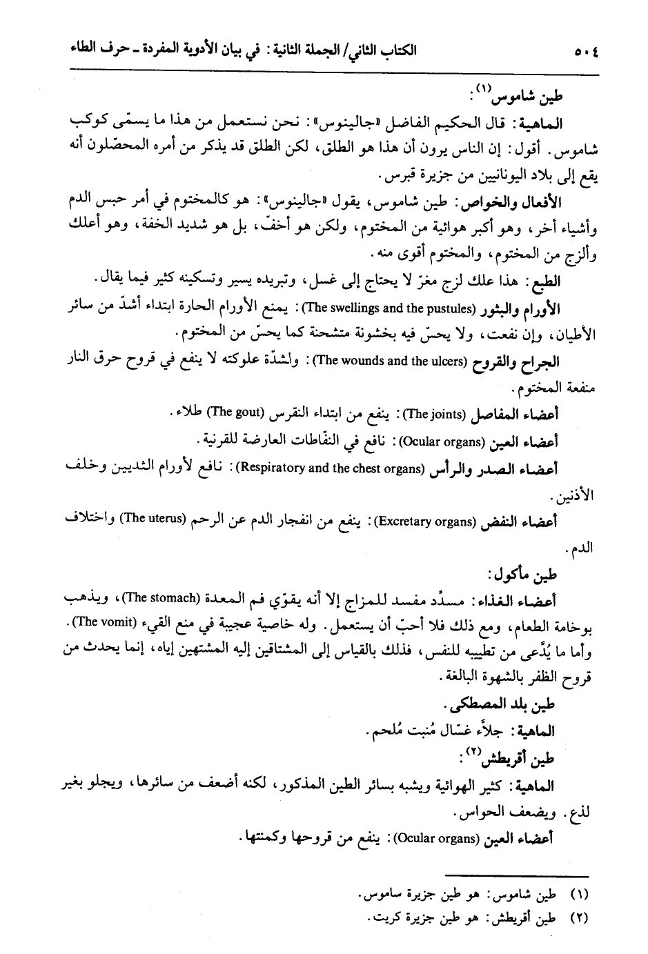 طين شاموس. الْمَاهِيّة: قَالَ الْحَكِيم الْفَاضِل جالينوس: نَحن نستعمل من هَذَا مَا يسمّى كَوْكَب شاموس. أَقُول: إِن النَّاس يرَوْنَ أَن هَذَا هُوَ الطلق لَكِن الطلق قد يذكر من أمره المحضلون أَنه يَقع إِلَى بِلَاد الْأَفْعَال والخواص: طين شاموس يَقُول جالينوس: هُوَ كالمختوم فِي أَمر حبس الدَّم وَأَشْيَاء آخر وَهُوَ أكبر هوائية من الْمَخْتُوم وَلَكِن هُوَ أخفّ بل هُوَ شَدِيد الخفة وَهُوَ أعلك وألزج من الْمَخْتُوم والمختوم أقوى مِنْهُ. الطَّبْع: هَذَا علك لزج مغرّ لَا يحْتَاج إِلَى غسل وتبريده يسير وتسكينه كثير فِيمَا يُقَال. الأورام والبثور: يمْنَع الأورام الحارة ابْتِدَاء أشدٌ من سَائِر الأطيان وَأَن نَفَعت وَلَا يحسّ فِيهِ بخشونة متشحنة كَمَا يحس من الْمَخْتُوم. الْجراح والقروح: ولشّدة علوكته لَا ينفع فِي قُرُوح حرق النَّار مَنْفَعَة الْمَخْتُوم. أَعْضَاء المفاصل: ينفع من ابْتِدَاء النقرس طلاء. أَعْضَاء الْعين: نَافِع فِي النقاطات الْعَارِضَة للقرنية. أَعْضَاء الصَّدْر وَالرَّأْس: نَافِع لأورام الثديين وَخلف الْأُذُنَيْنِ. أَعْضَاء النفض: ينفع من انفجار الدَّم عَن الرَّحِم وَاخْتِلَاف الدَّم. طين مَأْكُول. أَعْضَاء الْغذَاء: مُسَدّد مُفسد للمزاج إِلَّا أَنه يُقَوي فَم الْمعدة وَيذْهب بوخامة الطَّعَام وَمَعَ ذَلِك فَلَا أحب أَن يسْتَعْمل. وَله خاصية عَجِيبَة فِي منع الْقَيْء. وَأما مَا يُدَّعى من تطييبه للنَّفس طين بلد المصطكى. الْمَاهِيّة: جلاء غسّال مُنبت ملحم. طين أقريطش. الْمَاهِيّة: كثير الهوائية وَيُشبه بِسَائِر الطين الْمَذْكُور لكنه أَضْعَف من سائرها ويجلو بِغَيْر لذع. ويضعف الْحَواس. أَعْضَاء الْعين: ينفع من قروحها وكمنثها.