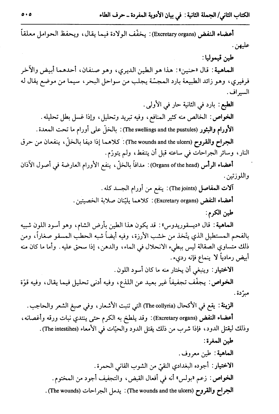 أَعْضَاء النفض: يُخَفف الْولادَة فِيمَا يُقَال ويحفظ الْحَوَامِل مُعَلّقا عَلَيْهِنَّ. طين قيموليا. الْمَاهِيّة: قَالَ حنين: هَذَا هُوَ الطين الديري وَهُوَ صنفان أَحدهمَا أَبيض وَالْآخر فرفيري وَهُوَ زَائِد الطبيعة بَارِد المجسّة يجلب من سواحل الْبَحْر سِيمَا من مَوضِع يُقَال لَهُ السيراف. الطَّبْع: بَارِد فِي الثَّانِيَة حَار فِي الأولى. الْخَواص: الْخَالِص مِنْهُ كثير الْمَنَافِع وَفِيه تبريد وَتَحْلِيل وَإِذا غسل بَطل تَحْلِيله. الأورام والبثور: بالخل على أورام مَا تَحت الْمعدة. الْجراح والقروح: كِلَاهُمَا إِذا ديفا بالخلّ ينفعان من حرق النَّار وَسَائِر الْجِرَاحَات فِي سَاعَته قبل أَعْضَاء الرَّأْس: مدافاً بالخل ينفع الأورام الْعَارِضَة فِي أصُول الآذان واللوزتين. آلَات المفاصل: ينفع من أورام الْجَسَد كُله. أَعْضَاء النفض: كِلَاهُمَا يلينان صلابة الخصيتين. طين الْكَرم. الْمَاهِيّة: قَالَ ديسقوريدوس: قد يكون هَذَا الطين بِأَرْض الشَّام وَهُوَ أسود اللَّوْن شَبيه بالفحم المستطيل الَّذِي يتّخذ من خشب الأرزة وَفِيه أَيْضا شبه الْحَطب المسقو صغَارًا وَمن ذَلِك متساوي الصقالة لَيْسَ ببطيء الانحلال فِي المَاء والدهن إِذا سحق عَلَيْهِ. وَأما مَا كَانَ مِنْهُ أَبيض رمادياً لَا ينماع فَإِنَّهُ رَدِيء. الِاخْتِيَار: وَيَنْبَغِي أَن يخْتَار مِنْهُ مَا كَانَ أسود اللَّوْن. الْخَواص: يجفف تجفيفاً غير بعيد عَن اللذع وَفِيه أدنى تَحْلِيل فِيمَا يُقَال وَفِيه قُوَّة مبردة. الزِّينَة: يَقع فِي الْحَال الَّتِي تنْبت الْأَشْعَار وَفِي صبغ الشّعْر والحاجب. أَعْضَاء النفض: وَقد يلطخ بِهِ الْكَرم حَتَّى يبتدي نَبَات ورقه وأغصانه وَذَلِكَ ليقْتل الدُّود فَإِذا شرب من ذَلِك يقتل الدُّود والحيات فِي الأمعاء. طين الْمغرَة. الِاخْتِيَار: أجوده الْبَغْدَادِيّ فِي النقيّ من الشوب القاني الْحمرَة. الْخَواص: زعم بولس أَنه فِي أَفعَال الْقَبْض والتجفيف أَجود من الْمَخْتُوم. الْجراح والقروح: يدمل الْجِرَاحَات.