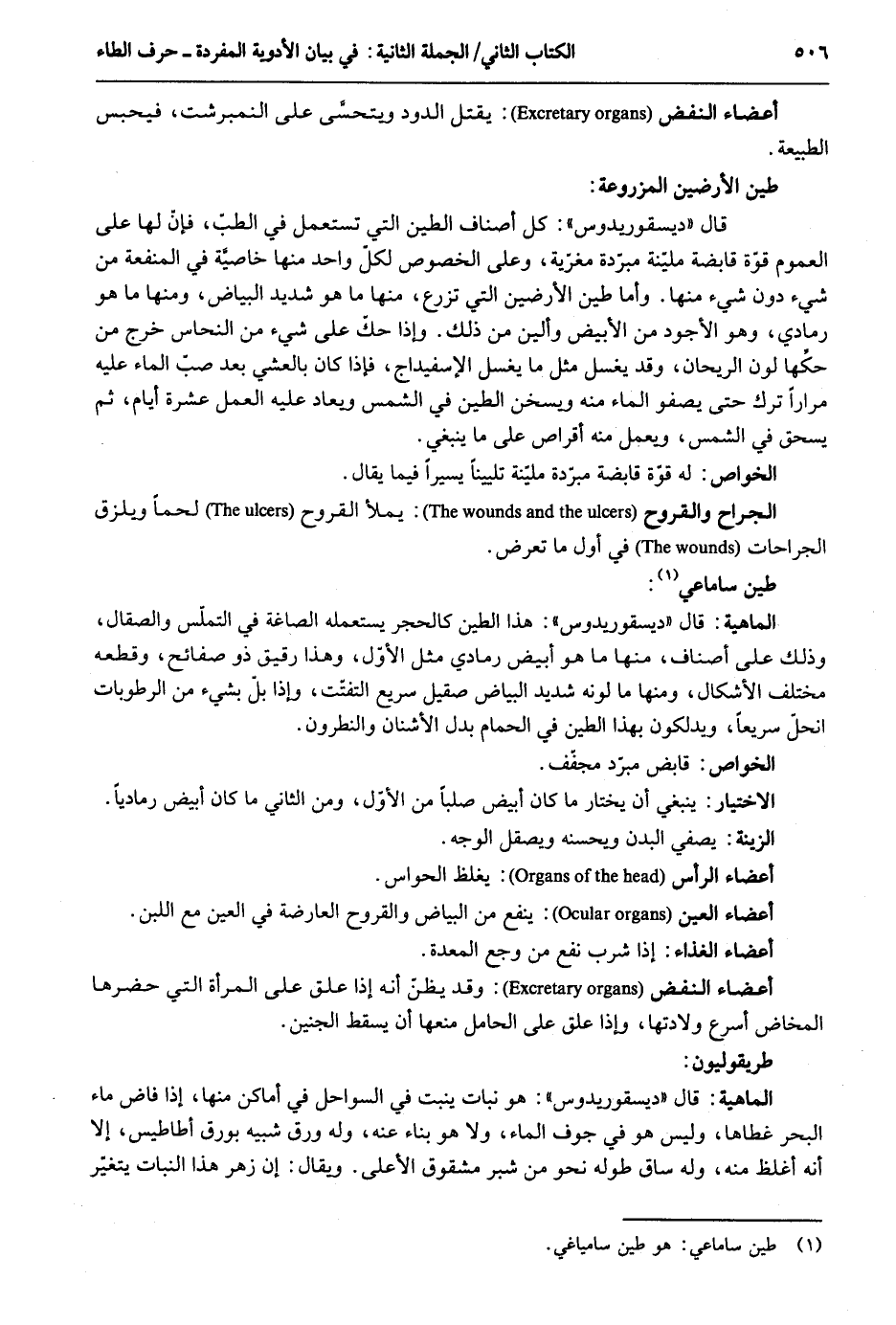 أَعْضَاء النفض: يقتل الدُّود ويتحسَى على النمبرشت فَيحْبس الطبيعة. طين الْأَرْضين المزروعة. قَالَ ديسقوريدوس: كل أَصْنَاف الطين الَّتِي تسْتَعْمل فِي الطِّبّ فَإِن لَهَا على الْعُمُوم قُوَّة قابضة ملينة مبردة مغرّية وعَلى الْخُصُوص لكل وَاحِد مِنْهَا خاصية فِي النفعة من شَيْء دون شَيْء مِنْهَا. وَأما طين الْأَرْضين الَّتِي تزرع مِنْهَا مَا هُوَ شَدِيد الْبيَاض وَمِنْهَا مَا هُوَ رمادي وَهُوَ الأجود من الْأَبْيَض وألين من ذَلِك. وَإِذا حك على شَيْء من النّحاس خرج من حكها لون الريحان وَقد يغسل مثل مَا يغسل الإسفيداج فَإِذا كَانَ بالْعَشي بعد صب المَاء عَلَيْهِ مرَارًا ترك حَتَّى يصفو المَاء مِنْهُ ويسخن الطين فِي الشَّمْس ويعاد عَلَيْهِ الْعَمَل عشرَة أَيَّام ثمَّ يسحق فِي الشَّمْس وَيعْمل مِنْهُ أَقْرَاص على مَا يَنْبَغِي. الْخَواص: لَهُ قُوَّة قابضة مبردة ملينة تَلْيِينًا يَسِيرا فِيمَا يُقَال. الْجراح والقروح: يمْلَأ القروح دَمًا وَيلْزق الْجِرَاحَات فِي أول مَا تعرض. الْمَاهِيّة: قَالَ ديسقوريدوس: هَذَا الطين كالحجر يَسْتَعْمِلهُ الصاغة فِي التملس والصقال وَذَلِكَ على أَصْنَاف مِنْهَا مَا هُوَ أَبيض رمادي مثل الأول وَهَذَا رَقِيق ذُو صَفَائِح وقطعه مُخْتَلف الأشكال وَمِنْهَا مَا لَونه شَدِيد الْبيَاض صقيل سريع التفتت وَإِذا بل بِشَيْء من الرطوبات انحل سَرِيعا ويدلكون بِهَذَا الطين فِي الْحمام بدل الأشنان والنطرون. الْخَواص: قَابض مبرد مجفف. الِاخْتِيَار: يَنْبَغِي أَن يخْتَار مَا كَانَ أَبيض صلباً من الأول وَمن الثَّانِي مَا كَانَ أَبيض رمادياً. الزِّينَة: يصفي الْبدن ويحسنه ويصقل الْوَجْه. أَعْضَاء الرَّأْس: يغلظ الْحَواس. أَعْضَاء الْعين: ينفع من الْبيَاض والقروح الْعَارِضَة فِي الْعين مَعَ اللَّبن. أَعْضَاء الْغذَاء: إِذا شرب نفع من وجع الْمعدة. أَعْضَاء النفض: وَقد يظنّ أَنه إِذا علق عَليّ الْمَرْأَة الَّتِي حضرها الْمَخَاض أسْرع وِلَادَتهَا وَإِذا علق على الْحَامِل منعهَا أَن يسْقط الْجَنِين. طريقوليون. الْمَاهِيّة: قَالَ ديسقوريدوس: هُوَ نَبَات ينْبت فِي السواحل فِي أَمَاكِن مِنْهَا إِذا فاض مَاء الْبَحْر غطاها وَلَيْسَ هُوَ فِي جَوف المَاء وَلَا هُوَ بِنَاء عَنهُ وَله ورق شَبيه بورق أطاطيس إِلَّا أَنه أغْلظ مِنْهُ وَله سَاق طوله نَحْو من شبر مشقوق الْأَعْلَى. وَيُقَال: إِن زهر هَذَا النَّبَات يتَغَيَّر