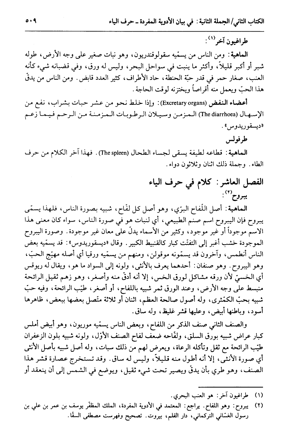 طراغيون آخر. الْمَاهِيّة: وَمن النَّاس من يُسَمِّيه سقولوقندريون وَهُوَ نَبَات صَغِير على وَجه الأَرْض طوله شبر أَو أكبر قَلِيلا وَأكْثر مَا ينْبت فِي سواحل الْبَحْر وَلَيْسَ لَهُ ورق وفى قضبانه شَيْء كَأَنَّهُ الْعِنَب صغَار حمر فِي قدر حَبَّة الْحِنْطَة حاد الْأَطْرَاف كثير الْعدَد قابضْ وَمن النَّاس من يدق هَذَا الْحبّ وَيعْمل مِنْهُ أقراصاً ويختزنه لوقت الْحَاجة. أَعْضَاء النفض: وَإِذا خلط نَحْو من عشر حبات بشراب نفع من الإسهال المزمن وسيلان الرطوبات المزمنة من الرَّحِم فِيمَا زعم ديسقوريدوس. طرفولس. الْمَاهِيّة: قطاعه لَطِيفَة يُسمى لجساء الطحال. فَهَذَا آخر الْكَلَام من حرف الطَّاء. وَجُمْلَة ذَلِك اثْنَان وَثَلَاثُونَ دَوَاء. الْفَصْل الْعَاشِر حرف الْيَاء ببروح. الْمَاهِيّة: أصل اللفاح الْبري وَهُوَ أصل كل لفاح شَبيه بِصُورَة النَّاس فَلهَذَا يُسمى يبروح فَإِن اليبروح اسْم صنم الطبيعي أَي لنبات هُوَ فِي صُورَة النَّاس سَوَاء كَانَ معنى هَذَا الإسم مَوْجُودا أَو غير مَوْجُود وَكثير من الْأَسْمَاء يدل على معَان غير مَوْجُودَة. وَصُورَة اليبروح الْمَوْجُودَة خشب أغبر إِلَى التفتت كبار كالقنبيط الْكَبِير. وَقَالَ ديسقوريدوس: قد يُسَمِّيه بعض النَّاس أنطمس وَآخَرُونَ قد يسمونه موقولن وَمِنْهُم من يسمّيه ورقيا أَي أَصله مهيج الْحبّ وَهُوَ اليبروح. وَهُوَ صنفان: أَحدهمَا يعرف بِالْأُنْثَى ولونه إِلَى السوَاد مَا هُوَ وَيُقَال لَهُ ريوقس أَي الخسي لِأَن ورقه مشاكل لورق الخس إِلَّا أَنه أدق مِنْهُ وأصغر وَهُوَ زهم ثقيل الرَّائِحَة منبسط على وَجه الأَرْض وَعند الْوَرق ثَمَر شَبيه باللفاح أَو أَصْغَر طيب الرَّائِحَة وَفِيه حبّ شَبيه بحب الكمثري وَله أصُول صَالِحَة الْعظم اثْنَان أَو ثَلَاثَة مُتَّصِل بَعْضهَا بِبَعْض ظَاهرهَا أسود وباطنها أَبيض وَعَلَيْهَا قشر غليظ وَله سَاق. والصنف الثَّانِي صنف الذّكر من اللفاح وَبَعض النَّاس يسمّيه موريون وَهُوَ أَبيض أملس كبار عراض شَبيه بورق السلق ولقاحه ضعف لفاح الصِّنْف الأول ولونه شَبيه بلون الزَّعْفَرَان طيب الرَّائِحَة مَعَ ثفل وتأكله الرُّعَاة ويعرض لَهُم من ذَلِك سبات وَله أصل شَبيه بِأَصْل الْأُنْثَى أَي صُورَة الْأُنْثَى إِلَّا أَنه أطول مِنْهُ قَلِيلا وَلَيْسَ لَهُ سَاق. وَقد تستخرج عصارة قشر هَذَا الصِّنْف وَهُوَ طري بِأَن يدق وَيصير تَحت شَيْء ثقيل وَيُوضَع فِي الشَّمْس إِلَى أَن ينْعَقد أَو