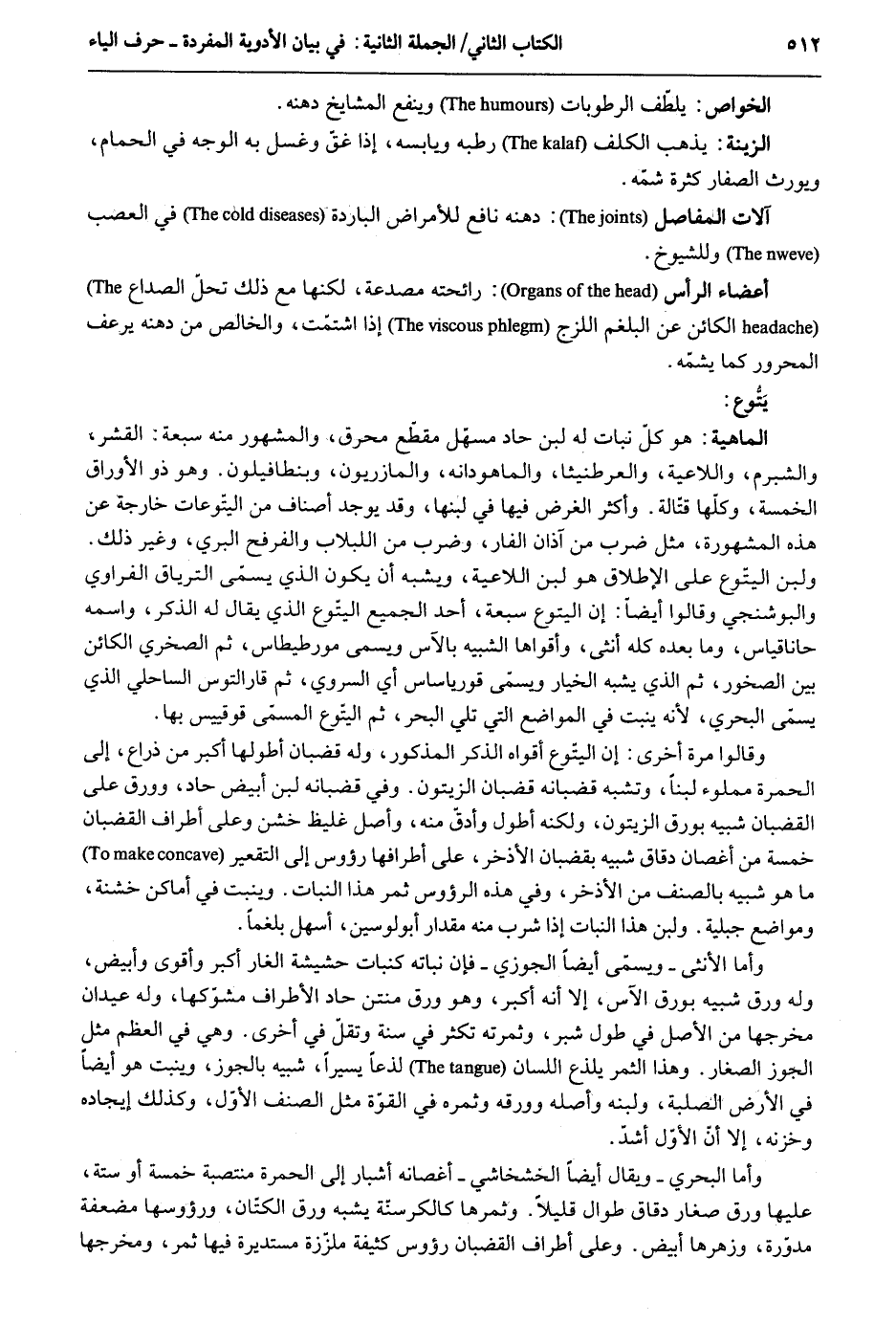 الْخَواص: يلطف الرطوبات وينفع الْمَشَايِخ دهنه. الزِّينَة: يذهب الكلف رطبه ويابسه إِذا غق وَغسل بِهِ الْوَجْه فِي الْحمام وَيُورث لصفار كَثْرَة شمه. آلَات المفاصل: دهنه نَافِع للأمراض الْبَارِدَة فِي العصب وللشيوخ. أَعْضَاء الرَّأْس: رَائِحَته مصدعة لَكِنَّهَا مَعَ ذَلِك تحل الصداع الْكَائِن عَن البلغم اللزج إِذا اشْتقت والخالص من دهنه يرعف المحرور كَمَا يشمه. يتوع. الْمَاهِيّة: هُوَ كل نَبَات لَهُ لبن حاد مسهل مقطع محرق وَالْمَشْهُور مِنْهُ سَبْعَة: القشر والشبرم واللاعية والعرطنيثا والماهودانه والمازريون وبنا طفيلون. وَهُوَ ذُو الأوراق الْخَمْسَة وَكلهَا قتالة. وَأكْثر الْغَرَض فِيهَا فِي لَبنهَا وَقد يُوجد أَصْنَاف من اليتوعات خَارِجَة عَن هَذِه الْمَشْهُورَة مثل ضرب من آذان الفار وَضرب من اللبلاب والفرفح الْبري وَغير ذَلِك. وَلبن اليتوع على الْإِطْلَاق هُوَ لبن اللاعية وَيُشبه أَن يكون الَّذِي يسمّى الترياق الفراوي والبوشنجي وَقَالُوا أَيْضا: إِن اليتوع سَبْعَة أحد الْجَمِيع اليتوع الَّذِي يُقَال لَهُ الذّكر واسْمه حاناقيس وَمَا بعده كُله أُنْثَى وأقواها الشبيه بالآس وَيُسمى مورطيطاس ثمَّ الصخري الْكَائِن بَين الصخور ثمَّ الَّذِي يشبه الْخِيَار وَيُسمى قورياساس أَي السروي ثمَّ قارالتوس الساحلي الَّذِي يُسمى البحري لِأَنَّهُ ينْبت فِي الْمَوَاضِع الَّتِي تلِي الْبَحْر ثمَّ اليتوع الْمُسَمّى قوقييس بهَا. وَقَالُوا مرّة آخرى: إِن اليتوع أقواه الذّكر الْمَذْكُور وَله قضبان أطولها أكبر من ذِرَاع إِلَى الْحمرَة مَمْلُوء لَبَنًا وتشبه قضبانه قضبان الزَّيْتُون. وَفِي قضبانه لبن أَبيض حاد وورق على القضبان شَبيه بورق الزَّيْتُون وَلكنه أطول وأدق مِنْهُ وأصل غليظ خشن وعَلى أَطْرَاف القضبان خَمْسَة من أَغْصَان دقاق شَبيه بقضبان الأذخر على أطرافها رُؤُوس إِلَى التقعير مَا هُوَ شَبيه بالصنف من الأذخر وَفِي هَذِه الرؤوس ثَمَر هَذَا النَّبَات. وينبت فِي أَمَاكِن خشنة ومواضع جبلية. وَلبن هَذَا النَّبَات إِذا شرب مِنْهُ مِقْدَار أَبُو لوسين أسهل بلغماً. وَأما الْأُنْثَى وَيُسمى أَيْضا الْجَوْزِيّ فَإِن نَبَاته كنبات حشيشة الْغَار أكبر وَأقوى وأبيض وَله ورق شَبيه بورق الآس إِلَّا أَنه أكبر وَهُوَ ورق منتن حاد الْأَطْرَاف مشوكها وَله عيدَان مخرجها من الأَصْل فِي طول شبر وثمرته تكْثر فِي سنة وتقل فِي آخرى. وَهِي فِي الْعظم مثل الْجَوْز الصغار وَهَذَا الثَّمر يلذع اللِّسَان يَسِيرا شييه بالجوز وينبت هُوَ أَيْضا فِي الأَرْض الصلبة ولبنه وَأَصله وورقه وثمره قي الْقُوَّة مثل الصِّنْف الأول وَكَذَلِكَ إيجاده وخزنه إِلَّا أَن الأول أَشد. وَأما البحري وَيُقَال أَيْضا الخشخاشي أغصانه أشبار إِلَى الْحمرَة متتصبة خَمْسَة أَو سِتَّة عَلَيْهَا ورق صغَار دقاق طوال قَلِيلا وَثَمَرهَا كالكرسنة يشبه ورق الْكَتَّان ورؤوسها مضعفة مُدَوَّرَة وزهرها أَبيض. وعَلى أَطْرَاف القضبان رُؤُوس كثيقة ملززة مستديرة فِيهَا ثَمَر ومخرجها