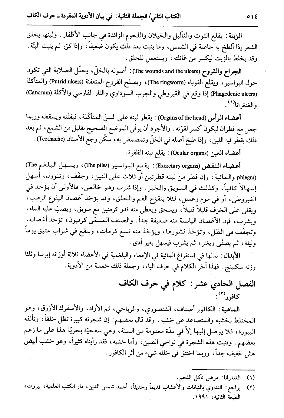 الزِّينَة: يقْلع التوث والثآليل والخيلان واللحوم الزَّائِدَة فِي جَانب الْأَظْفَار. ولبنها يحلق الشّعْر إِذا ألطخ بِهِ خَاصَّة فِي الشَّمْس وَمَا ينْبت بعد ذَلِك يكون ضَعِيفا وَإِذا كرر لم ينْبت الْبَتَّةَ. وَقد يخلط بالزيت ليكسر من غائلته وَيسْتَعْمل للحلق. الْجراح والقروح: أُصُوله بالخل يحلل الصلابة الَّتِي تكون حول البواسير ويقلع القوباء وَيصْلح القروح المتعفنة والمتآكلة إِذا وَقع فِي القيروطي والجرب السوداوي وَالنَّار الْفَارِسِي والآكلة والغنغرانا. أَعْضَاء الرَّأْس: يقطر لبنه على السن المتأكلة فيفتته ويسقطه وَرُبمَا جعل مَعَ قطران ليَكُون أكسر لقُوته. والأجود أَن يوقّى الْموضع الصحج بِقَلِيل من الشمع ثمَّ بعد ذَلِك يقطر فِيهِ اللَّبن وَإِذا طبخ أَصله فِي الْخلّ وتمضمض بِهِ سكن وجع الْأَسْنَان. أَعْضَاء الْعين: يقْلع لبنه الظفرة. أَعْضَاء النفض: يقْلع البواسير ويسهل البلغم والمائية وَإِن قطر من لبنه قطرتين أَو ثَلَاثَة على التِّين وجفّف وتنوول أسهل إسهالاً كَافِيا وَكَذَلِكَ فِي السويق وَالْخبْز. وَإِذا شرب وَهُوَ خَالص فَالْأولى أَن يُؤْخَذ فِي القيروطي أَو فِي موم وَعسل لِئَلَّا يتقرّح الْفَم وَالْحلق وَقد يُؤْخَذ أَغْصَان اليتّوع الرطب ويقلى على الخزف قَلِيلا قَلِيلا ويسحق وَيُعْطِي مِنْهُ قدر كرمتين مَعَ سويق وَيصب عَلَيْهِ المَاء وَيشْرب فَإِن الأغصان الْيَابِسَة ضَعِيفَة جدا. والصنف الْمُسَمّى كرفيون تُؤْخَذ أغصانه وتجفف فِي الظل وَيُؤْخَذ قشورها وَيُؤْخَذ مِنْهُ تسع كرمات وينقع فِي شراب عَتيق يَوْمًا وَلَيْلَة ثمَّ يصفى ويغتر ثمَّ يشرب فيسهل بِغَيْر أَذَى. الأبدال: بدلهَا فِي استفراغ المائية فِي الأمعاء والبلغمية فِي الْأَعْضَاء ثَلَاثَة أوزانه إيرسا وَثلثا وَزنه سكبينج. فَهَذَا آخر الْكَلَام فِي حرف الْيَاء وَجُمْلَة ذَلِك خَمْسَة من الْأَدْوِيَة. الْفَصْل الْحَادِي عشر حرف الْكَاف كافور. الْمَاهِيّة: الكافور أَصْنَاف القنصوري والرباحي ثمَّ الأزاد والأسفرك الْأَزْرَق وَهُوَ الْمُخْتَلط بخشبه والمتصاعد عَن خشبه. وَقد قَالَ بَعضهم: إِن شجرته كَبِيرَة تظل خلقا وتألفه الببورة فَلَا يُوصل إِلَيْهَا إِلَّا فِي مدّة مَعْلُومَة من السّنة وَهِي سفحية بحريّة هَذَا على مَا زعم بَعضهم. وتنبت هَذِه الشَّجَرَة فِي نواحي الصين وَأما خشبه فقد رَأَيْنَاهُ كثيرا وَهَو خشب أَبيض هش خَفِيف جدا وَرُبمَا اختنق فِي خلله شَيْء من أثر الكافور.