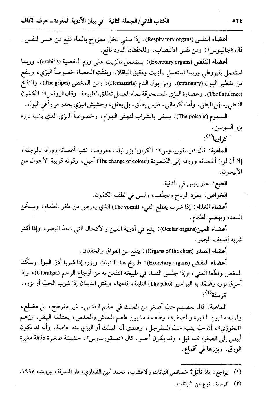 أَعْضَاء النَّفس: إِذا سقِِي بخل ممزوج بِالْمَاءِ نفع من عسر النَّفس. قَالَ جالينوس: وَمن نفس الانتصاب وللخفقان الْبَارِد نفع. أَعْضَاء النفض: يسْتَعْمل بالزيت على ورم الخصية وَرُبمَا اسْتعْمل بقيروطي وَرُبمَا اسْتعْمل بالزيت ودقيق الباقلا ويفتّت الْحَصَاة خُصُوصا الْبري وينفع من تقطير الْبَوْل وَمن بَوْل الدَّم وَمن المغص والنفخ. وعصارة الْبري المسحوقة بِمَاء الْعَسَل تطلق الطبيعة. وَقَالَ روفس: الكمّون النبطي يسهل الْبَطن وَأما الْكرْمَانِي فَلَيْسَ يُطلق بل يعقل وحشيش الْبري يحدر مرَارًا فِي الْبَوْل. السمُوم: يُسمى بِالشرابِ لنهش الْهَوَام وخصوصاً الْبري الَّذِي يشه بزره بزر السوسن. كراويا. الْمَاهِيّة: قَالَ ديسقوريدوس: الكراويا بزر نَبَات مَعْرُوف تشبه أغصانه وورقه بالرجلة إِلَّا أَن الطَّبْع: حَار يَابِس فِي الثَّانِيَة. الْخَواص: يطرد الرِّيَاح ويجفّف وَلَيْسَ فِي لطف الكمون. أَعْضَاء الْغذَاء: إِذا شرب يقطع الْقَيْء الَّتِي يعرض من طفو الطَّعَام ويسخّن الْمعدة ويهضم الطَّعَام. أَعْضَاء الْعين: يَقع فِي أدوية الْعين والأكحال الَّتِي تحد الْمصر وَإِذا أَكثر شربه أَضْعَف الْبَصَر. أَعْضَاء الصَّدْر: ينفع من الفواق والخفقان. أَعْضَاء النفض: طبيخ هَذَا النَّبَات وبزره إِذا شربا أدرا الْبَوْل وسكنّا المغص وقطعا الْمَنِيّ وَإِذا جلس النِّسَاء فِي طبيخه انتفعن بِهِ من أوجاع الرَّحِم وَإِذا أحرق بزره وضمد بِهِ البواسير النابتة قلعهَا وَيقتل الديدان إِذا شرب الْحبّ أَو بزره. كرسنة. الْمَاهِيّة: قَالَ بَعضهم حب أَصْغَر من الْملك فِي عظم العدس غير مفرطح بل مضلع ولونه مَا بَين الغبرة والصفرة وطعمه مَا بَين طعم الماش والعدس يعتلفه الْبَقر. وَزعم الخوزي أَن حبه يشبه حب السفرجل وَعِنْدِي أَنه الْملك أَو الْبري مِنْهُ خَاصَّة وَأَنه قد يكون أَبيض إِلَى الصُّفْرَة كَمَا قيل وَقد يكون أَحْمَر. قَالَ ديسقوريدوس: حشيشة صَغِيرَة دقيقة مغبرة الْوَرق وبزرها فِي
