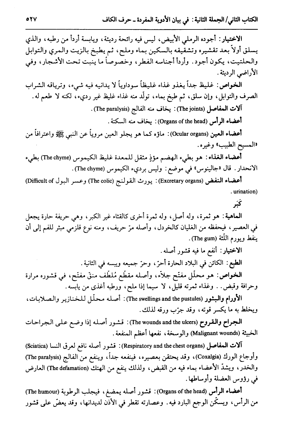 الِاخْتِيَار: أجوده الرَّمْلِيّ الْأَبْيَض لَيْسَ فِيهِ رَائِحَة رَدِيئَة ويابسه أردأ من رطبه وَالَّذِي يسلق أَولا بعد تقشيره وتشقيقه بالسكين بِمَاء وملح ثمَّ يطْبخ بالزيت والمري والتوابل والحلتيت يكون أَجود. وأردأ أجناسه الْفطر وخصوصاً مَا ينْبت تَحت الْأَشْجَار وَفِي الْأَرَاضِي الرَّديئَة. الْخَواص: غليظ جدا يغذو غذَاء غليظاً سوداوياً لَا يدانيه فِيهِ شَيْء وترياقه الشَّرَاب الصّرْف والتوابل وَإِن سلق ثمَّ طبخ بِمَاء تولد مِنْهُ غذَاء غليظ غير رَدِيء لكنه لَا طعم لَهُ. آلَات المفاصل: يخَاف مِنْهُ الفالج. أَعْضَاء الرَّأْس: يخَاف مِنْهُ السكتة. أَعْضَاء الْعين: مَاؤُهُ كَمَا هُوَ يجلو الْعين مروياً عَن النَّبِي صلى الله عَلَيْهِ وَسلم واعترافاً من الْمَسِيح أَعْضَاء الْغذَاء: هُوَ بطيء الهضم مؤذٍ مثقل للمعدة غليظ الكيموس بطيء الانحدار. قَالَ جالينوس فِي مَوضِع: وَلَيْسَ برديء الكيموس. أَعْضَاء النفض: يُورث القولنج وعسر الْبَوْل. كَبَر. الْمَاهِيّة: هُوَ ثَمَرَة وَله أصل وَله ثَمَرَة آخرى كالقثاء غير الْكبر وَهِي حريفة حارة يَجْعَل فِي الْعصير فيحفظه من الغليان كالخردل وَأَصله مر حريف وَمِنْه نوع قلزمي مبثر للفم إِلَى أَن ينفط ويورم اللّثة. الِاخْتِيَار: أَنْفَع مَا فِيهِ قشور أَصله. الطَّبْع: الْكَائِن فِي الْبِلَاد الحارة أحر وحرّ جَمِيعه ويبسه فِي الثَّانِيَة. الْخَواص: هُوَ مُحَلل مفتح جلاء وَأَصله مقطع مُلطّف منقّ مفتح فِي قشوره مرَارَة وحرافة وَقبض وغذاء ثَمَرَته قَلِيل لَا سِيمَا إِذا ملح ورطبه أغذى من يابسه. الأورام والبثور: أَصله محلّل للخنازير والصلابات ويخلط بِهِ مَا يكسر قوته وَقد جرّب ورقه لذَلِك. الْجراح والقروح: قشور أَصله إِذا وضع على الْجِرَاحَات الخبيثة والوسخة نَفعهَا أعظم الْمَنْفَعَة. آلَات المفاصل: قشور أَصله نَافِع لعرق النسا وأوجاع الورك وَقد يحتقن بعصيره فينفعه جدا وينفع من الفالج وَالْخمر ويشدّ الْأَعْضَاء بِمَاء فِيهِ من الْقَبْض وَلذَلِك ينفع من الهتك الْعَارِض فِي رُؤُوس العضلة وأوساطها. أَعْضَاء الرَّأْس: قشور أَصله يمضغ فيجلب الرُّطُوبَة من الرَّأْس ويسكن الوجع الْبَارِد فِيهِ. وعصارته تقطر فِي الْأذن لديدانها وَقد يعَض على قشور