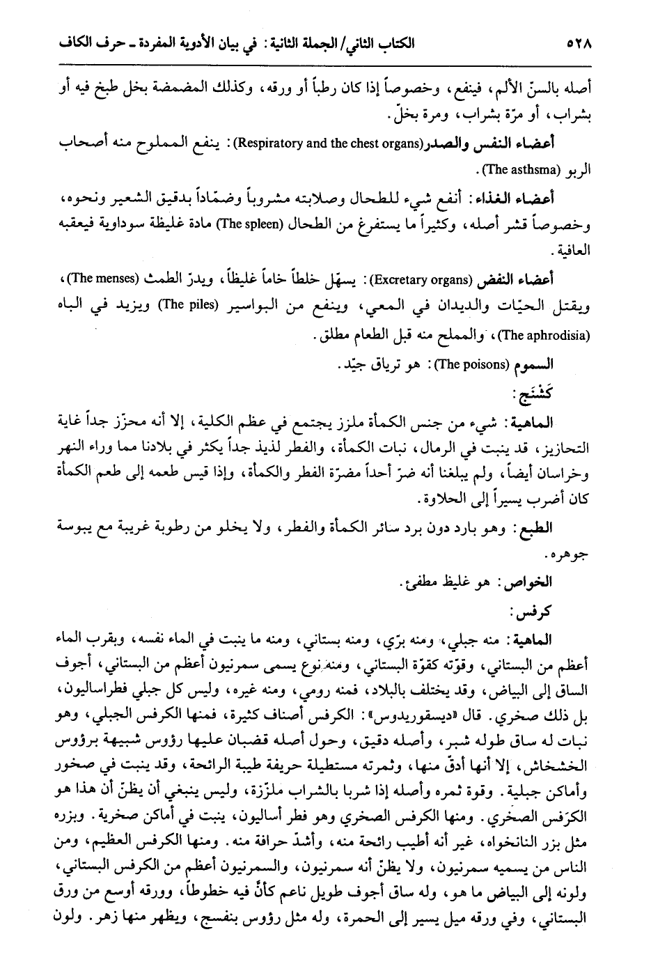 أَصله بالسنّ الْأَلَم فينفع وخصوصاً إِذا كَانَ رطبا أَو ورقه وَكَذَلِكَ الْمَضْمَضَة بخل طبخ فِيهِ أَو بشراب أَو مرّة بشراب وَمرَّة بخل. أَعْضَاء النَّفس والصدر: ينفع المملوح مِنْهُ أَصْحَاب الربو. أَعْضَاء الْغذَاء: أَنْفَع شَيْء للطحال وصلابته مشروباً وضماداً بدقيق الشّعير وَنَحْوه وخصوصاً قشر أَصله وَكَثِيرًا مَا يستفرغ من الطحال مَادَّة غَلِيظَة سوداوية فيعقبه الْعَافِيَة. أَعْضَاء النفض: يسهّل خلطاً خاماً غليظاً ويدر الطمث وَيقتل الْحَيَّات والديدان فِي المعي وينفع من البواسير وَيزِيد فِي الباه والمملح مِنْهُ قبل الطَّعَام مُطلق. السمُوم: هُوَ ترياق جيد. كَشنج. الْمَاهِيّة: شَيْء من جنس الكمأة ملزز يجْتَمع فِي عظم الْكُلية إِلَّا أَنه محزّز جدا غَايَة التحازيز قد ينْبت فِي الرمال نَبَات الكمأة وَالْفطر لذيذ جدا يكثر فِي بِلَادنَا مِمَّا وَرَاء النَّهر وخراسان أَيْضا وَلم يبلغنَا أَنه ضرّ أحدا مضرّة الْفطر والكمأة وَإِذا قيس طعمه طعم الكمأة كَانَ أضْرب يَسِيرا إِلَى الْحَلَاوَة. الطَّبْع: وَهُوَ بَارِد دون برد سَائِر الكمأة وَالْفطر وَلَا يَخْلُو من رُطُوبَة غَرِيبَة مَعَ يبوسة جوهره. الْخَواص: هُوَ غليظ مطفىء. كرفس. الْمَاهِيّة: مِنْهُ جبلي وَمِنْه بري وَمِنْه بستاني وَمِنْه مَا ينْبت فِي المَاء نَفسه وبقرب المَاء أعظم من البستاني وقوته كقوّة البستاني وَمِنْه نوع يُسمى سمرنيون أعظم البستاني أجوف السَّاق إِلَى الْبيَاض وَقد يخْتَلف بالبلاد فَمِنْهُ رومي وَمِنْه غَيره وَلَيْسَ كل جبلي فطراساليون بل ذَلِك صخري. قَالَ ديسقوريدوس: الكرفس أَصْنَاف كَثِيرَة فَمِنْهَا الكرفس الْجبلي وَهُوَ نَبَات لَهُ سَاق طوله شبر وَأَصله دَقِيق وحول أَصله قضبان عَلَيْهَا رُؤُوس شَبيهَة برؤوس الخشخاش إِلَّا أَنَّهَا أدقّ مِنْهَا وثمرته مستطيلة حريفة طيبَة الرَّائِحَة وَقد ينْبت فِي صخور وأماكن جبلية. وَقُوَّة ثمره وَأَصله إِذا شربا بِالشرابِ ملززة وَلَيْسَ يَنْبَغِي أَن يظنّ أَن هَذَا هُوَ الكرَفس الصخري. وَمِنْهَا الكرفس الصخري وَهُوَ فطر أساليون ينْبت فِي أَمَاكِن صخرية. وبزره مثل بزر النانخواه غير أَنه أطيب رَائِحَة مِنْهُ وَأَشد حرافة مِنْهُ. وَمِنْهَا الكرفس الْعَظِيم وَمن النَّاس من يُسَمِّيه سمرنيون وَلَا يظنّ أَنه سمرنيون والسمرنيون أعظم من الكرفس البستاني ولونه إِلَى الْبيَاض مَا هُوَ وَله سَاق أجوف طَوِيل ناعم كأنَ فِيهِ خُطُوطًا وورقه أوسع من ورق البستاني وَفِي ورقه ميل يسير إِلَى الْحمرَة وَله مثل رُؤُوس بنفسج وَيظْهر مِنْهَا زهر. ولون