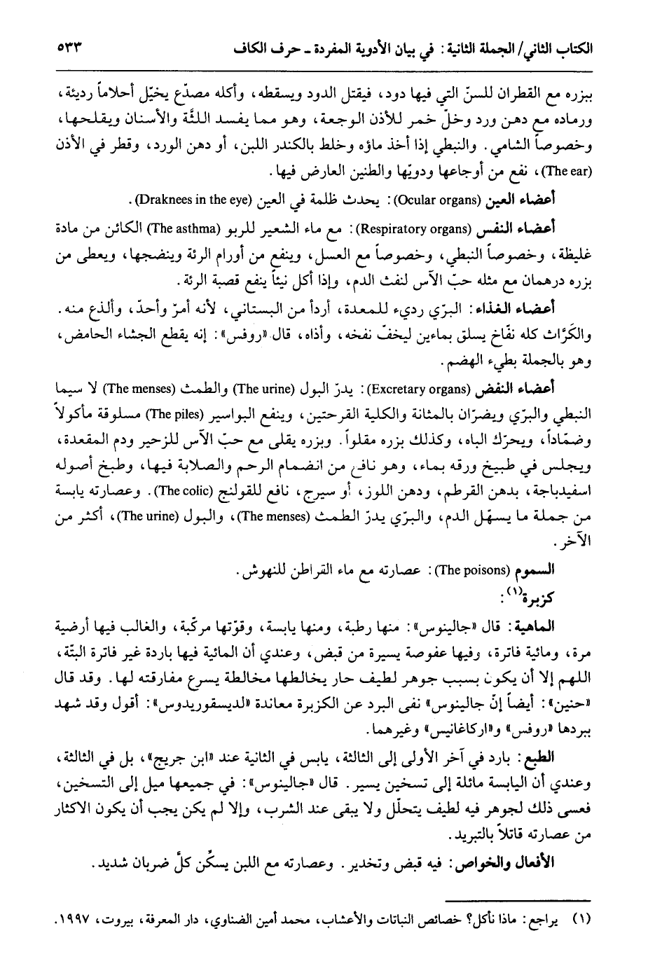 ببزره مَعَ القطران للسن الَّتِي فِيهَا دود فَيقْتل الدُّود ويسقطه وَكله مصدع يخيل أحلاماً رَدِيئَة ورماده مَعَ دهن ورد وخل خمر للأذن الوجعة وَهُوَ مِمَّا يفْسد اللثة والأسنان ويقلحها وخصوصاً الشَّامي. والنبطي إِذا أَخذ مَاؤُهُ وخلط بالكندر اللَّبن أَو دهن الْورْد وقطر فِي الْأذن نفع من أوجاعها ودويها والطنين الْعَارِض فِيهَا. أَعْضَاء الْعين: يحدث ظلمَة فِي الْعين. أَعْضَاء النَّفس: مَعَ مَاء الشّعير للربو الْكَائِن من مَادَّة غَلِيظَة وخصوصاً النبطي وخصوصاً مَعَ الْعَسَل وينفع من أورام الرئة وينضجها وَيُعْطِي من بزره دِرْهَمَانِ مَعَ مثله حبّ الآس لنفث الدَّم وَإِذا أكل نيئاً ينفع قَصَبَة الرئة. أَعْضَاء الْغذَاء: الْبري رَدِيء للمعدة أردأ من البستاني لِأَنَّهُ أَمر وَأحد وألذع مِنْهُ والكرَاث كُله نفاخ يسلق بماءين ليخف نفخه وأذاه قَالَ روفس: إِنَّه يقطع الجشاء الحامض وَهُوَ بالجمله بطيء الهضم. أَعْضَاء النفض: يدر الْبَوْل والطمث لَا سِيمَا النبطي والبري ويضران بالمثانة والكلية القرحتين وينفع البواسير مسلوقة مَأْكُولا وضماداً ويحرك الباه وَكَذَلِكَ بزره مقلواً. وبزره يقلى مَعَ حب الآس للزحير وَدم المقعدة وَيجْلس قي طبيخ ورقه بِمَاء وَهُوَ نَافِع من انضمام الرَّحِم والصلابة فِيهَا وطبخ أُصُوله اسفيدباجة بدهن القرطم ودهن اللوز أَو سيرج نَافِع للقولنج. وعصارته يابسة من جملَة مَا يسهل الدَّم والبري يدر الطمث وَالْبَوْل أَكثر من الآخر. السمُوم: عصارته مَعَ مَاء القراطن للنهوش. كزبرة. الْمَاهِيّة: قَالَ جالينوس: مِنْهَا رطبَة وَمِنْهَا يابسة وقوتها مركبة وَالْغَالِب فِيهَا أرضية مرّة ومائية فاترة وفيهَا عفوصة يسيرَة من قبض وَعِنْدِي أَن المائية فِيهَا بَارِدَة غير فاترة البتّة اللَّهُمَّ إِلَّا أَن يكون بِسَبَب جَوْهَر لطيف حَار يخالطها مُخَالطَة يسْرع مُفَارقَته لَهَا. وَقد قَالَ حنين أَيْضا: أنّ جالينوس نفى الْبرد عَن الكزبرة معاندة لديسقوريدوس: أَقُول وَقد شهد ببردها روفس الطَّبْع: بَارِد فِي آخر الأولى إِلَى الثَّالِثَة يَابِس فِي الثَّانِيَة عِنْد ابْن جريج بل فِي الثَّالِثَة وَعِنْدِي أَن الْيَابِسَة مائلة إِلَى تسخين يسير. قَالَ جالينوس: فِي جَمِيعهَا ميل إِلَى التسخين فَعَسَى ذَلِك لجوهر فِيهِ لطيف يتحلّل وَلَا يبْقى عِنْد الشّرْب وَإِلَّا لم يكن يجب أَن يكون الْإِكْثَار من عصارته قَاتلا بالتبريد. الْأَفْعَال والخواص: فِيهِ قبض وتخدير. وعصارته مَعَ اللَّبن يسكِّن كل ضَرْبَان شَدِيد.