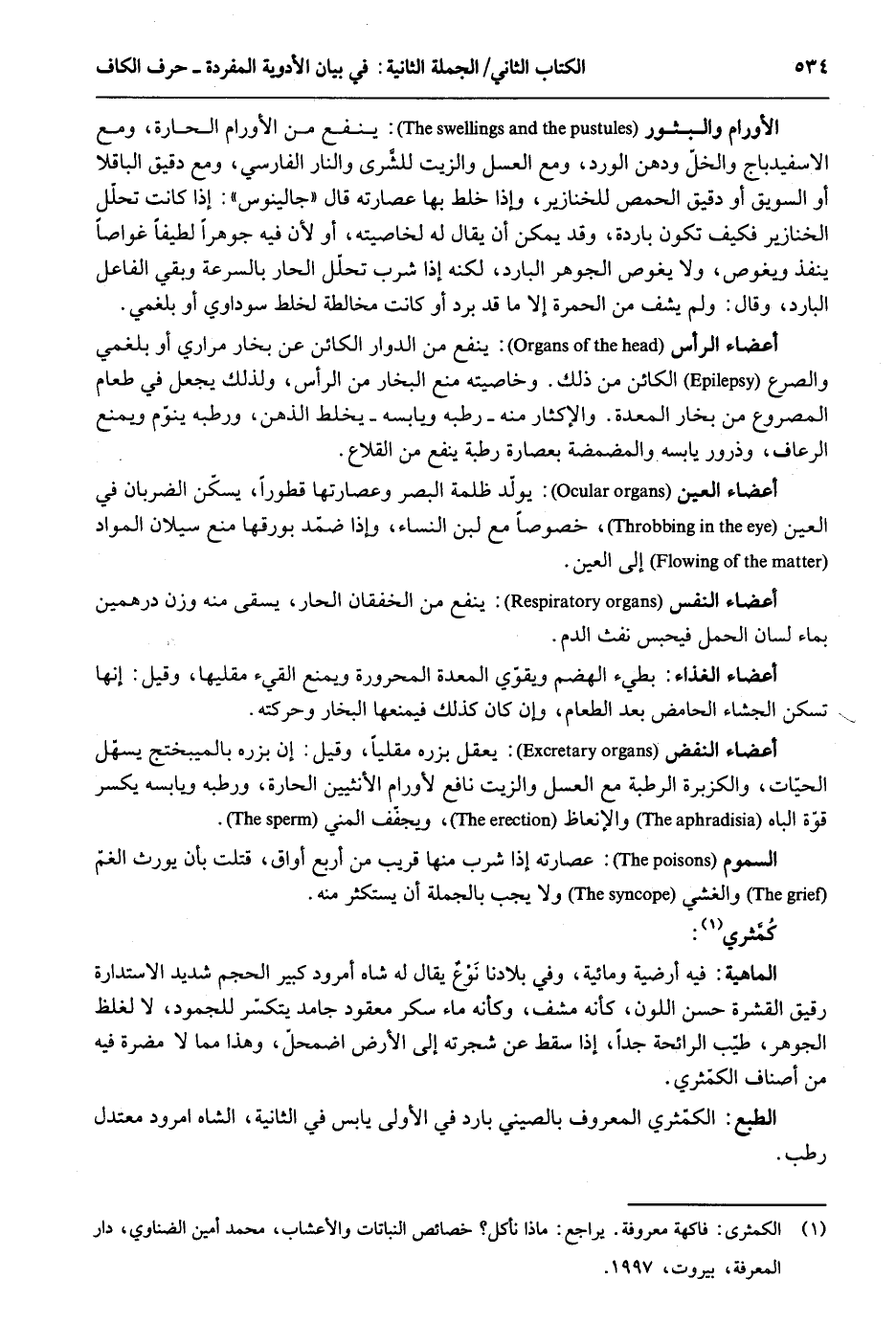 الأورام والبثور: ينفع من الأورام الحارة وَمَعَ الاسفيدباج والخل ودهن الْورْد وَمَعَ الْعَسَل وَالزَّيْت للشَرى وَالنَّار الْفَارِسِي وَمَعَ دَقِيق الباقلا أَو السويق أَو دَقِيق الحمص للخنازير وَإِذا خلط بهَا عصارته قَالَ جالينوس: إِذا كَانَت تحلل الْخَنَازِير فَكيف تكون بَارِدَة وَقد يُمكن أَن يُقَال لَهُ لخاصيته أَو لِأَن فِيهِ جوهراً لطيفاً غواصاً ينفذ ويغوص وَلَا يغوص الْجَوْهَر الْبَارِد لكنه إِذا شرب تحلّل الْحَار بالسرعة وَبَقِي الْفَاعِل الْبَارِد وَقَالَ: وَلم يشف من الْحمرَة إِلَّا مَا قد برد أوكانت مُخَالطَة لخلط سوداوي أَو بلغمي. أَعْضَاء الرَّأْس: ينفع من الدوار الْكَائِن عَن بخار مراري أَو بلغمي والصرع الْكَائِن من ذَلِك. وخاصيته منع البخار من الرَّأْس وَلذَلِك يَجْعَل فِي طَعَام المصروع من بخار الْمعدة. والإكثار مِنْهُ رطبه ويابسه يخلط الذِّهْن ورطبه ينوم وَيمْنَع الرعاف وذرور يابسه والمضمضة بعصارة رطبَة أَعْضَاء الْعين: يولّد ظلمَة الْبَصَر وعصارتها قطوراً يسكن الضربان فِي الْعين خصوصاٌ مَعَ لبن النِّسَاء وَإِذا ضمد بورقها منع سيلان الْموَاد إِلَى الْعين. أعضاه النَّفس: ينفع من الخفقان الْحَار يُسمى مِنْهُ وزن دِرْهَمَيْنِ بِمَاء لِسَان الْحمل فَيحْبس نفث الدَّم. أَعْضَاء الْغذَاء: بطيء الهضم وَيُقَوِّي الْمعدة المحرورة وَيمْنَع الْقَيْء مقليها وَقيل: إِنَّهَا تسكن الجشاء الحامض بعد الطَّعَام وَإِن كَانَ كَذَلِك فيمنعها البخار وحركته. أَعْضَاء النفض: يعقل بزره مقليأ وَقيل: إِن بزره بالميبختج يسهل الْحَيَّات والكزبرة الرّطبَة مَعَ الْعَسَل وَالزَّيْت نَافِع لأورام الْأُنْثَيَيْنِ الحارة ورطبه ويابسه يكسر قُوَّة الباه والانعاظ ويجفّف الْمَنِيّ. السمُوم: عصارته إِذا شرب مِنْهَا قريب من أَربع أَوَاقٍ قتلت بِأَن يُورث الغمّ والغشي وَلَا يجب بِالْجُمْلَةِ أَن يستكثر مِنْهُ. كمثري. الْمَاهِيّة: فِيهِ أرضية ومائية وَفِي بِلَادنَا نَوْغ يُقَال لَهُ شاه أمرود كَبِير الحجم شَدِيد الاستدارة رَقِيق القشرة حسن اللَّوْن كَأَنَّهُ مشف وَكَأَنَّهُ مَاء سكر مَعْقُود جامد يتكسّر للجمود لَا لغلظ الْجَوْهَر طيّب الرَّائِحَة جدا إِذا سقط عَن شجرته إِلَى الأَرْض اضمحل وَهَذَا مِمَّا لَا مضرَّة فِيهِ من أَصْنَاف الكمّثري. الطَّبْع: الكمثري الْمَعْرُوف بالصيني بَارِد فِي الأولى يَابِس فِي الثَّانِيَة الشاه امرود معتدل رطب.