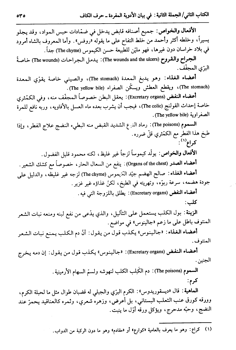 الْأَفْعَال والخواص: جَمِيع أصنافه قَابض يدْخل فِي ضمادات حبس الْموَاد وَقد يجلو يَسِيرا وخلطه أَكثر وَأحمد من خلط التفاح على مَا يَقُوله روفس. وَأما الْمَعْرُوف بالشاه أمرود فِي بِلَاد خُرَاسَان دون غَيرهَا فَهُوَ ملين للطبيعة حسن الكيموس جدا. الْجراح والقروح: يدمل الْجِرَاحَات خَاصَّة الْبري المجفف. أَعْضَاء الْغذَاء: وَهُوَ يدبغ الْمعدة والصيني خَاصَّة يُقَوي الْمعدة وَيقطع الْعَطش ويسكن الصَّفْرَاء. أَعْضَاء النفض: يعقل الْبَطن خُصُوصا المجفّف مِنْهُ وَفِي الكمثري خَاصَّة إِحْدَاث القولنج فَيجب أَن يشرب بعده مَاء الْعَسَل بالأفاويه وربه نَافِع للمرة الصفراوية. السمُوم: رماد النَّوْع الشَّديد الْقَبْض مِنْهُ البطيء النضج علاج الْفطر وَإِذا طبخ هَذَا الْفطر مَعَ الكمّثري قل ضَرَره. كرَاع. أَعْضَاء الصَّدْر: ينفع من السعا ل الْحَار خُصُوصا مَعَ كشك الشّعير. أَعْضَاء الْغذَاء: صَالح الهضم جيد الكيموس لزجه غير غليظه وَالدَّلِيل على جودة هضمه سرعَة ربوه وتهويته فِي الطَّبْخ لكنّ غذاؤه غير غزير. أَعْضَاء النفض: يُطلق باللزوجة الَّتِي فِيهِ. كلب. الزِّينَة: بَوْل الْكَلْب يسْتَعْمل على الثآليل وَالَّذِي يدّعى من نفع لبنه وَمنعه نَبَات الشّعْر المنتوف بَاطِل على مَا زعم جالينوس فِي مَوَاضِع. أَعْضَاء الْغذَاء: جالينوس يكذب قَول من يَقُول: أنّ دم الْكَلْب يمْنَع نَبَات الشّعْر المنتوف. أَعْضَاء النَّقْض: جالينوس يكذب قَول من يَقُول: إِن دَمه يخرج الْجَنِين. السمُوم: دم الْكَلْب الْكَلْب لنهوشه ولسمّ السِّهَام الأرمينية. كرم. الْمَاهِيّة: قَالَ ديسقوريدوس: الْكَرم الْبري والجبلي لَهُ قضبان طوال مثل مَا لحبلة الْكَرم وورقه كورق عِنَب الثَّعْلَب البستاني بل أعرض وزهره شعري وثمره كالعناقيد يحمر عِنْد النضج وحبّه مدحرج ويؤكل ورقه أول مَا ينْبت.