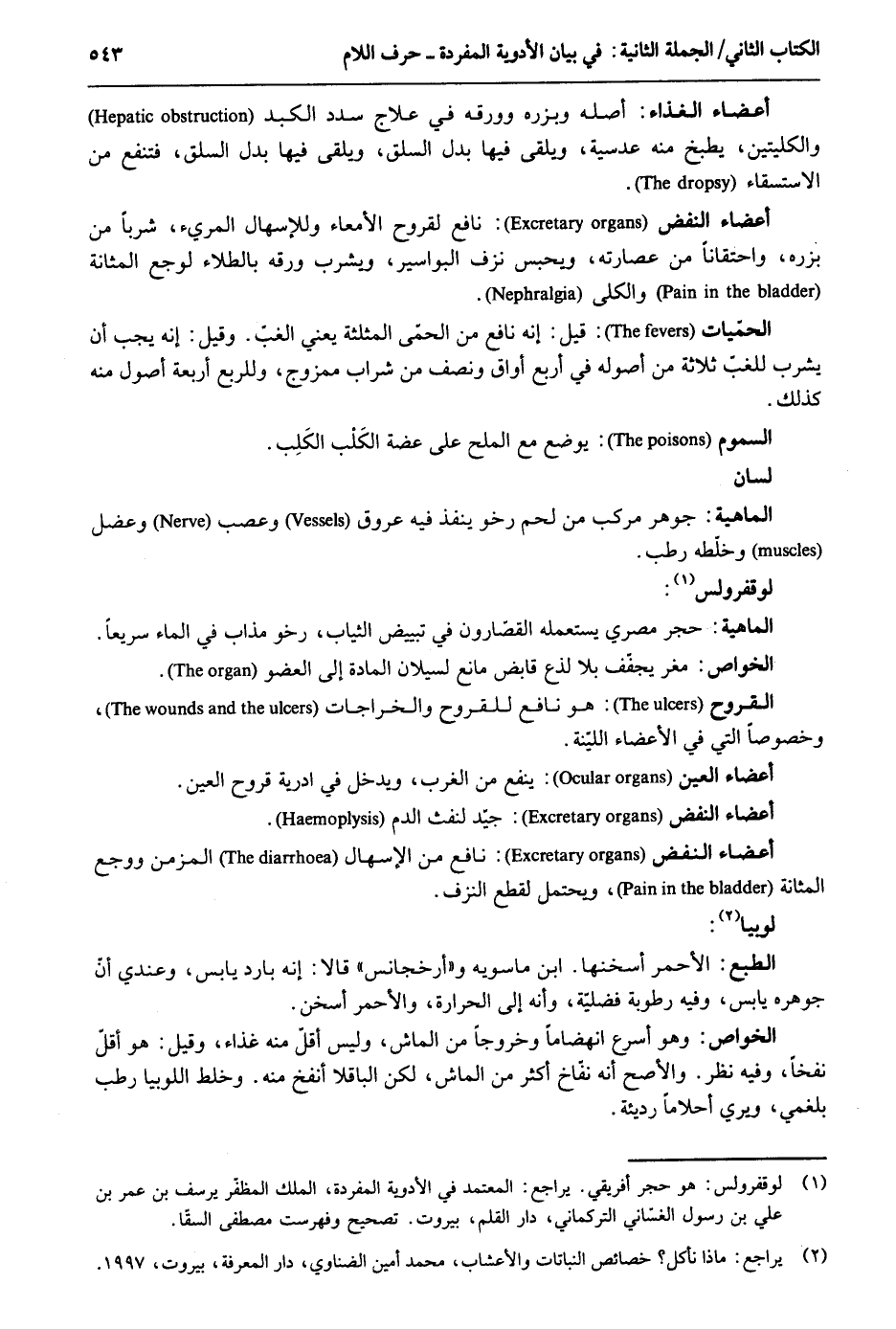أَعْضَاء الْغذَاء: أَصله وبزره وورقه فِي علاج سدد الكبد والكليتين يطْبخ مِنْهُ عدسية ويلقى فِيهَا بدل السلق ويلقى فِيهَا بدل السلق فتنفع من الاسْتِسْقَاء. أَعْضَاء النفض: نَافِع لقروح الامعاء وللإسهال المري شرباً من بزره واحتقاناً من عصارته وَيحبس نزف البواسير وَيشْرب ورقه بالطلاء لوجع المثانة والكلى. الحمّيات: قيل: إِنَّه نَافِع من الْحمى الْمُثَلَّثَة يَعْنِي الغب. وَقيل: إِنَّه يجب أَن يشرب للغب ثَلَاثَة من السمُوم: يوضع مَعَ الْملح على عضة الكَلْب الكَلِب. لِسَان. الْمَاهِيّة: جَوْهَر مركب من لحم رخو ينفذ فِيهِ عروق وَعصب وعضل وخلطه رطب. لونفرولس. الْمَاهِيّة: حجر مصري يَسْتَعْمِلهُ القصارون فِي تبييض الثِّيَاب رخو مذاب فِي المَاء سَرِيعا. الْخَواص: مغر يجفف بِلَا لذع قَابض مَانع لسيلان الْمَادَّة إِلَى الْعُضْو. القروح: هُوَ نَافِع للقروح والخراجات وخصوصاً الَّتِي فِي الْأَعْضَاء اللينة. أَعْضَاء الْعين: ينفع من الغرب وَيدخل فِي أدوية قُرُوح الْعين. أَعْضَاء النفض: جيّد لنفث الدَّم. أَعْضَاء النفض: نَافِع من الإسهال المزمن ووجع المثانة وَيحْتَمل لقطع النزف. لوبيا. الطَّبْع: الْأَحْمَر أسخنها. ابْن ماسويه وأرخجانس: إِنَّه بَارِد يَابِس وَعِنْدِي أنّ جوهره يَابِس وَفِيه رُطُوبَة فضلية وَأَنه إِلَى الْحَرَارَة والأحمر أسخن. الْخَواص: وَهُوَ أسْرع انهضاماً وخروجاً من الماش وَلَيْسَ أقل مِنْهُ غذَاء وَقيل: هُوَ أقل نفخاً وَفِيه نظر. وَالأَصَح أَنه نفاخ أَكثر من الماش لَكِن الباقلا أنفخ مِنْهُ. وخلط اللوبيا رطب بلغمي وَيرى أحلاماً رَدِيئَة.