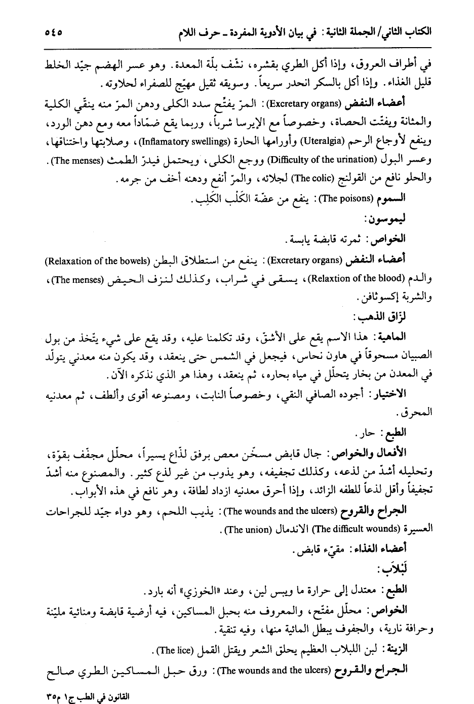 فِي أَطْرَاف الْعُرُوق وَإِذا أكل الطري بقشره نشف بلة الْمعدة. وَهُوَ عسر الهضم جيد الْخَلْط قَلِيل أَعْضَاء النفض: المر يفتح سدد الكلى ودهن المر مِنْهُ ينقي الْكُلية والمثانة ويفتت الْحَصَاة وخصوصاً مَعَ الإيرسا شرباً وَرُبمَا يَقع ضماداً مَعَه وَمَعَ دهن الْورْد وينفع لأوجاع الرَّحِم وأورامها الحارة وصلابتها واختناقها وعسر الْبَوْل ووجع الكلى وَيحْتَمل فيدر الطمث. والحلو نَافِع من القولنج لجلائه والمر أَنْفَع ودهنه أخف من جرمه. السمُوم: ينفع من عضة الكَلْب الكَلِب. ليموسون. الْخَواص: ثَمَرَته قابضة يابسة. أَعْضَاء النفض: ينفع من استطلاق الْبَطن وَالدَّم يسقى فِي شراب وَكَذَلِكَ لنزف الْحيض والشربة إكسوثافن. لزاق الذَّهَب. الْمَاهِيّة: هَذَا الإسم يَقع على الأشق وَقد تكلمنا عَلَيْهِ وَقد يَقع على شَيْء يتَّخذ من بَوْل الصّبيان مسحوقاً فِي هاون نُحَاس فَيجْعَل فِي الشَّمْس حَتَّى ينْعَقد وَقد يكون مِنْهُ معدني يتَوَلَّد فِي الْمَعْدن من بخار يتحلّل فِي مياه بحاره ثمَّ ينْعَقد وَهَذَا هُوَ الَّذِي نذكرهُ الْآن. الإختيار: أجوده الصافي النقي وخصوصاً النَّابِت ومصنوعه أقوى وألطف ثمَّ معدنيه الطَّبْع: حَار. الْأَفْعَال والخواص: جال قَابض مسخن معص بِرِفْق لذاع يَسِيرا مُحَلل مجفف بِقُوَّة وتحليله أَشد من لذعه وَكَذَلِكَ تجفيفه وَهُوَ يذوب من غير لذع كثير. والمصنوع مِنْهُ أَشد تجفيفاً وَأَقل لذعاً للطفه الزَّائِد وَإِذا أحرق معدنيه ازْدَادَ لطافة وَهُوَ نَافِع فِي هَذِه الْأَبْوَاب. الْجراح والقروح: يذيب اللَّحْم وَهُوَ دَوَاء جيد للجراحات العسيرة الِانْدِمَال. أَعْضَاء الْغذَاء: مقيء قَابض - لبلاب: الطَّبْع: معتدل إِلَى حرارة مَا ويبس لين وَعند الخوزي أَنه بَارِد. الْخَواص: مُحَلل مفتح وَالْمَعْرُوف مِنْهُ بِحَبل المسحين فِيهِ أرضية قابضة ومنائية ملينة وحرافة فارية والجفوف يبطل المائية مِنْهَا وَفِيه تنقية. الزِّينَة: لبن اللبلاب للعظيم يحلق الشعرويقتل الْقمل. الْجراح والقروح ة ورق جبل الْمِسْكِين الطري صَالح