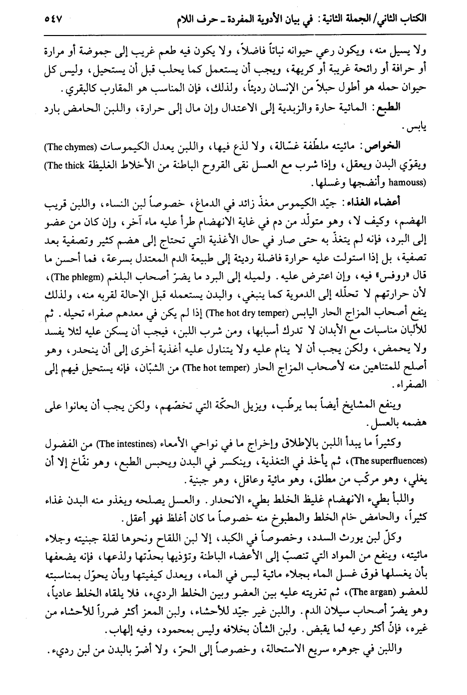 وَلَا يسيل مِنْهُ وَيكون رعي حيوانه نباتاً فَاضلا وَلَا يكون فِيهِ طعم غَرِيب إِلَى حموضة أَو مرَارَة أَو حرافة أَو رَائِحَة غَرِيبَة أَو كريهة وَيجب أَن يسْتَعْمل كَمَا يحلب قبل أَن يَسْتَحِيل وَلَيْسَ كل حَيَوَان حمله هُوَ أطول حبلاً من الْإِنْسَان رديئاً وَلذَلِك فَإِن الْمُنَاسب هُوَ المقارب كالبقري. الطَّبْع: المائية حارة والزبدية إِلَى الِاعْتِدَال وَإِن مَال إِلَى حرارة وَاللَّبن الحامض بَارِد يَابِس. الْخَواص: مائيته ملطفة غسالة وَلَا لذع فِيهَا وَاللَّبن يعدل الكيموسات وَيُقَوِّي الْبدن وَيعْقل وَإِذا شرب مَعَ الْعَسَل نقى القروح الْبَاطِنَة من الأخلاط الغليظة وأنضجها وغسلها. أَعْضَاء انغناء: جيد الكيموس مغذ زَائِد فِي الدماخ خُصُوصا لبن النِّسَاء وَاللَّبن قريب الهضم وَكَيف لَا وَهُوَ متولد من دم فِي غَايَة الانهضام طَرَأَ عَلَيْهِ مَاء آخر وَإِن كَانَ من عُضْو إِلَى الْبرد فَإِنَّهُ لم يتغذ بِهِ حَتَّى صَار فِي حَال الأغذية الَّتِي تحْتَاج إِلَى هضم كثير وتصفية بعد تصفية بل إِذا استولت عَلَيْهِ حرارة فاضلة رَدِيئَة إِلَى طبيعة الدَّم العتدل بِسُرْعَة فَمَا أحسن مَا قَالَ: روفس فِيهِ وَإِن اعْترض عَلَيْهِ. ولميله إِلَى الْبرد مايضر أَصْحَاب البلغم لِأَن حرارتهم لَا تَحْلِيله إِلَى الدموية كَمَا يَنْبَغِي وَالْبدن يَسْتَعْمِلهُ قبل الإحالة لقُرْبه مِنْهُ وَلذَلِك ينفع أَصْحَاب المزاج الْحَار الْيَابِس إِذا لم يكن فِي معدهم صفراء تحيله. ثمَّ للألبان مناسبات مَعَ الْأَبدَان لَا تدْرك أَسبَابهَا وَمن شرب اللَّبن فَيجب أَن يسكن عَلَيْهِ لِئَلَّا يفْسد وَلَا يحمض وَلَكِن يجب أَن لَا ينَام عَلَيْهِ وَلَا يتَنَاوَل عَلَيْهِ أغذية آخرى إِلَى أَن ينحدر وَهُوَ أصلح للمتناهين مِنْهُ لأَصْحَاب المزاج الْحَار من الشبَّان فَإِنَّهُ يَسْتَحِيل فيهم إِلَى الصَّفْرَاء. وينفع الْمَشَايِخ أَيْضا بِمَا يرطّب ويزيل الحكة الَّتِي تخصهم وَلَكِن يجب أَن يعانوا على هضمه بالعسل. وَكَثِيرًا مَا يبْدَأ اللَّبن بِالْإِطْلَاقِ وَإِخْرَاج مَا فِي نواحي الأمعاء من الفضول ثمَّ يَأْخُذ فِي التغذية وينكسر فِي الْبدن وَيحبس الطَّبْع وَهُوَ نفاخ إِلَّا أَن يغلي وَهُوَ مركب من مُطلق وَهُوَ مائية وعاقل وَهُوَ جبنية. واللبأ بطيء الإنهام غليظ الْخَلْط بطيء الانحدار. وَالْعَسَل يصلحه ويغذو مِنْهُ الْبدن غذَاء كثيرا والحامض خام الْخَلْط والمطبوخ مِنْهُ خُصُوصا مَا كَانَ أغْلظ فَهُوَ أَعقل. وكل لبن يُورث السدد وخصوصاً فِي الكبد إِلَّا لبن اللقَاح وَنَحْوهَا لقلَّة جنبيته وجلاء مائيته وينفع من الْموَاد الَّتِي تنصب إِلَى الْأَعْضَاء الْبَاطِنَة وتؤذيها بحدتها ولذعها فَإِنَّهُ يضعفها بِأَن يغسلهَا فَوق غسل المَاء بجلاء مائية لَيْسَ فِي المَاء ويعدل كيفيتها وَبِأَن يحول بمناسبته للعضو ثمَّ تغريته عَلَيْهِ بَين الْعُضْو وَبَين الْخَلْط الرَّدِيء فَلَا يلقاه الْخَلْط عادياً وَهُوَ يضر أَصْحَاب سيلان الدَّم. وَاللَّبن غير جيّد للأحشاء وَلبن الْمعز أَكثر ضَرَرا للأحشاء من غَيره فَإِن أَكثر رعية لما يقبض. وَلبن الشَّأْن بِخِلَافِهِ وَلَيْسَ بمحمود وَفِيه إلهاب. وَاللَّبن فِي جوهوه سريع الاستحالة وخصوصاً إِلَى الْحر وَلَا أضرّ بِالْبدنِ من لبن رَدِيء.