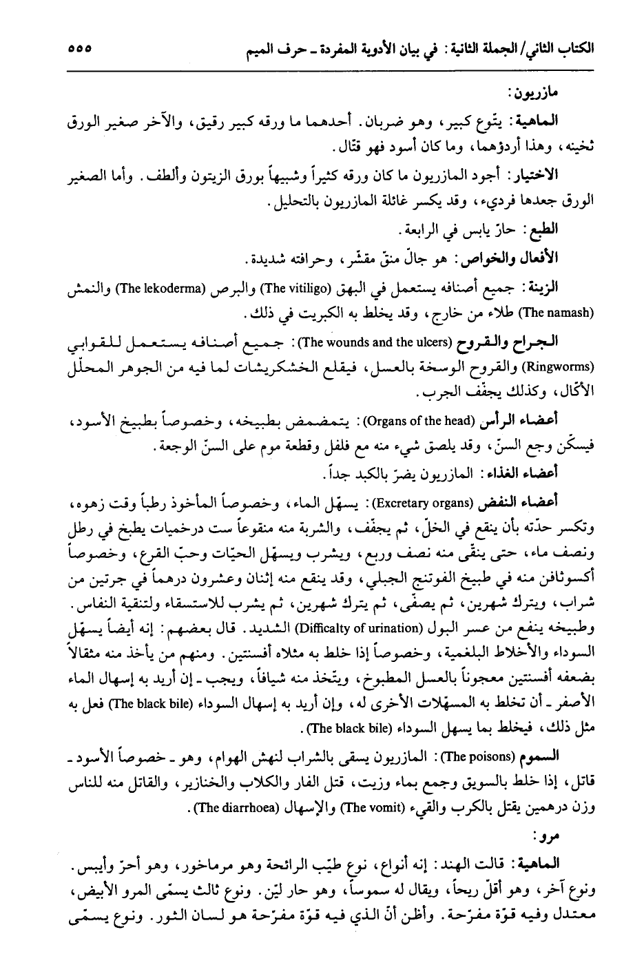 مازريون. الْمَاهِيّة: يتّوع كَبِير وَهُوَ ضَرْبَان. أَحدهمَا مَا ورقه كَبِير رَقِيق وَالْآخر صَغِير الْوَرق ثخينه وَهَذَا أردؤهما وَمَا كَانَ أسود فَهُوَ قتّال. الأختيار: أَجود المازريون مَا كَانَ ورقه كثيرا وشبيهاً بورق الزَّيْتُون وألطف. وَالصَّغِير الْوَرق جعدها فرديء وَقد يكسر غائلة المازريون بالتحليل. الطَّبْع: حَار يَابِس فِي الرَّابِعَة. الْأَفْعَال والخواص: وَهُوَ جال منق مقشر وحرافته شَدِيدَة. الزِّينَة: جَمِيع أصنافه يسْتَعْمل فِي البهق والبرص والنمش طلاء من خَارج وَقد يخلط بِهِ الكبريت فِي ذَلِك. الْجراح والقروح: جَمِيع أصنافه يسْتَعْمل للقوابي والقروح الوسخة بالعسل فيقلع الخشكريشات لما فِيهِ من الْجَوْهَر الْمُحَلّل الأكال وَكَذَلِكَ يجفف الجرب. أَعْضَاء الرَّأْس: يتمضمض بطبيخه وخصوصاً بطبيخ الْأسود فيسكن وجع السنّ وَقد يلصق شَيْء مِنْهُ مَعَ فلفل وَقطعَة موم على السن الوجعة. أَعْضَاء الْغذَاء: المازريون يضر بالكبد جدا. أَعْضَاء النفض: يسهّل المَاء وخصوصاً الْمَأْخُوذ رطبا وَقت زهوه وتكسر حِدته بِأَن ينقع فِي الْحل ثمَّ يجفف والشربة مِنْهُ منقوعاً سِتّ درخميات يطْبخ فِي رَطْل وَنصف مَاء حَتَّى ينقى مِنْهُ نصف وَربع وَيشْرب ويسهّل الْحَيَّات وَحب القرع وخصوص أكسوثافن مِنْهُ فِي طبيخ الفوتنج الْجبلي وَقد ينقع مِنْهُ إثنان وَعِشْرُونَ درهما فِي جرتين من شراب وَيتْرك شَهْرَيْن ثمَّ يصفّى ثمَّ يتْرك شَهْرَيْن ثمَّ يشرب للإستسقاء ولتنقية النّفاس. وطبيخه ينفع من عسر الْبَوْل الشَّديد. قَالَ بَعضهم: أَنه أَيْضا يسهّل السَّوْدَاء والأخلاط البلغمية وخصوصاً إِذا خلط بِهِ مثلا أفسنتين. وَمِنْهُم من يَأْخُذ مِنْهُ مِثْقَالا بضعفه أفسنتين معجوناً بالعسل الْمَطْبُوخ ويتخذ مِنْهُ شيافاً وَيجب إِن أُرِيد بِهِ إسهال المَاء. الْأَصْفَر أَن يخلط بِهِ المسهلات الْأُخْرَى لَهُ وَأَن أُرِيد بِهِ إسهال السَّوْدَاء فعل بِهِ مثل ذَلِك فيخلط بِمَا يسهل السَّوْدَاء. السمُوم: المازريون يسقى بِالشرابِ لنهش الْهَوَام وَهُوَ خُصُوصا الْأسود قَاتل إِذا خلط بالسويق وَجمع بِمَاء وزيت قتل الفار وَالْكلاب والخنازير وَالْقَاتِل مِنْهُ للنَّاس وزن دِرْهَمَيْنِ يقتل بالكرب والقيء والإسهال. مرو. الْمَاهِيّة: قَالَت الْهِنْد: إِنَّه أَنْوَاع نوع طيب الرَّائِحَة وَهُوَ مرماخور وَهُوَ أحر وأيبس. وَنَوع آخر وَهُوَ أقل ريحًا وَيُقَال لَهُ سموساً وَهُوَ حَار ليّن. وَنَوع ثَالِث يُسمى المرو الْأَبْيَض معتدل وَفِيه قُوَّة مفرحة. وأظن أَن الَّذِي فِيهِ قُوَّة مفرحة هُوَ لِسَان الثور. وَنَوع يُسمى