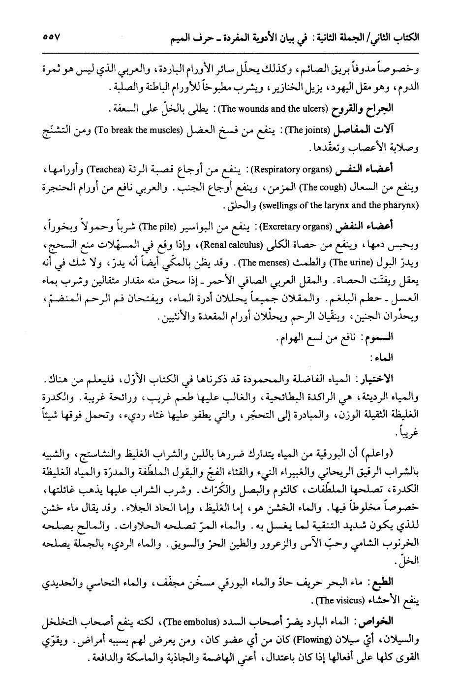 وخصوصاً مدوفاً بريق الصَّائِم وَكَذَلِكَ يحلل سَائِر الأورام الْبَارِدَة والعربي الَّذِي لَيْسَ هُوَ ثَمَرَة الدوم وَهُوَ مقل الْيَهُود يزِيل الْخَنَازِير وَيشْرب مطبوخاً للأورام الْبَاطِنَة والصلبة. الْجراح والقروح: يطلى بالخل على السعفة. أَعْضَاء النَّفس: ينفع من أوجاع قَصَبَة الرئة وأورامها وينفع من السعال المزمن وينفع أوجاع الْجنب. والعربي نَافِع من أورام الحنجرة وَالْحلق. أَعْضَاء النفض: ينفع من البواسير شرباً وحمولاً وبخوراً وَيحبس دَمهَا وينفع من حَصَاة الْكُلِّي وَإِذا وَقع فِي المسهلات منع السحج ويدرالبول والطمث. وَقد يظنّ بِالْمَكِّيِّ أَيْضا أَنه يدر وَلَا شكّ فِي أَنه يعقل ويفتت الْحَصَاة. والمقل العريي الصافي الْأَحْمَر إِذا سحق مِنْهُ مِقْدَار مثقالين وَشرب بِمَاء الْعَسَل حطم البلغم. والمقلان جَمِيعًا يحللان أدرة المَاء ويفتحان فَم الرَّحِم المنضم ويحدران الْجَنِين وينقيان الرَّحِم ويحللان أورام المقعدة والأنثيين. السمُوم: نَافِع من لسع الْهَوَام. الإختيار: الْمِيَاه الفاضلة والمحمودة قد ذَكرنَاهَا فِي الْكتاب الأول فَليعلم من هُنَاكَ. والمياه الرَّديئَة هِيَ الراكدة البطائحية وَالْغَالِب عَلَيْهَا طعم غَرِيب ورائحة غَرِيبَة. والكدرة الغليظة الثَّقِيلَة الْوَزْن والمبادرة إِلَى التحجر وَالَّتِي يطفو عَلَيْهَا غثاء رَدِيء وَتحمل فَوْقهَا شَيْئا غَرِيبا. وَاعْلَم أَن البورقية من الْمِيَاه يتدارك ضررها بِاللَّبنِ وَالشرَاب الغليظ والنشاستج والشبيه بِالشرابِ الرَّقِيق الريحاني والغبيراء النيء والقثاء الْفَج والبقول الملطفة والمدرة والمياه الغليظة الكدرة يصلحها الملطفات كالثوم والبصل والكراث. وَشرب الشَّرَاب عَلَيْهَا يذهب غائلتها خُصُوصا مخلوطاً فِيهَا. وَالْمَاء الخشن هُوَ إِمَّا الغليظ وَإِمَّا الحاد الْجلاء. وَقد يُقَال مَاء خشن للَّذي يكون شَدِيد التنقية لما يغسل بِهِ. وَالْمَاء المر يصلحه الحلاوات. والمالح يصلحه الخرنوب الشَّامي وحبّ الآس والزعرور والطين الْحر والسويق. وَالْمَاء الرَّدِيء بِالْجُمْلَةِ يصلحه الْخلّ. الطَّبْع: مَاء الْبَحْر حريف حاد وَالْمَاء البورقي مسخن مجفف وَالْمَاء النحاسي والحديدي ينفع الأحشاء. الْخَواص: المَاء الْبَارِد يضر أَصْحَاب السدد لكنه ينفع أَصْحَاب التخلخل والسيلان أَي سيلان كَانَ من أَي عُضْو كَانَ وَمن يعرض لَهُم بِسَبَبِهِ أمراض. وَيُقَوِّي القوى كلهَا على أفعالها إِذا كَانَ باعتدال أَعنِي الهاضمة والجاذبة والماسكة والدافعة.