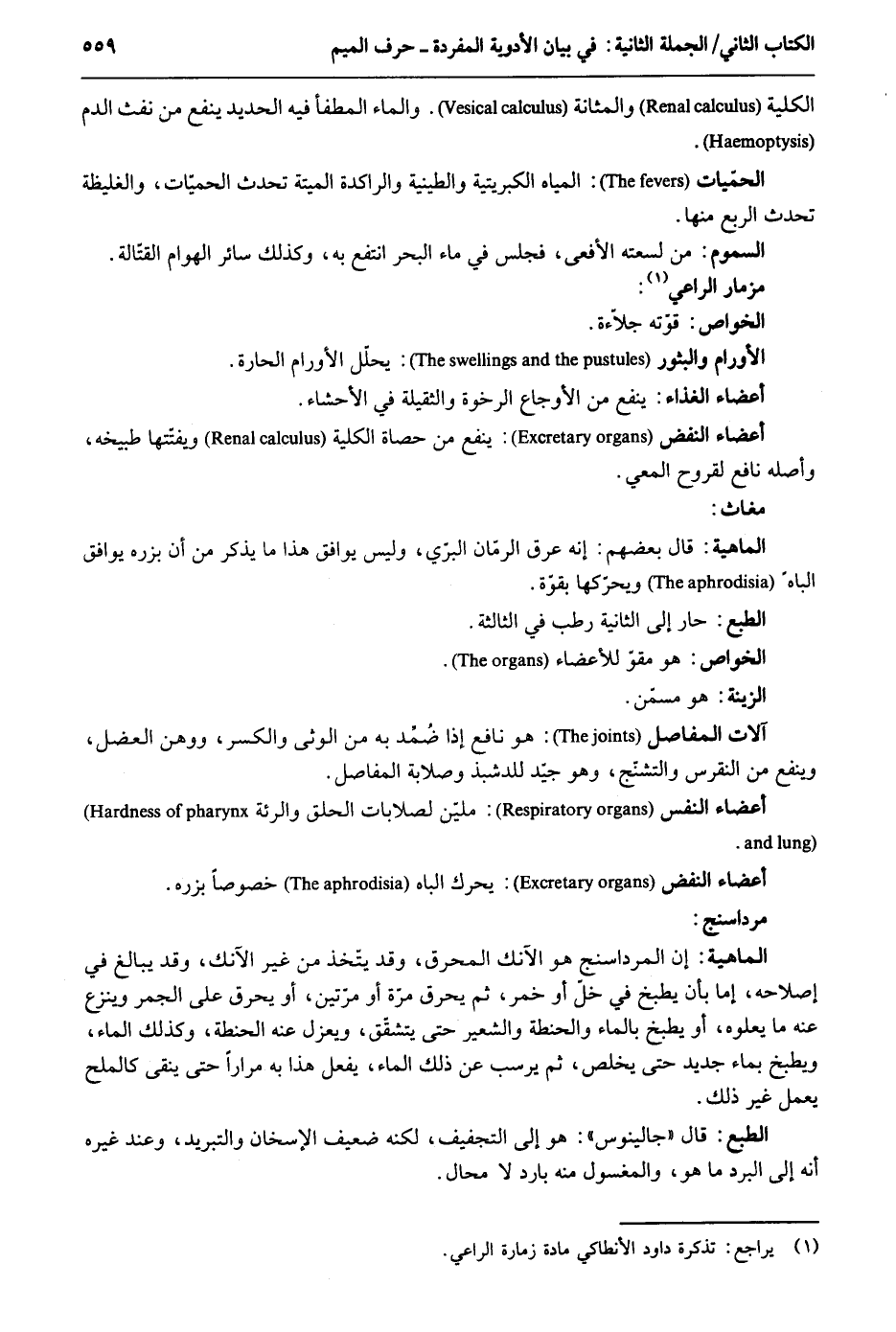 الْكُلية والمثانة. وَالْمَاء المطفأ فِيهِ الْحَدِيد ينفع من نفث الدَّم. الحميات: الْمِيَاه الكبريتية والطينية والراكدة الْميتَة تحدث الحميّات والغليظة تحدث الرّبع مِنْهَا. السمُوم: من لسعته الأفعى فَجَلَسَ فِي مَاء الْبَحْر انْتفع بِهِ وَكَذَلِكَ سَائِر الْهَوَام القتالة. مزمار الرَّاعِي. الْخَواص: قوّته جلاءة. الأورام والبثور: يحلل الأورام الحارة. أَعْضَاء الْغذَاء: ينفع من الأوجاع الرخوة والثقيلة فِي الأحشاء. مغاث. الْمَاهِيّة: قَالَ بَعضهم: إِنَّه عرق الرُّمَّان الْبري وَلَيْسَ يُوَافق هَذَا مَا يذكر من أَن بزره يُوَافق الباه ويحركها بِقُوَّة. الطَّبْع: حَار إِلَى الثَّانِيَة رطب فِي الثَّالِثَة. الْخَواص: هُوَ مقو للأعضاء. الزِّينَة: هُوَ مسمن. آلَات المفاصل: هُوَ نَافِع إِذا ضُمِّد بِهِ من الوثى وَالْكَسْر ووهن العضل وينفع من النقرس والتشنج وَهُوَ جيد للدشبذ وصلابة المفاصل. أَعْضَاء النَّفس: ملين لصلابات الْحلق والرئة. أَعْضَاء النفض: يُحَرك الباه خُصُوصا بزره. مرداسنج. الْمَاهِيّة: إِن المرداسنج هُوَ الآنك المحرق وَقد يتّخذ من غير الأنك وَقد يُبَالغ فِي إِصْلَاحه إِمَّا بِأَن يطْبخ فِي خل أَو خمر ثمَّ يحرق مرّة أَو مرَّتَيْنِ أَو يحرق على الْجَمْر وَينْزع عَنهُ مَا يعلوه أَو يطْبخ بِالْمَاءِ وَالْحِنْطَة وَالشعِير حَتَّى يتشقّق ويعزل عَنهُ الْحِنْطَة وَكَذَلِكَ المَاء ويطبخ بِمَاء جَدِيد الطَّبْع: قَالَ جالينوس: هُوَ إِلَى التجفيف لكنه ضَعِيف الإسخان والتبريد وَعند غَيره أَنه إِلَى الْبرد مَا هُوَ والمغسول مِنْهُ بَارِد لَا محَال.