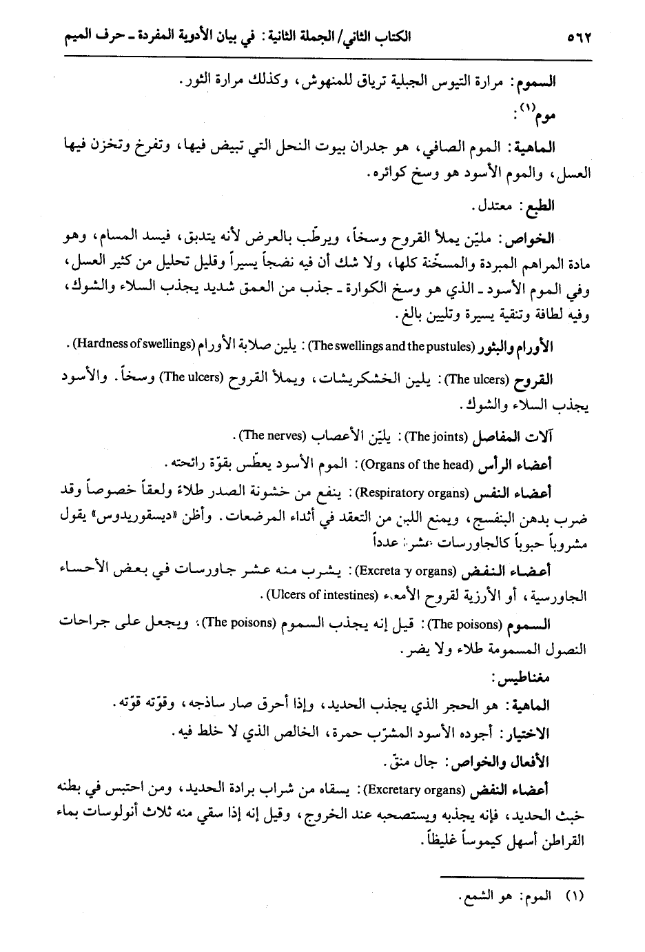 السمُوم: مرَارَة التيوس الجبلية ترياق للمنهوش وَكَذَلِكَ مرَارَة الثور. موم. الْمَاهِيّة: الموم الصافي هُوَ جدران بيُوت النَّحْل الَّتِي تبيض فِيهَا وتفرخ وتخزن فِيهَا الْعَسَل والموم الْأسود هُوَ وسخ كوائره. الطَّبْع: معتدل. الْخَواص: مليّن يملا القروح وسخاً ويرطب بِالْعرضِ لِأَنَّهُ يتدبق فيسد المسام وَهُوَ مَادَّة المراهم المبردة والمسخنة كلهَا وَلَا شكّ أَن فِيهِ نضجاً يسيرأ وَقَلِيل تَحْلِيل من كثير الْعَسَل وَفِي الموم الْأسود الَّذِي هُوَ وسخ الكوارة جذب من العمق شَدِيد يجذب السلاء والشوك وَفِيه لطافة وتنقية يسيرَة وتليين بَالغ. الأورام والبثور: يلين صلابة الأورام. القروح: يلين الخشكريشات ويملا القروح وسخاً. وَالْأسود يجذب السلاء والشوك. آلَات المفاصل: يلين الأعصاب. أَعْضَاء النَّفس: ينفع من خشونة الصَّدْر طلاءً ولعقاً خُصُوصا وَقد ضرب بدهن البنفسجٍ وَيمْنَع اللَّبن من التعقد فِي أثداء المرضعات. وأظن ديسقوريدوس يَقُول مشروباً حبوباً كالجاورسات عشرَة عددا. أَعْضَاء النفض: يشرب مِنْهُ عشر جاورسات فِي بعض الأحساء الجاورسية أَو الأرزية لقروح الأمعاء. السمُوم: قيل أَنه يجذب السمُوم وَيجْعَل على جراحات النصول المسمومة طلاء وَلَا يضر.