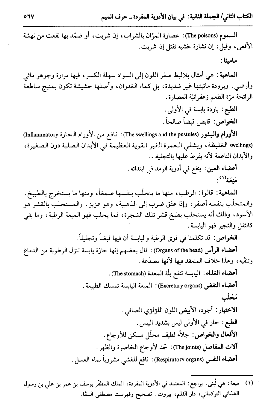 السمُوم: عصارة المران بِالشرابِ إِن شربت أَو ضفد بهَا نَفَعت من نهشة الأفعى قيل: إِن نشارة خشبه تقتل إِذا شربت. ماميثا. الْمَاهِيّة: هِيَ أَمْثَال بلاليط صفر اللَّوْن إِلَى السوَاد سهلة الْكسر فِيهِ مرَارَة وجوهر مائي وأرضي. وبرودة مائيته غير شَدِيدَة بل كَمَاء الغحران وَأَصلهَا حشيشة تكون بمنبج ساطعة الرَّائِحَة مرّة الطّعْم زعفرانية العصارة. الطَّبْع: بَارِدَة يابسة فِي الأولى. الْخَواص: قَابض قبضا صَالحا. الأورام والبثور: نَافِع من الأورام الحارة الغليظة ويشفي الْحمرَة الْغَيْر القوية الْعَظِيمَة فِي الْأَبدَان الصلبة دون الصَّغِيرَة والأبدان الناعمة لِأَنَّهُ يفرط عَلَيْهَا بالتجفيف. أَعْضَاء الْعين: ينفع فِي أدوية الرمد فِي ابْتِدَائه. ميعة. الماهيهّ: قَالُوا: الرطب مِنْهَا مَا يتحلب بِنَفسِهَا صمغاً وَمِنْهَا مَا يسْتَخْرج بالطبيخ. والمتحلب بِنَفسِهِ أصفر وَإِذا عتّق ضرب إِلَى الذهبية وَهُوَ عَزِيز. والمستجلب بالقشر هُوَ الْأسود وَذَلِكَ أَنه يستحلب بطبخ قشر تِلْكَ الشَّجَرَة فَمَا يحلب فَهُوَ الميعة الرّطبَة وَمَا بَقِي كالثفل والثجير فَهُوَ الْيَابِسَة. الْخَواص: قد تكلمنا فِي قوى الرّطبَة واليابسة إِن فِيهَا قبضا وتجفيفاً. أَعْضَاء الرَّأْس: قَالَ بَعضهم أَنَّهَا حارة يابسة تنزل الرُّطُوبَة من الدِّمَاغ وتنقّيه وَهَذَا خلاف أَعْضَاء الْغذَاء: الْيَابِسَة تَنْفَع بلة الْمعدة. أَعْضَاء النفض: الميعة الْيَابِسَة تمسك الطبيعة. محْلَب. الِاخْتِيَار: أجوده الْأَبْيَض اللَّوْن اللؤْلُؤِي الصافي. الطَّبْع: حَار فِي الأولى لَيْسَ بشديد اليبس. الْأَفْعَال والخواص: جلاّء لطيف مُحَلل مسكن للأوجاع. آلَات المفاصل: جيد لأوجاع الخاصرة وَالظّهْر. أَعْضَاء النَّفس: نَافِع للغشي مشروباً بِمَاء الْعَسَل.