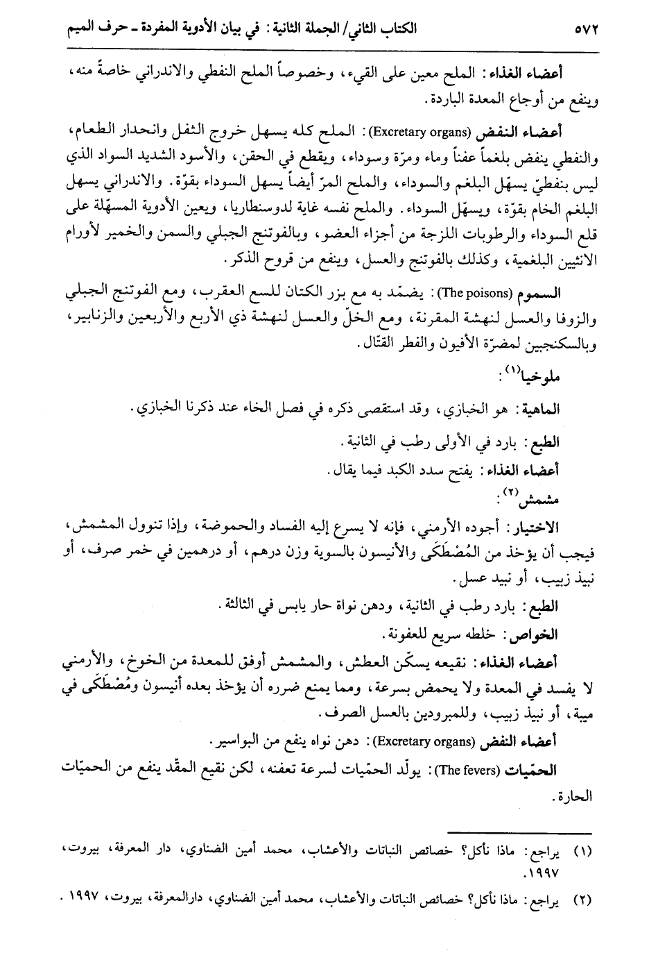 أَعْضَاء الْغذَاء: الْملح معِين على الْقَيْء وخصوصاً الْملح النفطي والاندراني خَاصَّة مِنْهُ وينفع من أوجاع الْمعدة الْبَارِدَة. أَعْضَاء النفض: الْملح كُله يسهل خُرُوج الثفل وانحدار الطَّعَام والنفطي ينفض بلغماً عفناً وَمَاء وَمرَّة وسوداء وَيقطع فِي الحقن وَالْأسود الشَّديد السوَاد الَّذِي لَيْسَ بنفطي يسهّل البلغم والسوداء وَالْملح المر أَيْضا يسهل السَّوْدَاء بِقُوَّة. والاندراني يسهل البلغم بقوّة ويسهّل السَّوْدَاء. وَالْملح نَفسه غَايَة لدوسنطاريا ويعين الْأَدْوِيَة المسهلة على قلع السَّوْدَاء والرطوبات اللزجة من أَجزَاء الْعُضْو وبالفوتنج الْجبلي وَالسمن والخمير لأورام الانثيين البلغمية وَكَذَلِكَ بالفوتنج وَالْعَسَل وينفع من قُرُوح الذّكر. السمُوم: يضمّد بِهِ مَعَ بزر الْبُهْتَان للسع الْعَقْرَب وَمَعَ الفوتنج الْجبلي والزوفا وَالْعَسَل لنهشة المقرنة وَمَعَ الْخلّ وَالْعَسَل لنهشة فِي الْأَرْبَعَة وَالْأَرْبَعِينَ والزنابير وبالسكنجبين لمضرة الأفيون وَالْفطر الْقِتَال. ملوخيا. الْمَاهِيّة: هُوَ الْخَبَّازِي وَقد استقصي ذكره فِي فصل الْخَاء عِنْد ذكرنَا الْخَبَّازِي. الطَّبْع: بَارِد فِي الأولى رطب فِي الثَّانِيَة. أَعْضَاء الْغذَاء: يفتح سدد الكبد فِيمَا يُقَال. مشمش. الِاخْتِيَار: أجوده الأرمني فَإِنَّهُ لَا يسْرع إِلَيْهِ الْفساد والحموضة وَإِذا تنوول المشمش فَيجب أَن يُؤْخَذ من المصطكَى والأنيسون بِالسَّوِيَّةِ وزن دِرْهَم أَو دِرْهَمَيْنِ فِي خمر صرف أَو نَبِيذ زبيب أَو نبيد عسل. الطَّبْع: بَارِد رطب فِي الثَّانِيَة ودهن نواة حَار يَابِس فِي الثَّالِثَة. الْخَواص: خلطه سريع للعفونة. أَعْضَاء الْغذَاء: نقيعه يسكن الْعَطش والمشمش أوفق للمعدة من الخوخ والأرمني لَا يفْسد فِي الْمعدة وَلَا يحمض بِسُرْعَة وَمِمَّا يمْنَع ضَرَره أَن يُؤْخَذ بعده أنيسون ومُصْطَكَى فِي ميبة أَو نَبِيذ أَعْضَاء النفض: دهن نَوَاه ينفع من البواسير. الحميات: يُولد الحميات لسرعة تعفنه لَكِن نَقِيع المقدد ينفع من الحميّات الحارة.