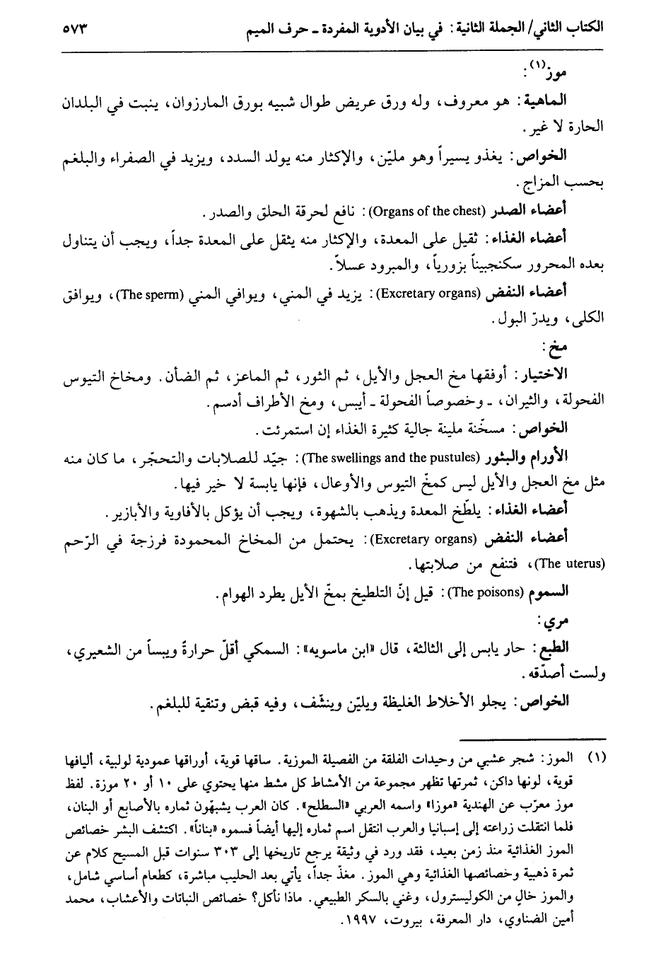 موز. الْمَاهِيّة: هُوَ مَعْرُوف وَله ورق عريض طوال شَبيه بورق المارزوان ينْبت فِي الْبلدَانِ الحارة لَا غير. الْخَواص: يغذو يَسِيرا وَهُوَ ملين والإكثار مِنْهُ يُولد السدد وَيزِيد فِي الصَّفْرَاء والبلغم بِحَسب المزاج. أَعْضَاء الصَّدْر: نَافِع لحرقة الْحلق والصدر. أَعْضَاء الْغذَاء: ثقيل على الْمعدة والإكثار مِنْهُ يثقل على الْمعدة جدا وَيجب أَن يتَنَاوَل بعده المحرور سكنجبيناً بزورياً والمبرود عسلاً. أَعْضَاء النفض: يزِيد فِي الْمَنِيّ ويوافي الْمَنِيّ ويوافق الْكُلِّي ويدر الْبَوْل. مخ. الِاخْتِيَار: أوفقها مخ الْعجل والأيل ثمَّ الثور ثمَّ الماعز ثمَّ الضَّأْن. ومخاخ التيوس الفحولة والثيران - وخصوصاً الفحولة - أيبس ومخ الْأَطْرَاف أدسم. الأورام والبثور: جيد للصلابات والتحجّر مَا كَانَ مِنْهُ مثل مخ الْعجل والأيل لَيْسَ كمخ التيوس والأوعال فَإِنَّهَا يابسة لَا خير فِيهَا. أَعْضَاء الْغذَاء: يلطخ الْمعدة وَيذْهب بالشهوة وَيجب أَن يُؤْكَل بالأفاويه والأبازير. أَعْضَاء النفض: يحْتَمل من المخاخ المحمودة فرزجة فِي الرَّحِم فتنفع من صلابتها. السمُوم: قيل أنّ التلطيخ بمخ الأيل يطرد الْهَوَام. مري. الطَّبْع: حَار يَابِس إِلَى الثَّالِثَة قَالَ ابْن ماسريه: السمكي أقل حرارةً ويبساً من الشعيري وَلست أصدقه. الْخَواص: يجلو الأخلاط الغليظة ويلين وينشف وَفِيه قبض وتنقية للبلغم.