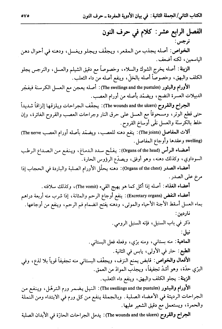 نرجس. الْخَواص: أَصله يجذب من المقعر ويجفف ويجلو وَيغسل ودهنه فِي أَحْوَال دهن الياسمين لكنه أَضْعَف. الْخَواص: أَصله يخرج الشوك والسلاء وخصوصاً مَعَ دَقِيق الشيلم وَالْعَسَل والنرجس يجلو الكلف والبهق وخصوصاً أَصله بالخل وينفع أَصله من دَاء الثَّعْلَب. الأورام والبثور: أَصله يعجن مَعَ الْعَسَل الكرسنة فيفجر الدبيلات الْعسرَة النضج ويضمد الْجراح والقروح: يجفف الْجِرَاحَات ويلزقها إلزاقاً شَدِيدا حَتَّى قطع الْوتر ومسحوقاً مَعَ الْعَسَل على حرق النَّار وجراحات العصب والقروح الغائرة وَإِن خلط بالكرسنة وَالْعَسَل نقى أوساخ القروح. آلَات المفاصل: ينفع دهنه للعصب ويضمد بِأَصْلِهِ أورام العصب وعقدها وأوجاع المفاصل. . أَعْضَاء الرَّأْس: يفتح سدد الدِّمَاغ وينفع من الصداع الرطب السوداوي وَكَذَلِكَ دهنه وَهُوَ أوفق ويصدع الرؤوس الحارة. أَعْضَاء الصَّدْر: دهنه يحلّل الأورام الصلبة والباردة فى الْحجاب إِذا مرخ على الصَّدْر. أَعْضَاء الْغذَاء: أَصله إِذا أكل كَمَا هُوَ يهيج الْقَيْء وَكَذَلِكَ سلاقته. أعضاه النفض: ينفع أوجاع الرَّحِم والمثانة إِذا شرب مِنْهُ أَرْبَعَة دَرَاهِم بِمَاء الْعَسَل أسقط الأجنة الْأَحْيَاء والموتى ودهنه يفتح انضمام فَم الرَّحِم وينفع من أوجاعها ناردين. ذكر فِي بَاب السنبل فَإِنَّهُ السنبل الرُّومِي. نيل. الْمَاهِيّة: مِنْهُ بستاني وَمِنْه بري وَفعله فعل البستاني. الطَّبْع: حَار فِي الأولى يَابِس فِي الثَّانِيَة. الْأَفْعَال والخواص: قَابض يمْنَع النزف ويجفف البستاني مِنْهُ تجفيفاً قَوِيا بِلَا لذع وَفِي الْبري حِدة وَهُوَ أشدّ تجفيفاً ويجذب الْموَاد من العمق. الزِّينَة: يجلو الكلف والبهق وينفع دَاء الثَّعْلَب. الأورام والبثور: النّيل يضمر ورم الترهل وينفع من الْجِرَاحَات الرَّديئَة فِي الْأَعْضَاء الصلبة. وَبِالْجُمْلَةِ ينفع من كل ورم فِي الِابْتِدَاء وَمن النملة والحمرة وَيسْتَعْمل مَعَ دَقِيق الشعيرعليها. الْجراح والقروح: يدمل الْجِرَاحَات الحازة فِي الْأَبدَان الصلبة