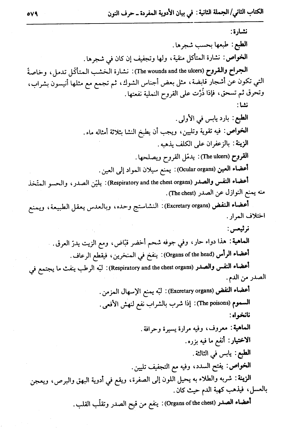 نشارة. الْخَواص: نشارة المتأكل منقية وَلها وجفيف إِن كَانَ فِي شَجَرهَا. الْجراح والقروح: نشارة الْخشب المتأكّل تدمل وخاصةً الَّتِي تكون عَن أَشجَار قابضة مثل بعض أَجنَاس الشوك ثمَّ تجمع مَعَ مثلهَا أنيسون بشراب وَتحرق ثمَّ تسحق فَإِذا ذرت على القروح النملية نفعتها. نشا. الطَّبْع: بَارِد يَابِس فِي الأولى. الْخَواص: فِيهِ تَقْوِيَة وتليين وَيجب أَن يطْبخ النشا بِثَلَاثَة أَمْثَاله مَاء. الزِّينَة: بالزعفران على الكلف يذهبه. القروح: يدمل القروح ويصلحها. أَعْضَاء الْعين: يمْنَع سيلان الْموَاد إِلَى الْعين. أَعْضَاء النَّفس والصدر: يليّن الصَّدْر والحسو المتّخذ مِنْهُ يمْنَع النَّوَازِل عَن الصَّدْر. أَعْضَاء النَّفس: النشاستج وَحده وبالعدس يعقل الطبيعة وَيمْنَع اخْتِلَاف المرار. نرثيعس. الْمَاهِيّة: هَذَا دَوَاء حَار وَفِي جَوْفه شَحم أَخْضَر قباض وَمَعَ الزَّيْت يدر الْعرق. أَعْضَاء النَّفس والصدر: لبه الرطب ينفث مَا يجْتَمع فِي الصَّدْر من الدَّم. أَعْضَاء النفض: لبه يمْنَع الإسهال المزمن. السمُوم: إِذا شرب بِالشرابِ نفع لنهش الأفعى. نانخواه. الْمَاهِيّة: مَعْرُوف وَفِيه مرَارَة يسيرَة وحرافة. الِاخْتِيَار: أَنْفَع مَا فِيهِ بزره. الطَّبْع: يَابِس فِي الثَّالِثَة. الْخَواص: يفتح السدد وَفِيه مَعَ التجفيف تليين. الزِّينَة: شربه والطلاء بِهِ يحِيل اللَّوْن إِلَى الصُّفْرَة وَيَقَع فِي أدوية البهق والبرص ويعجن بالعسل فَيذْهب كَهِبَة الدَّم حَيْثُ كَانَ. أَعْضَاء الصَّدْر: ينفع من قيح الصَّدْر وتقلب الْقلب.