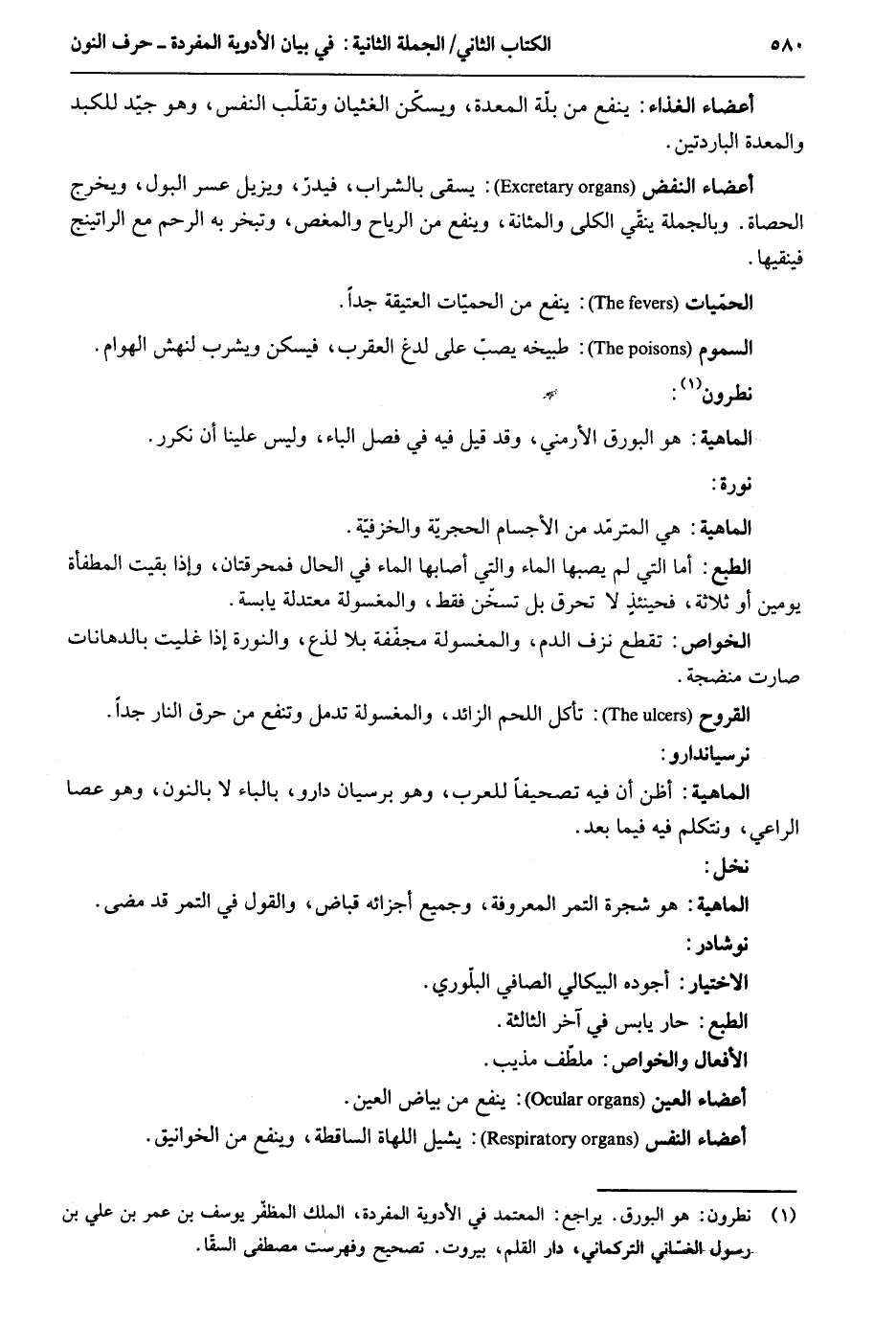 أَعْضَاء الْغذَاء: ينفع من بلة الْمعدة ويسكّن الغثيان وتقلب النَّفس وَهُوَ جيّد للكبد والمعدة الباردتين. أَعْضَاء النفض: يسقى بِالشرابِ فيدر ويزيل عسر الْبَوْل وَيخرج الْحَصَاة. وَبِالْجُمْلَةِ ينقي الْكُلِّي الحميات: ينفع من الحميات العتيقة جدا. السمُوم: طبيخه يصبّ على لدغ الْعَقْرَب فيسكن وَيشْرب لنهش الْهَوَام. نطرون. الْمَاهِيّة: هُوَ البورق الأرمني وَقد قيل فِيهِ فِي فصل الْبَاء وَلَيْسَ علينا أَن نكرر. نورة. الْمَاهِيّة: هِيَ المترمد من الْأَجْسَام الحجرية والخزفية. الطَّبْع: أما الَّتِي لم يصبهَا المَاء وَالَّتِي أَصَابَهَا المَاء فِي الْحَال فمحرقتان وَإِذا بقيت المطفأة يَوْمَيْنِ أَو ثَلَاثَة فَحِينَئِذٍ لَا تحرق بل تسخن فَقَط والمغسولة معتدلة يابسة. الْخَواص: تقطع نزف الدَّم والمغسولة مجفّفة بِلَا لذع والنورة إِذا غليت بالدهانات صَارَت منضجة. القروح: تَأْكُل اللَّحْم الزَّائِد والمغسولة تدمل وَتَنْفَع من حرق النَّار جدا. نرسياندارو. الْمَاهِيّة: أَظن أَن فِيهِ تصحيفاً للْعَرَب وَهُوَ برسيان دارو بِالْبَاء لَا بالنُّون وَهُوَ عَصا الرَّاعِي ونتكلم فِيهِ فِيمَا بعد. الْمَاهِيّة: هُوَ شَجَرَة التَّمْر الْمَعْرُوفَة وَجَمِيع أَجْزَائِهِ قباض وَالْقَوْل فِي التَّمْر قد مضى. نوشادر. الِاخْتِيَار: أجوده البيكالي الصافي البلوري. الطَّبْع: حَار يَابِس فِي آخر الثَّالِثَة. الْأَفْعَال والخواص: ملطف مذيب. أَعْضَاء الْعين: ينفع من بَيَاض الْعين. أَعْضَاء النَّفس: يشيل اللهاة الساقطة وينفع من الخرانيق.