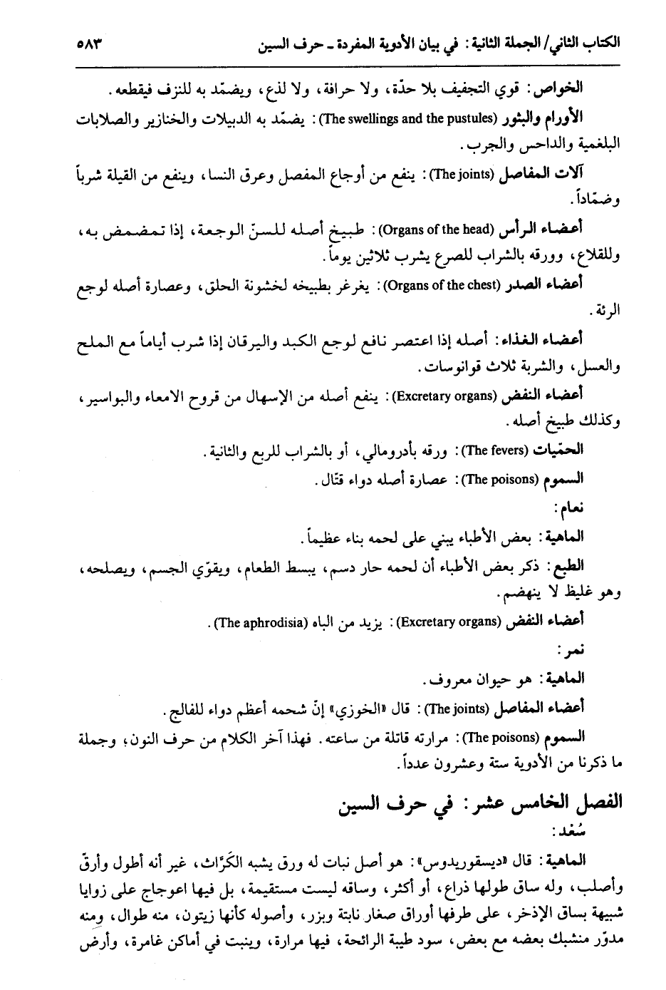 الْخَواص: قوي التجفيف بِلَا حِدة وَلَا حرافة وَلَا لذع ويضمد بِهِ للنزف فيقطعه. الأورام والبثور: يضمد بِهِ الدبيلات والخنازير والصلابات البلغمية والداحس والجرب. آلَات المفاصل: ينفع من أوجاع الْمفصل وعرق النسا وينفع من القيلة شرباً وضماداً. أَعْضَاء الرَّأْس: طبيخ أَصله للسن الوجعة إِذا تمضمض بِهِ وللقلاع وورقه بِالشرابِ للصرع يشرب ثَلَاثِينَ يَوْمًا. أَعْضَاء الصَّدْر: يُغَرْغر بطبيخه لخشونة الْحلق وعصارة أَصله لوجع الرئة. أَعْضَاء الْغذَاء: أَصله إِذا اعتصر نَافِع لوجع الكبد واليرقان إِذا شرب أَيَّامًا مَعَ المَاء وَالْعَسَل والشربة ثَلَاث قوانوسات. أَعْضَاء النفض: ينفع أَصله من الإسهال من قُرُوح الامعاء والبواسير وَكَذَلِكَ طبيخ أَصله. الحميات: ورقه بأدرومالي أَو بِالشرابِ للربع وَالثَّانيَِة. السمُوم: عصارة أَصله دَوَاء قتال. الْمَاهِيّة: بعض الْأَطِبَّاء يَبْنِي على لَحْمه بناءعظيماً. الطَّبْع: ذكر بعض الْأَطِبَّاء أَن لَحْمه حَار دسم يبسط الطَّعَام وَيُقَوِّي الْجِسْم ويصلحه وَهُوَ غليظ لَا ينهضم. أَعْضَاء النفض: يزِيد من الباه. نمر. الْمَاهِيّة: هُوَ حَيَوَان مَعْرُوف. أَعْضَاء المفاصل: قَالَ الخوزي أَن شحمه أعظم دَوَاء للفالج. السمُوم: مرارته قاتلة من سَاعَته. فَهَذَا آخر الْكَلَام من حرف النُّون وَجُمْلَة مَا ذكرنَا من الْأَدْوِيَة سِتَّة وَعِشْرُونَ عددا. الْفَصْل الْخَامِس عشر حرف السِّين سُعْد. الْمَاهِيّة: قَالَ ديسقوريدوس: هُوَ أصل نَبَات لَهُ ورق يشبه الكراث غير أَنه أطول وأرق وأصلب وَله سَاق طولهَا ذِرَاع أَو أَكثر وَسَاقه لَيست مُسْتَقِيمَة بل فِيهَا اعوجاج على زَوَايَا شَبيهَة بساق الْإِذْخر على طرفها أوراق صغَار نابتة وبزر وأصوله كَأَنَّهَا زيتون مِنْهُ طوال وَمِنْه مدور منشبك بعضه مَعَ بعض سود طيبَة الرَّائِحَة فِيهَا مرَارَة وينبت فِي أَمَاكِن غامرة وَأَرْض