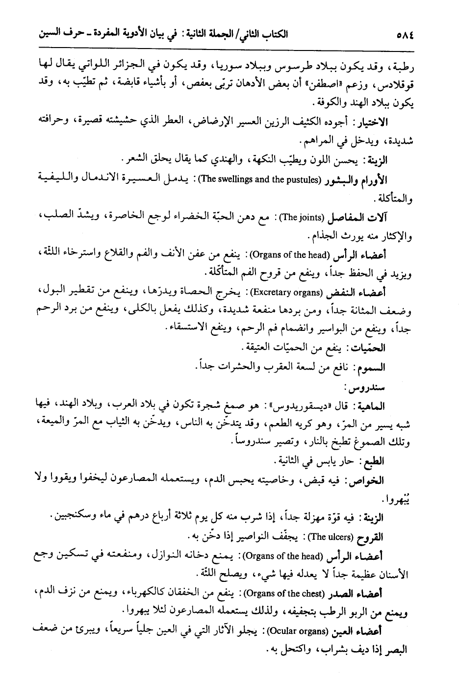 رطبَة وَقد يكون بِبِلَاد طرسوس وببلاد سوريا وَقد يكون فِي الجزائر اللواتي يُقَال لَهَا قوقلادس وَزعم اصطفن أَن بعض الأدهان تربى بعفص أَو بأَشْيَاء قابضة ثمَّ تطيب بِهِ وَقد يكون بِبِلَاد الْهِنْد والكوفة. الِاخْتِيَار: أجوده الكثيف الرزين العسير الإرضاض الْعطر الَّذِي حشيشته قَصِيرَة وحرافته شَدِيدَة وَيدخل فِي المراهم. الزِّينَة: يحسن اللَّوْن ويطيب النكهة والهندي كَمَا يُقَال يحلق الشّعْر. الأورام والبثور: يدمل العسيرة الِانْدِمَال والليفية والمتأكلة. آلَات المفاصل: مَعَ دهن الْحبَّة الخضراء لوجع الخاصرة ويشد الصلب والإكثار مِنْهُ يُورث الجذام. أَعْضَاء الرَّأْس: ينفع من عفن الْأنف والفم والقلاع واسترخاء اللثّة وَيزِيد فِي الْحِفْظ جدا وينفع من قُرُوح الْفَم المتأكلّة. أَعْضَاء النفض: يخرج الْحَصَاة ويدرها وينفع من تقطير الْبَوْل وَضعف المثانة جدا وَمن بردهَا مَنْفَعَة شَدِيدَة وَكَذَلِكَ يفعل بالكلي وينفع من برد الرَّحِم جدا وينفع من البواسير وانضمام فَم الرَّحِم وينفع الاسْتِسْقَاء. الحمّيات: ينفع من الحميات العتيقة. السمُوم: نَافِع من لسعة الْعَقْرَب والحشراب جدا. سندروس. الماهبة: قَالَ: ديسقوريدوس: هُوَ صمغ شَجَرَة تكون فِي بِلَاد الْعَرَب وبلاد الْهِنْد فِيهَا شبه يسير من المرّ وَهُوَ كريه الطّعْم وَقد يتدخن بِهِ النَّاس ويدخن بِهِ الثِّيَاب مَعَ المر والميعة وَتلك الصموغ تطبخ بالنَّار وَتصير سندروساً. الطَّبْع: حَار يَابِس فِي الثَّانِيَة. الْخَواص: فِيهِ قبض وخاصية يحبس الدَّم ويستعمله المصارعون ليخفوا ويقوا وَلَا يُبْهروا. الزِّينَة: فِيهِ قوّة مهزلة جدا إِذا شرب مِنْهُ كل يَوْم ثَلَاثَة أَربَاع دِرْهَم وسكنجبين. القروح: يجفف النواصير إِذا دخن بِهِ. أَعْضَاء الرَّأْس: يمْنَع دخانه النَّوَازِل ومنفعته فِي تسكين وجع الْأَسْنَان عَظِيمَة جدا لَا يعدله فها شَيْء وَيصْلح اللثة. أَعْضَاء الصَّدْر: ينفع من الخفقان كالكهرباء وَيمْنَع من نزف الدَّم وويمنع من الربو الرطب بتجفيفه وَلذَلِك يَسْتَعْمِلهُ المصارعون لِئَلَّا يبهروا. أَعْضَاء الْعين: يجلو الْآثَار الَّتِي فِي الْعين جلياً سَرِيعا ويبرىء من ضعف الْبَصَر إِذا ديف بشراب واكتحل بِهِ.