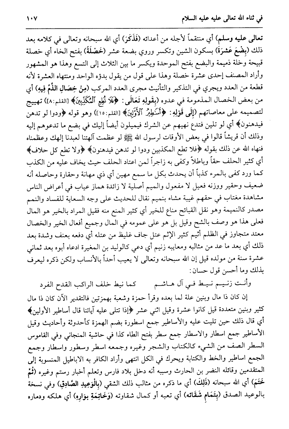 تعالى عليه وسلّم) أي منتقما لأجله من أعدائه (فذكر) أي الله سبحانه وتعالى في كلامه بعد ذلك (بضع عشرة) بسكون الشين وتكسر وروي بضعة عشر (خصلة) بفتح الخاء أي خصلة قبيحة وخلة ذميمة والبضع بفتح الموحدة ويكسر ما بين الثلاث إلى التسع وهذا هو المشهور وأراد المصنف إحدى عشرة خصلة وهذا على قول من يقول بدؤه الواحد ومنتهاه العشرة لأنه قطعة من العدد ويجري في التذكير والتأنيث مجرى العدد المركب (من خصال الذّمّ فيه) أي من بعض الخصال المذمومة في عدوه (بقوله تعالى: فَلا تُطِعِ الْمُكَذِّبِينَ [القلم: 8] ) تهييج لتصميمه على معاصاتهم (إلى قوله: أَساطِيرُ الْأَوَّلِينَ [القلم: 15] ) وهو قوله وَدُّوا لَوْ تُدْهِنُ فَيُدْهِنُونَ أي لو تلين فتدع نهيهم عن الشرك فيميلون أيضا إليك في بضع ما تدعوهم إليه وذلك أن قريشا قالوا في بعض الأوقات لرسول الله صلى الله عليه وسلّم لو عظمت آلهتنا لعبدنا إلهك وعظمناه فنهاه الله عن ذلك بقوله فَلا تُطِعِ الْمُكَذِّبِينَ وَدُّوا لَوْ تُدْهِنُ فَيُدْهِنُونَ وَلا تُطِعْ كُلَّ حَلَّافٍ أي كثير الحلف حقا وباطلا وكفى به زاجرا لمن اعتاد الحلف حيث يخاف عليه من الكذب كما ورد كفى بالمرء كذبا أن يحدث بكل ما سمع مهين أي ذي مهانة وحقارة وحاصله أنه ضعيف وحقير ووزنه فعيل لا مفعول والميم أصلية لا زائدة هماز عياب في أعراض الناس مشاهدة مغتاب في حقهم غيبة مشاء بنميم نقال للحديث على وجه السعاية للفساد والنمم مصدر كالنميمة وهو نقل القبائح مناع للخير أي كثير المنع منه فقيل المراد بالخير هو المال فعلى هذا هو وصف بالشح وقيل بل هو على عمومه في المال وجميع أفعال الخير والخصال معتد متجاوز في الظلم أثيم كثير الإثم عتل جاف غليظ من عتله أي دفعه بعنف وشدة بعد ذلك أي بعد ما عد من مثالبه ومعايبه زنيم أي دعي كالوليد بن المغيرة ادعاه أبوه بعد ثماني عشرة سنة من مولده قيل إن الله سبحانه وتعالى لا يعيب أحدا بالأنساب ولكن ذكره ليعرف بذلك وما أحسن قول حسان: