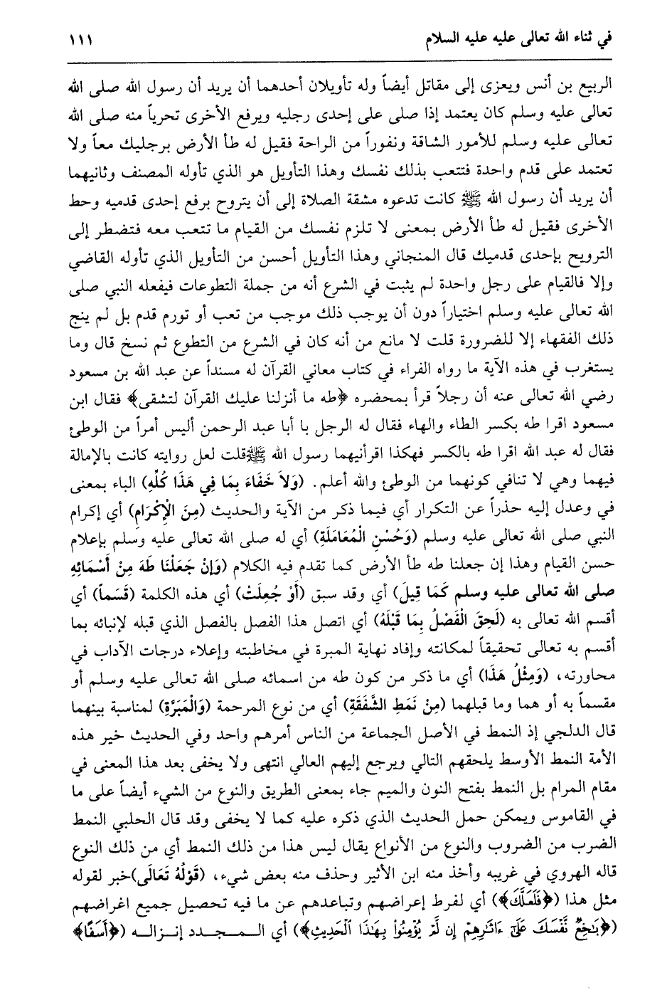 الربيع بن أنس ويعزى إلى مقاتل أيضا وله تأويلان أحدهما أن يريد أن رسول الله صلى الله تعالى عليه وسلم كان يعتمد إذا صلى على إحدى رجليه ويرفع الأخرى تحريا منه صلى الله تعالى عليه وسلم للأمور الشاقة ونفورا من الراحة فقيل له طأ الأرض برجليك معا ولا تعتمد على قدم واحدة فتتعب بذلك نفسك وهذا التأويل هو الذي تأوله المصنف وثانيهما أن يريد أن رسول الله صلى الله عليه وسلم كانت تدعوه مشقة الصلاة إلى أن يتروح برفع إحدى قدميه وحط الأخرى فقيل له طأ الأرض بمعنى لا تلزم نفسك من القيام ما تتعب معه فتضطر إلى الترويح بإحدى قدميك قال المنجاني وهذا التأويل أحسن من التأويل الذي تأوله القاضي وإلا فالقيام على رجل واحدة لم يثبت في الشرع أنه من جملة التطوعات فيفعله النبي صلى الله تعالى عليه وسلم اختيارا دون أن يوجب ذلك موجب من تعب أو تورم قدم بل لم ينج ذلك الفقهاء إلا للضرورة قلت لا مانع من أنه كان في الشرع من التطوع ثم نسخ قال وما يستغرب في هذه الآية ما رواه الفراء في كتاب معاني القرآن له مسندا عن عبد الله بن مسعود رضي الله تعالى عنه أن رجلا قرأ بمحضره طه ما أَنْزَلْنا عَلَيْكَ الْقُرْآنَ لِتَشْقى فقال ابن مسعود اقرا طه بكسر الطاء والهاء فقال له الرجل يا أبا عبد الرحمن أليس أمرا من الوطئ فقال له عبد الله اقرا طه بالكسر فهكذا اقرأنيهما رسول الله صلى الله عليه وسلّم قلت لعل روايته كانت بالإمالة فيهما وهي لا تنافي كونهما من الوطئ والله أعلم. (ولا خفاء بما في هذا كلّه) الباء بمعنى في وعدل إليه حذرا عن التكرار أي فيما ذكر من الآية والحديث (من الإكرام) أي إكرام النبي صلى الله تعالى عليه وسلم (وحسن المعاملة) أي له صلى الله تعالى عليه وسلم بإعلام حسن القيام وهذا إن جعلنا طه طأ الأرض كما تقدم فيه الكلام (وَإِنْ جَعَلْنَا طه مِنْ أَسْمَائِهِ صَلَّى اللَّهُ تعالى عليه وسلم كما قيل) أي وقد سبق (أو جعلت) أي هذه الكلمة (قسما) أي أقسم الله تعالى به (لحق الفضل بما قبله) أي اتصل هذا الفصل بالفصل الذي قبله لإنبائه بما أقسم به تعالى تحقيقا لمكانته وإفاد نهاية المبرة في مخاطبته وإعلاء درجات الآداب في محاورته، (ومثل هذا) أي ما ذكر من كون طه من اسمائه صلى الله تعالى عليه وسلم أو مقسما به أو هما وما قبلهما (من نمط الشّفقة) أي من نوع المرحمة (والمبرّة) لمناسبة بينهما قال الدلجي إذ النمط في الأصل الجماعة من الناس أمرهم واحد وفي الحديث خير هذه الأمة النمط الأوسط يلحقهم التالي ويرجع إليهم العالي انتهى ولا يخفى بعد هذا المعنى في مقام المرام بل النمط بفتح النون والميم جاء بمعنى الطريق والنوع من الشيء أيضا على ما في القاموس ويمكن حمل الحديث الذي ذكره عليه كما لا يخفى وقد قال الحلبي النمط الضرب من الضروب والنوع من الأنواع يقال ليس هذا من ذلك النمط أي من ذلك النوع قاله الهروي في غريبه وأخذ منه ابن الأثير وحذف منه بعض شيء، (قوله تعالى) خبر لقوله مثل هذا (فَلَعَلَّكَ) أي لفرط إعراضهم وتباعدهم عن ما فيه تحصيل جميع اغراضهم (باخِعٌ نَفْسَكَ عَلى آثارِهِمْ إِنْ لَمْ يُؤْمِنُوا بِهذَا الْحَدِيثِ) أي المجدد إنزاله (أَسَفاً