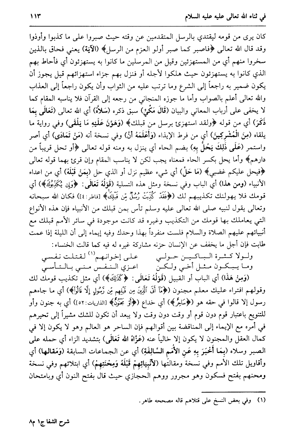 (ومن هذا) أي الباب أو القبيل (قوله تعالى: كَذلِكَ) أي مثل تكذيب قومك لك وقولهم افتراء عليك معلم مجنون (مَا أَتَى الَّذِينَ مِنْ قَبْلِهِمْ مِنْ رَسُولٍ إِلَّا قالُوا) أي ما جاءهم رسول إلا قالوا في حقه هو (ساحِرٌ) أي خداع (أَوْ مَجْنُونٌ [الذاريات: 52] ) أي به جنون وأو للتنويع باعتبار قوم دون قوم أو وقت دون وقت ولا يبعد أن تكون للشك مشيرا إلى تحيرهم في أمره مع الإيماء إلى المناقضة بين أقوالهم فإن الساحر هو العالم وهو لا يكون إلا في كمال العقل والمجنون لا يكون إلا خاليا عنه (عزّاه الله تعالى) بتشديد الزاء أي حمله على الصبر وسلاه (بما أخبر به عن الأمم السّالفة) أي عن الجماعات السابقة (ومقالها) أي وأقاويل تلك الأمم وفي نسخة ومقالتها (لأنبيائهم قبله ومحنتهم) أي ابتلائهم وفي نسخة ومحنهم بفتح فسكون وهو مجرور ووهم الحجازي حيث قال بفتح النون أي وبامتحان