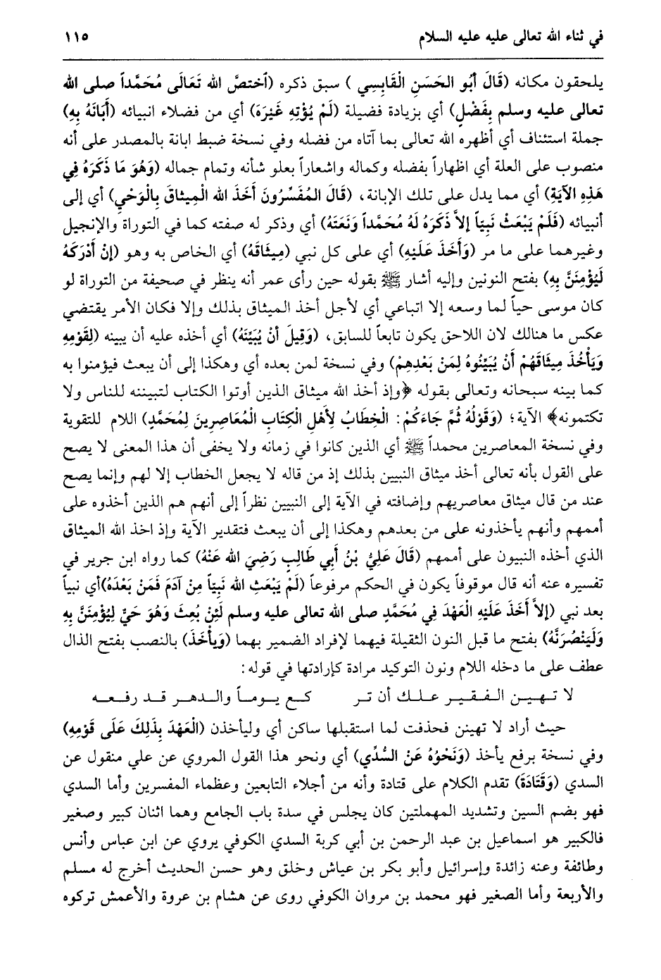 يلحقون مكانه (قال أبو الحسن القابسي) سبق ذكره (اختصّ الله تعالى محمّدا صلى الله تعالى عليه وسلم بفضل) أي بزيادة فضيلة (لم يؤته غيره) أي من فضلاء انبيائه (أبانه به) جملة استئناف أي أظهره الله تعالى بما آتاه من فضله وفي نسخة ضبط ابانة بالمصدر على أنه منصوب على العلة أي اظهارا بفضله وكماله واشعارا بعلو شأنه وتمام جماله (وهو ما ذكره في هذه الآية) أي مما يدل على تلك الإبانة، (قال المفسّرون أخذ الله الميثاق بالوحي) أي إلى أنبيائه (فلم يبعث نبيّا إلّا ذكره له محمّدا ونعته) أي وذكر له صفته كما في التوراة والإنجيل وغيرهما على ما مر (وأخذ عليه) أي على كل نبي (ميثاقه) أي الخاص به وهو (إن أدركه ليؤمننّ به) بفتح النونين وإليه أشار صلى الله عليه وسلّم بقوله حين رأى عمر أنه ينظر في صحيفة من التوراة لو كان موسى حيا لما وسعه إلا اتباعي أي لأجل أخذ الميثاق بذلك وإلا فكان الأمر يقتضي عكس ما هنالك لان اللاحق يكون تابعا للسابق، (وقيل أن يبيّنه) أي أخذه عليه أَنْ يُبَيِّنَهُ (لِقَوْمِهِ وَيَأْخُذَ مِيثَاقَهُمْ أَنْ يُبَيِّنُوهُ لمن بعدهم) وفي نسخة لمن بعده أي وهكذا إلى أن يبعث فيؤمنوا به كما بينه سبحانه وتعالى بقوله وَإِذْ أَخَذَ اللَّهُ مِيثاقَ الَّذِينَ أُوتُوا الْكِتابَ لَتُبَيِّنُنَّهُ لِلنَّاسِ وَلا تَكْتُمُونَهُ الآية؛ (وَقَوْلُهُ ثُمَّ جَاءَكُمْ: الْخِطَابُ لِأَهْلِ الْكِتَابِ الْمُعَاصِرِينَ لمحمّد) اللام للتقوية وفي نسخة المعاصرين محمدا صلى الله عليه وسلّم أي الذين كانوا في زمانه ولا يخفى أن هذا المعنى لا يصح على القول بأنه تعالى أخذ ميثاق النبيين بذلك إذ من قاله لا يجعل الخطاب إلا لهم وإنما يصح عند من قال ميثاق معاصريهم وإضافته في الآية إلى النبيين نظرا إلى أنهم هم الذين أخذوه على أممهم وأنهم يأخذونه على من بعدهم وهكذا إلى أن يبعث فتقدير الآية وإذ اخذ الله الميثاق الذي أخذه النبيون على أممهم (قَالَ عَلِيُّ بْنُ أَبِي طَالِبٍ رَضِيَ اللَّهُ عنه) كما رواه ابن جرير في تفسيره عنه أنه قال موقوفا يكون في الحكم مرفوعا (لَمْ يَبْعَثِ اللَّهُ نَبِيًّا مِنْ آدَمَ فَمَنْ بعده) أي نبيا بعد نبي (إِلَّا أَخَذَ عَلَيْهِ الْعَهْدَ فِي مُحَمَّدٍ صَلَّى الله تعالى عَلَيْهِ وَسَلَّمَ لَئِنْ بُعِثَ وَهُوَ حَيٌّ لِيُؤْمِنَنَّ به ولينصرنّه) بفتح ما قبل النون الثقيلة فيهما لإفراد الضمير بهما (ويأخذ) بالنصب بفتح الذال عطف على ما دخله اللام ونون التوكيد مرادة كإرادتها في قوله: