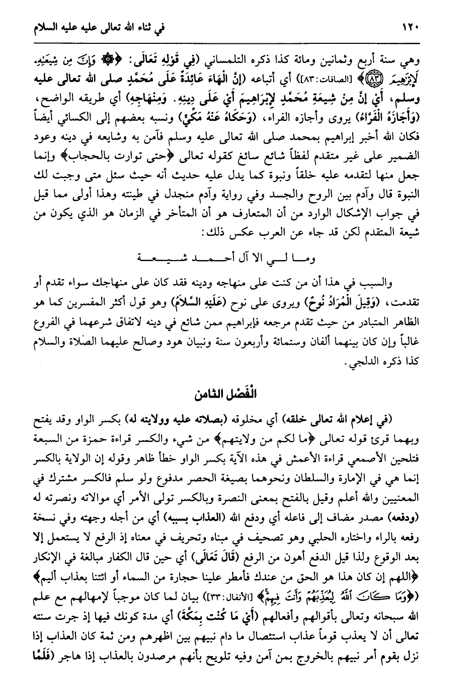 وهي سنة أربع وثمانين ومائة كذا ذكره التلمساني (فِي قَوْلِهِ تَعَالَى: * وَإِنَّ مِنْ شِيعَتِهِ لَإِبْراهِيمَ (83) [الصافات: 83] ) أي أتباعه (إِنَّ الْهَاءَ عَائِدَةٌ عَلَى مُحَمَّدٍ صَلَّى اللَّهُ تعالى عَلَيْهِ وَسَلَّمَ، أَيْ إِنَّ مِنْ شِيعَةِ مُحَمَّدٍ لإبراهيم أي على دينه. ومنهاجه) أي طريقه الواضح، (وأجازه الفرّاء) يروى وأجازه الفراء، (وحكاه عنه مكّيّ) ونسبه بعضهم إلى الكسائي أيضا فكان الله أخبر إبراهيم بمحمد صلى الله تعالى عليه وسلم فآمن به وشايعه في دينه وعود الضمير على غير متقدم لفظا شائع سائغ كقوله تعالى حَتَّى تَوارَتْ بِالْحِجابِ وإنما جعل منها لتقدمه عليه خلقا ونبوة كما يدل عليه حديث أنه حيث سئل مَتَى وَجَبَتْ لَكَ النُّبُوَّةُ قَالَ وَآدَمُ بَيْنَ الروح والجسد وفي رواية وآدم منجدل في طينته وهذا أولى مما قيل في جواب الإشكال الوارد من أن المتعارف هو أن المتأخر في الزمان هو الذي يكون من شيعة المتقدم لكن قد جاء عن العرب عكس ذلك:
