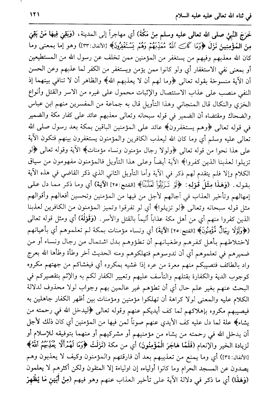 خرج النّبيّ صلى الله تعالى عليه وسلم من مكّة) أي مهاجرا إلى المدينة، (وبقي فيها من بقي مِنَ الْمُؤْمِنِينَ نَزَلَ وَما كانَ اللَّهُ مُعَذِّبَهُمْ وَهُمْ يَسْتَغْفِرُونَ [الأنفال: 33] ) وهو إما بمعنى وما كان الله معذبهم وفيهم من يستغفر من المؤمنين ممن تخلف عن رسول الله من المستطيعين أو بمعنى نفي الاستغفار أي ولو كانوا ممن يؤمن ويستغفر من الكفر لما عذبهم وعن الحسن أن الآية منسوخة بقوله تعالى وَما لَهُمْ أَلَّا يُعَذِّبَهُمُ اللَّهُ والظاهر أن لا تنافي بينهما إذ النفي منصب على عذاب الاستئصال والإثبات محمول على غيره من الاسر والقتل وأنواع الخزي والنكال قال المنجاني وهذا التأويل قال به جماعة من المفسرين منهم ابن عباس والضحاك ومقتضاه أن الضمير في قوله سبحانه وتعالى معذبهم عائد على كفار مكة والضمير في قوله تعالى وَهُمْ يَسْتَغْفِرُونَ عائد على المؤمنين الباقين بمكة بعد رسول صلى الله تعالى عليه وسلم أي وما كان الله ليعذب الكافرين والمؤمنون يستغفرون بينهم فتكون الآية على هذا نحوا من قوله تعالى وَلَوْلا رِجالٌ مُؤْمِنُونَ وَنِساءٌ مُؤْمِناتٌ الآية وقوله تعالى لَوْ تَزَيَّلُوا لَعَذَّبْنَا الَّذِينَ كَفَرُوا الآية أيضا وعلى هذا التأويل فالمؤمنون مفهومون من سياق الكلام وإلا فلم يتقدم لهم ذكر في الآية وأما التأويل الثاني الذي ذكر القاضي في هذه الآية بقوله. (وَهَذَا مِثْلَ قَوْلِهِ: لَوْ تَزَيَّلُوا لَعَذَّبْنَا [الْفَتْحِ: 25] الآية) أي وما ذكر مما دل على إمهالهم وتأخير العذاب في آجالهم لأجل من فيها من المؤمنين وتحسين أفعالهم وأقوالهم مثل قوله سبحانه وتعالى لَوْ تَزَيَّلُوا أي لو تفرقوا وتميز المؤمنون من الكافرين لعذبنا الذين كفروا منهم أي من أهل مكة عذابا أليما بالقتل والأسر. (وقوله) أي ومثل قوله تعالى (وَلَوْلا رِجالٌ مُؤْمِنُونَ [الفتح: 25] الآية) أي ونساء مؤمنات بمكة لم تعلموهم أي بأعيانهم لاختلاطهم بأهل كفرهم وطغيانهم أن تطؤوهم بدل اشتمال من رجال ونساء أو من ضمير هم في تعلموهم أي أن تدوسوهم فتهلكوهم ومنه الحديث آخر وطأة وطأها الله بعرج واد بالطائف فتصيبكم منهم معرة من عره إذا غشيه بمكروه أي فيغشاكم من جهتهم مكروه كوجوب الدية والكفارة بقتلهم والتأسف عليهم وتعيير الكفار لكم به والإثم بتقصيركم في البحث عنهم بغير علم حال أي أن تطؤهم غير عالمين بهم وجواب لولا محذوف لدلالة الكلام عليه والمعنى لولا كراهة أن تهلكوا مؤمنين ومؤمنات بين أظهر الكفار جاهلين به فيصيبهم مكروه بإهلاكهم لما كف أيديكم عنهم وقوله تعالى لِيُدْخِلَ اللَّهُ فِي رَحْمَتِهِ مَنْ يَشاءُ علة لما دل عليه كف الأيدي عنهم صونا لمن فيها من المؤمنين أي كان ذلك لأجل أن يدخل الله في رحمته من يشاء من مؤمنيهم أو مشركيهم أو منهما بتوفيقه للإسلام أو لزيادة الخير والإنعام (فلمّا هاجر المؤمنون) أي من مكة (نَزَلَتْ وَما لَهُمْ أَلَّا يُعَذِّبَهُمُ اللَّهُ [الْأَنْفَالِ: 34] ) أي وما يمنع من تعذيبهم بعد أن فارقتهم والمؤمنون وكيف لا يعذبون وهم يصدون عن المسجد الحرام وما كانوا أولياءه إن اولياءة إلا المتقون ولكن أكثرهم لا يعلمون (وهذا) أي ما ذكر في دلالة الآية على تأخير العذاب عنهم وهو فيهم (من أبين ما يظهر