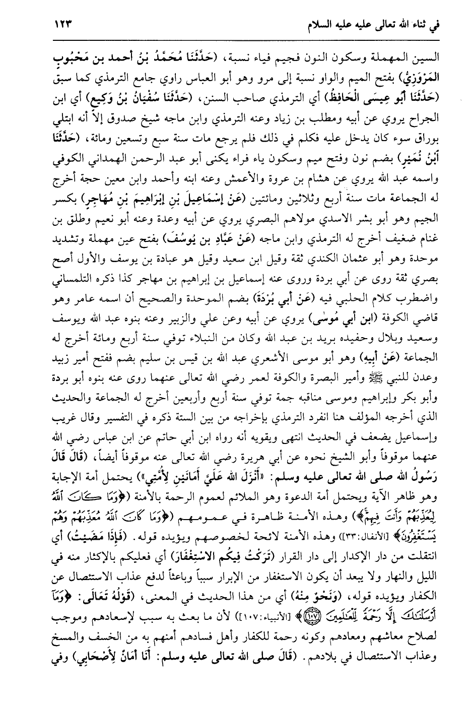 السين المهملة وسكون النون فجيم فياء نسبة، (حدّثنا محمّد بن أحمد بن محبوب المروزيّ) بفتح الميم والواو نسبة إلى مرو وهو أبو العباس راوي جامع الترمذي كما سبق (حدّثنا أبو عيسى الحافظ) أي الترمذي صاحب السنن، (حدّثنا سفيان بن وكيع) أي ابن الجراح يروي عن أبيه ومطلب بن زياد وعنه الترمذي وابن ماجه شيخ صدوق إلا أنه ابتلي بوراق سوء كان يدخل عليه فكلم في ذلك فلم يرجع مات سنة سبع وتسعين ومائة، (حدّثنا ابن نمير) بضم نون وفتح ميم وسكون ياء فراء يكنى أبو عبد الرحمن الهمداني الكوفي واسمه عبد الله يروي عن هشام بن عروة والأعمش وعنه ابنه وأحمد وابن معين حجة أخرج له الجماعة مات سنة أربع وثلاثين ومائتين (عن إسماعيل بن إبراهيم بن مهاجر) بكسر الجيم وهو أبو بشر الاسدي مولاهم البصري يروي عن أبيه وعدة وعنه أبو نعيم وطلق بن غنام ضغيف أخرج له الترمذي وابن ماجه (عن عبّاد بن يوسف) بفتح عين مهملة وتشديد موحدة وهو أبو عثمان الكندي ثقة وقيل ابن سعيد وقيل هو عبادة بن يوسف والأول أصح بصري ثقة روى عن أبي بردة وروى عنه إسماعيل بن إبراهيم بن مهاجر كذا ذكره التلمساني واضطرب كلام الحلبي فيه (عن أبي بردة) بضم الموحدة والصحيح أن اسمه عامر وهو قاضي الكوفة (ابن أبي موسى) يروي عن أبيه وعن علي والزبير وعنه بنوه عبد الله ويوسف وسعيد وبلال وحفيده بريد بن عبد الله وكان من النبلاء توفي سنة أربع ومائة أخرج له الجماعة (عن أبيه) وهو أبو موسى الأشعري عبد الله بن قيس بن سليم بضم ففتح أمير زبيد وعدن للنبي صلى الله عليه وسلّم وأمير البصرة والكوفة لعمر رضي الله تعالى عنهما روى عنه بنوه أبو بردة وأبو بكر وإبراهيم وموسى مناقبه جمة توفي سنة أربع وأربعين أخرج له الجماعة والحديث الذي أخرجه المؤلف هنا انفرد الترمذي بإخراجه من بين الستة ذكره في التفسير وقال غريب وإسماعيل يضعف في الحديث انتهى ويقويه أنه رواه ابن أبي حاتم عن ابن عباس رضي الله عنهما موقوفا وأبو الشيخ نحوه عن أبي هريرة رضي الله تعالى عنه موقوفا أيضا، (قال قال رسول الله صلى الله تعالى عَلَيْهِ وَسَلَّمَ: «أَنْزَلَ اللَّهُ عَلَيَّ أَمَانَيْنِ لِأُمَّتِي» ) يحتمل أمة الإجابة وهو ظاهر الآية ويحتمل أمة الدعوة وهو الملائم لعموم الرحمة بالأمنة (وَما كانَ اللَّهُ لِيُعَذِّبَهُمْ وَأَنْتَ فِيهِمْ) وهذه الأمنة ظاهرة في عمومهم (وَما كانَ اللَّهُ مُعَذِّبَهُمْ وَهُمْ يَسْتَغْفِرُونَ [الْأَنْفَالِ: 33] ) وهذه الأمنة لائحة لخصوصهم ويؤيده قوله. (فإذا مضيت) أي انتقلت من دار الإكدار إلى دار القرار (تركت فيكم الاستغفار) أي فعليكم بالإكثار منه في الليل والنهار ولا يبعد أن يكون الاستغفار من الإبرار سببا وباعثا لدفع عذاب الاستئصال عن الكفار ويؤيده قوله، (ونحو منه) أي من هذا الحديث في المعنى، (قَوْلُهُ تَعَالَى: وَما أَرْسَلْناكَ إِلَّا رَحْمَةً لِلْعالَمِينَ (107) [الأنبياء: 107] ) لأن ما بعث به سبب لإسعادهم وموجب لصلاح معاشهم ومعادهم وكونه رحمة للكفار وأهل فسادهم أمنهم به من الخسف والمسخ وعذاب الاستئصال في بلادهم. (قال صلى الله تعالى عليه وسلم: أنا أمان لأصحابي) وفي