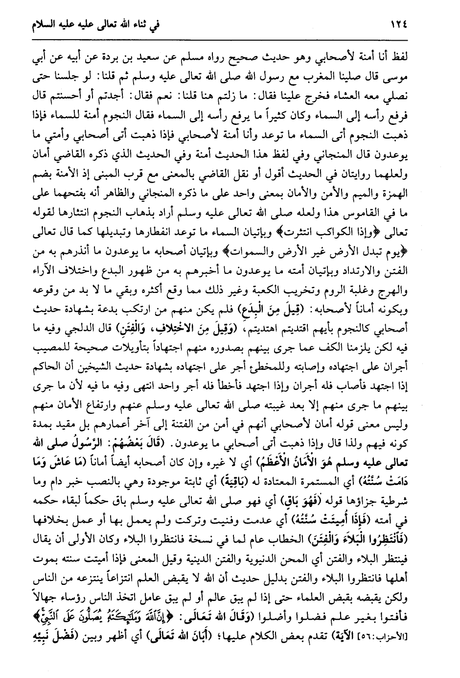 لفظ أنا أمنة لأصحابي وهو حديث صحيح رواه مسلم عن سعيد بن بردة عن أبيه عن أبي موسى قال صلينا المغرب مع رسول الله صلى الله تعالى عليه وسلم ثم قلنا: لو جلسنا حتى نصلي معه العشاء فخرج علينا فقال: ما زلتم هنا قلنا: نعم فقال: أجدتم أو أحسنتم قال فرفع رأسه إلى السماء وكان كثيرا ما يرفع رأسه إلى السماء فقال النجوم أمنة للسماء فإذا ذهبت النجوم أتى السماء ما توعد وأنا أمنة لأصحابي فإذا ذهبت أتى أصحابي وأمتي ما يوعدون قال المنجاني وفي لفظ هذا الحديث أمنة وفي الحديث الذي ذكره القاضي أمان ولعلهما روايتان في الحديث أقول أو نقل القاضي بالمعنى مع قرب المبنى إذ الأمنة بضم الهمزة والميم والأمن والأمان بمعنى واحد على ما ذكره المنجاني والظاهر أنه بفتحهما على ما في القاموس هذا ولعله صلى الله تعالى عليه وسلم أراد بذهاب النجوم انتثارها لقوله تعالى وَإِذَا الْكَواكِبُ انْتَثَرَتْ وبإتيان السماء ما توعد انفطارها وتبديلها كما قال تعالى يَوْمَ تُبَدَّلُ الْأَرْضُ غَيْرَ الْأَرْضِ وَالسَّماواتُ وبإتيان أصحابه ما يوعدون ما أنذرهم به من الفتن والارتداد وبإتيان أمته ما يوعدون ما أخبرهم به من ظهور البدع واختلاف الآراء والهرج وغلبة الروم وتخريب الكعبة وغير ذلك مما وقع أكثره وبقي ما لا بد من وقوعه وبكونه أمانا لأصحابه: (قيل من البدع) فلم يكن منهم من ارتكب بدعة بشهادة حديث أصحابي كالنجوم بأيهم اقتديتم اهتديتم، (وقيل من الاختلاف، والفتن) قال الدلجي وفيه ما فيه لكن يلزمنا الكف عما جرى بينهم بصدوره منهم اجتهادا بتأويلات صحيحة للمصيب أجران على اجتهاده وإصابته وللمخطئ أجر على اجتهاده بشهادة حديث الشيخين أن الحاكم إذا اجتهد فأصاب فله أجران وإذا اجتهد فأخطأ فله أجر واحد انتهى وفيه ما فيه لأن ما جرى بينهم ما جرى منهم إلا بعد غيبته صلى الله تعالى عليه وسلم عنهم وارتفاع الأمان منهم وليس معنى قوله أمان لأصحابي أنهم في أمن من الفتنة إلى آخر أعمارهم بل مقيد بمدة كونه فيهم ولذا قال وإذا ذهبت أتى أصحابي ما يوعدون. (قال بعضهم: الرّسول صلى الله تعالى عليه وسلم هو الأمان الأعظم) أي لا غيره وإن كان أصحابه أيضا أمانا (ما عاش وما دامت سنّته) أي المستمرة المعتادة له (باقية) أي ثابتة موجودة وهي بالنصب خبر دام وما شرطية جزاؤها قوله (فهو باق) أي فهو صلى الله تعالى عليه وسلم باق حكما لبقاء حكمه في أمته (فإذا أميتت سنّته) أي عدمت وفنيت وتركت ولم يعمل بها أو عمل بخلافها (فانتظروا البلاء والفتن) الخطاب عام لما في نسخة فانتظروا البلاء وكان الأولى أن يقال فينتظر البلاء والفتن أي المحن الدنيوية والفتن الدينية وقيل المعنى فإذا أميتت سنته بموت أهلها فانتظروا البلاء والفتن بدليل حديث أن الله لا يقبض العلم انتزاعا ينتزعه من الناس ولكن يقبضه بقبض العلماء حتى إذا لم يبق عالم أو لم يبق عامل اتخذ الناس رؤساء جهالا فأفتوا بغير علم فضلوا وأضلوا (وَقَالَ اللَّهُ تَعَالَى: إِنَّ اللَّهَ وَمَلائِكَتَهُ يُصَلُّونَ عَلَى النَّبِيِّ [الأحزاب: 56] الآية) تقدم بعض الكلام عليها؛ (أبان الله تعالى) أي أظهر وبين (فضل نبيّه