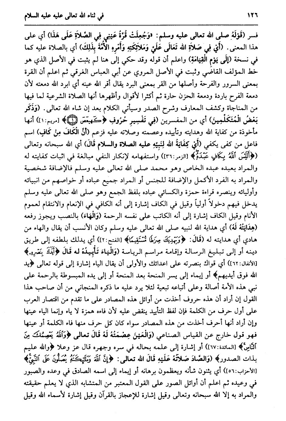 فسر (قوله صلى الله تعالى عَلَيْهِ وَسَلَّمَ: «وَجُعِلَتْ قُرَّةُ عَيْنِي فِي الصَّلَاةِ على هذا) أي على هذا المعنى. (أَيْ فِي صَلَاةِ اللَّهِ تَعَالَى عَلَيَّ وَمَلَائِكَتِهِ وأمره الأمّة بذلك) أي بالصلاة عليه كما في نسخة (إلى يوم القيامة) واعلم أن قوله وقد حكي إلى هنا لم يثبت في الأصل الذي هو خط المؤلف القاضي وثبت في الأصل المروي عن أبي العباس الغرقي ثم اعلم أن القرة بمعنى السرور والفرحة وأصلها من القر بمعنى البرد يقال أقر الله عينه أي ابرد الله دمعته لأن دمعة الفرح باردة ودمعة الحزن حارة ثم أكثرا لأقوال وأظهرها أنها الصلاة الشرعية لما فيها من المناجاة وكشف المعارف وشرح الصدر وسيأتي الكلام بعد إن شاء الله تعالى. (وذكر بعض المتكلّمين) أي من المفسرين (في تفسير حروف كهيعص (1) [مريم: 1] أنها مأخوذة من كفاية الله وهدايته وتأييده وعصمته وصلاته عليه فزعم (أنّ الكاف من كاف) اسم فاعل من كفى يكفي (أي كفاية الله لنبيّه عليه الصلاة والسلام قال) أي الله سبحانه وتعالى (أَلَيْسَ اللَّهُ بِكافٍ عَبْدَهُ [الزمر: 36] ) واستفهامه لإنكار النفي مبالغة في اثبات كفايته له والمراد بعبده عبده الخاص وهو محمد صلى الله تعالى عليه وسلم فالإضافة شخصية والمراد به الفرد الأكمل والإضافة للجنس أو المراد جميع عباده أو خواصهم من انبيائه وأوليائه وينصره قراءة حمزة والكسائي عباده بلفظ الجمع وهو صلى الله تعالى عليه وسلم يدخل فيهم دخولا أوليا وقيل في الكاف إشارة إلى أنه الكافي في الإنعام والانتقام لعموم الأنام وقيل الكاف إشارة إلى أنه الكاتب على نفسه الرحمة (والهاء) بالنصب ويجوز رفعه (هدايته له) أي هداية الله لنبيه صلى الله تعالى عليه وسلم وكان الأنسب أن يقال والهاء من هادي أي هِدَايَتُهُ لَهُ (قَالَ: وَيَهْدِيَكَ صِراطاً مُسْتَقِيماً [الْفَتْحِ: 2] ) أي يدلك بلطفه إلى طريق دينه أو إلى تبليغ الرسالة وإقامة مراسم الرياسة (والياء تأييده له قال أَيَّدَكَ بِنَصْرِهِ [الأنفال: 62] ) أي قواك بنصرته على اعدائك والأولى أن يقال الياء إشارة إِلَى قَوْلِهِ تَعَالَى يَدُ اللَّهِ فَوْقَ أَيْدِيهِمْ أو إيماء إلى يسر المنحة بعد المنحة أو إلى يده المبسوطة بالرحمة على نبي هذه الأمة أصالة وعلى أتباعه تبعية لئلا يرد عليه ما ذكره المنجاني من أن صاحب هذا القول إن أراد أن هذه حروف أخذت من أوائل هذه المصادر على ما تقدم من اقتصار العرب على أول حرف من الكلمة فإن لفظ التأييد ينقض عليه لأن فاءه همزة لا ياء وإنما الياء عينها وإن أراد أنها أحرف أخذت من هذه المصادر سواء كان كل حرف منها فاء الكلمة أو عينها فهو قول خارج عن القياس الصناعي (والعين عصمته له قال تعالى وَاللَّهُ يَعْصِمُكَ مِنَ النَّاسِ [المائدة: 67] ) أو إشارة إلى علمه بحاله في سره وجهره قال عز وعلا وَاللَّهُ عَلِيمٌ بِذاتِ الصُّدُورِ (والصّاد صلاته عليه قَالَ اللَّهُ تَعَالَى: إِنَّ اللَّهَ وَمَلائِكَتَهُ يُصَلُّونَ عَلَى النَّبِيِّ [الأحزاب: 56] ) أي يثنون شأنه ويعظمون برهانه أو إيماء إلى اسمه الصادق في وعده والصبور في وعيده ثم اعلم أن أوائل الصور على القول المعتبر من المتشابه الذي لا يعلم حقيقته والمراد به إلا الله سبحانه وتعالى وقيل إشارة للإعجاز بالقرآن وقيل إشارة لأسماء الله وقيل