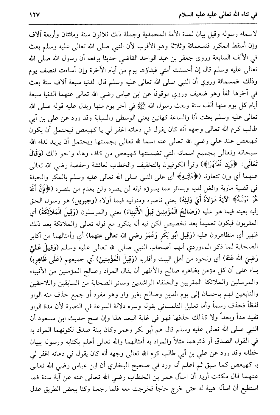 لاسماء رسوله وقيل بيان لمدة الأمة المحمدية وجملة ذلك ثلاثون سنة ومائتان وأربعة آلاف وإن أسقط المكرر فتسعمائة وثلاثة وهو الأقرب لأن النبي صلى الله تعالى عليه وسلم بعث في الألف السابعة وروى جعفر بن عبد الواحد القاضي حديثا يرفعه أن رسول الله صلى الله تعالى عليه وسلم قال إن أحسنت أمتي فبقاؤها يوم من أيام الآخرة وإن أساءت فنصف يوم وذلك خمسمائة وروي أن النبي صلى الله تعالى عليه وسلم قال الدنيا سبعة آلاف سنة بعث في آخرها الفا وهو ضعيف وروي موقوفا عن ابن عباس رضي الله تعالى عنهما الدنيا سبعة أيام كل يوم منها ألف سنة وبعث رسول الله صلى الله عليه وسلم في آخر يوم منها ويدل عليه قوله صلى الله تعالى عليه وسلم بعثت أنا والساعة كهاتين يعني الوسطى والسبابة وقد ورد عن علي بن أبي طالب كرم الله تعالى وجهه أنه كان يقول في دعائه اغفر لي يا كهيعص فيحتمل أن يكون كهيعص عند علي رضي الله تعالى عنه اسما لله تعالى بجملتها ويحتمل أن يريد نداء الله سبحانه وتعالى بجميع اسمائه التي تضمنتها كهيعص من كاف وهاء ونحو ذلك (وقال تعالى: وَإِنْ تَظاهَرا) وقرأ الكوفيون بالتخفيف والخطاب لعائشة وحفصة رضي الله تعالى عنهما أي وإن تتعاونا (عَلَيْهِ أي على النبي صلى الله تعالى عليه وسلم بالمكر والحيلة في قضية مارية والغل لديه وبسائر مما يسوؤه فإنه لن يضره ولن يعدم من ينصره (فَإِنَّ اللَّهَ هُوَ مَوْلاهُ الآية مولاه أي وليّه) يعني ناصره ومتوليه فيما أولاه (وجبريل) هو رسول الحق إليه يعينه فيما هو عليه (وصالح المؤمنين قيل الأنبياء) يعني والمرسلون (وقيل الملائكة) أي المقربون فيكون تعميما بعد تخصيص لكن فيه أنه يتكرر مع قوله تعالى والملائكة بعد ذلك ظهير أي متظاهرون عليه (وقيل أبو بكر وعمر رضي الله تعالى عنهما) أي وأمثالهما من أكابر الصحابة لما ذكر الماوردي أنهم أصحاب النبي صلى الله تعالى عليه وسلم (وقيل عليّ رضي الله عنه) أي ونحوه من أهل البيت وأقاربه (وقيل المؤمنين) أي جميعهم (على ظاهره) بناء على أن كل مؤمن بظاهره صالح والأظهر أن يقال المراد وصالح المؤمنين من الأنبياء والمرسلين والملائكة المقربين والخلفاء الراشدين وسائر الصحابة من السابقين واللاحقين والتابعين لهم بإحسان إلى يوم الدين وصالح بغير واو وهو مفرد أو جمع حذف منه الواو لفظا فحذف رسما وأما تعليل التلمساني بقوله وسره دلالة السرعة في النصرة لأن مدة الواو تفيد مدا وبعدا ولا كذلك حذفها فهو في غاية البعد هذا وإن صح حديث ابن مسعود أن النبي صلى الله تعالى عليه وسلم قال هم أبو بكر وعمر وكان بينة صدق لكونهما المراد به في القول الصدق أو ذكرهما مثلا والمراد به أمثالهما والله تعالى أعلم بكتابه ورسوله ببيان خطابه وقد ورد عن علي بن أبي طالب كرم الله تعالى وجهه أنه كان يقول في دعائه اغفر لي يا كهيعص كما سبق ثم اعلم أنه ورد في صحيح البخاري أن ابن عباس رضي الله تعالى عنهما قال مكثت أريد أن اسأل عمر بن الخطاب رضي الله تعالى عنه عن آية سنة فما استطيع أن اسأله هيبة له حتى خرج حاجا فخرجت معه فلما رجعنا وكنا ببعض الطريق عدل