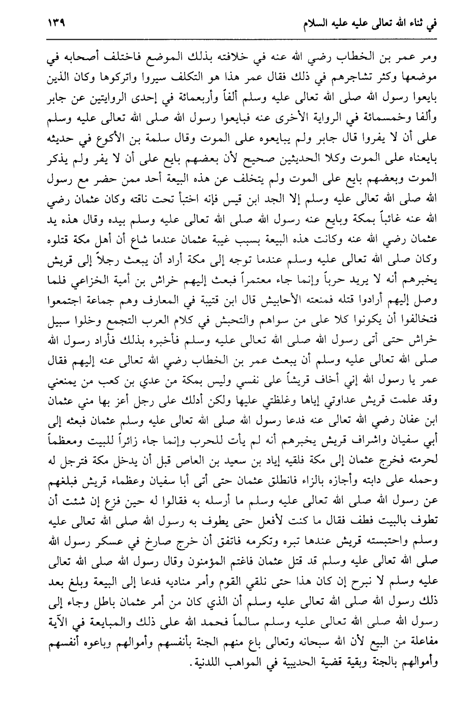 ومر عُمَرُ بْنُ الْخَطَّابِ رَضِيَ اللَّهُ عَنْهُ فِي خلافته بذلك الموضع فاختلف أصحابه في موضعها وكثر تشاجرهم في ذلك فقال عمر هذا هو التكلف سيروا واتركوها وكان الذين بايعوا رسول الله صلى الله تعالى عليه وسلم ألفا وأربعمائة في إحدى الروايتين عن جابر وألفا وخمسمائة في الرواية الأخرى عنه فبايعوا رسول الله صلى الله تعالى عليه وسلم على أن لا يفروا قال جابر ولم يبايعوه على الموت وقال سلمة بن الأكوع في حديثه بايعناه على الموت وكلا الحديثين صحيح لأن بعضهم بايع على أن لا يفر ولم يذكر الموت وبعضهم بايع على الموت ولم يتخلف عن هذه البيعة أحد ممن حضر مع رسول الله صلى الله تعالى عليه وسلم إلا الجد ابن قيس فإنه اختبأ تحت ناقته وكان عثمان رضي الله عنه غائبا بمكة وبايع عنه رسول الله صلى الله تعالى عليه وسلم بيده وقال هذه يد عثمان رضي الله عنه وكانت هذه البيعة بسبب غيبة عثمان عند ما شاع أن أهل مكة قتلوه وكان صلى الله تعالى عليه وسلم عندما توجه إلى مكة أراد أن يبعث رجلا إلى قريش يخبرهم أنه لا يريد حربا وإنما جاء معتمرا فبعث إليهم خراش بن أمية الخزاعي فلما وصل إليهم أرادوا قتله فمنعته الأحابيش قال ابن قتيبة في المعارف وهم جماعة اجتمعوا فتخالفوا أن يكونوا كلا على من سواهم والتحبش في كلام العرب التجمع وخلوا سبيل خراش حتى أتى رسول الله صلى الله تعالى عليه وسلم فأخبره بذلك فأراد رسول الله صلى الله تعالى عليه وسلم أن يبعث عمر بن الخطاب رضي الله تعالى عنه إليهم فقال عمر يا رسول الله إني أخاف قريشا على نفسي وليس بمكة من عدي بن كعب من يمنعني وقد علمت قريش عداوتي إياها وغلظتي عليها ولكن أدلك على رجل أعز بها مني عثمان ابن عفان رضي الله تعالى عنه فدعا رسول الله صلى الله تعالى عليه وسلم عثمان فبعثه إلى أبي سفيان واشراف قريش يخبرهم أنه لم يأت للحرب وإنما جاء زائرا للبيت ومعظما لحرمته فخرج عثمان إلى مكة فلقيه إياد بن سعيد بن العاص قبل أن يدخل مكة فترجل له وحمله على دابته وأجازه بالزاء فانطلق عثمان حتى أتى أبا سفيان وعظماء قريش فبلغهم عَنْ رَسُولِ اللَّهِ صَلَّى اللَّهُ تَعَالَى عَلَيْهِ وسلم ما أرسله به فقالوا له حين فزع إن شئت أن تطوف بالبيت فطف فقال مَا كُنْتُ لِأَفْعَلَ حَتَّى يَطُوفَ بِهِ رَسُولُ الله صلى الله تعالى عليه وسلم واحتبسته قريش عندها تبره وتكرمه فاتفق أن خرج صارخ في عسكر رسول الله صلى الله تعالى عليه وسلم قد قتل عثمان فاغتم المؤمنون وقال رسول الله صلى الله تعالى عليه وسلم لا نبرح إن كان هذا حتى نلقي القوم وأمر مناديه فدعا إلى البيعة وبلغ بعد ذلك رسول الله صلى الله تعالى عليه وسلم أن الذي كان من أمر عثمان باطل وجاء إلى رسول الله صلى الله تعالى عليه وسلم سالما فحمد الله على ذلك والمبايعة في الآية مفاعلة من البيع لأن الله سبحانه وتعالى باع منهم الجنة بأنفسهم وأموالهم وباعوه أنفسهم وأموالهم بالجنة وبقية قضية الحديبية في المواهب اللدنية.