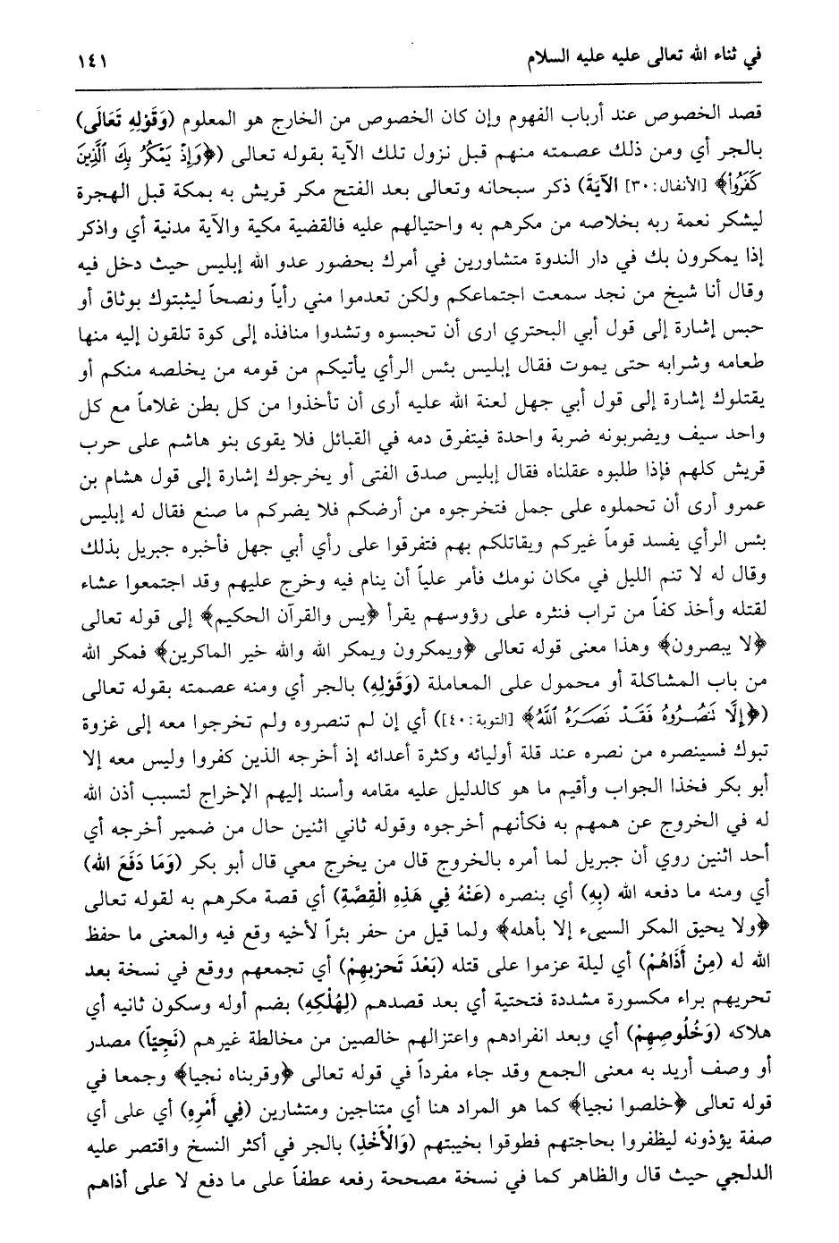 قصد الخصوص عند أرباب الفهوم وإن كان الخصوص من الخارج هو المعلوم (وقوله تعالى) بالجر أي ومن ذلك عصمته منهم قبل نزول تلك الآية بقوله تَعَالَى (وَإِذْ يَمْكُرُ بِكَ الَّذِينَ كَفَرُوا [الْأَنْفَالِ: 30] الآية) ذكر سبحانه وتعالى بعد الفتح مكر قريش به بمكة قبل الهجرة ليشكر نعمة ربه بخلاصه من مكرهم به واحتيالهم عليه فالقضية مكية والآية مدنية أي واذكر إذا يمكرون بك في دار الندوة متشاورين في أمرك بحضور عدو الله إبليس حيث دخل فيه وقال أنا شيخ من نجد سمعت اجتماعكم ولكن تعدموا مني رأيا ونصحا ليثبتوك بوثاق أو حبس إشارة إلى قول أبي البحتري ارى أن تحبسوه وتشدوا منافذه إلى كوة تلقون إليه منها طعامه وشرابه حتى يموت فقال إبليس بئس الرأي يأتيكم من قومه من يخلصه منكم أو يقتلوك إشارة إلى قول أبي جهل لعنة الله عليه أرى أن تأخذوا من كل بطن غلاما مع كل واحد سيف ويضربونه ضربة واحدة فيتفرق دمه في القبائل فلا يقوى بنو هاشم على حرب قريش كلهم فإذا طلبوه عقلناه فقال إبليس صدق الفتى أو يخرجوك إشارة إلى قول هشام بن عمرو أرى أن تحملوه على جمل فتخرجوه من أرضكم فلا يضركم ما صنع فقال له إبليس بئس الرأي يفسد قوما غيركم ويقاتلكم بهم فتفرقوا على رأي أبي جهل فأخبره جبريل بذلك وقال له لا تنم الليل في مكان نومك فأمر عليا أن ينام فيه وخرج عليهم وقد اجتمعوا عشاء لقتله وأخذ كفا من تراب فنثره على رؤوسهم يقرأ يس وَالْقُرْآنِ الْحَكِيمِ إلى قوله تعالى لا يُبْصِرُونَ وهذا معنى قوله تعالى وَيَمْكُرُونَ وَيَمْكُرُ اللَّهُ وَاللَّهُ خَيْرُ الْماكِرِينَ فمكر الله من باب المشاكلة أو محمول على المعاملة (وقوله) بالجر أي ومنه عصمته بقوله تعالى (إِلَّا تَنْصُرُوهُ فَقَدْ نَصَرَهُ اللَّهُ [التوبة: 40] ) أي إن لم تنصروه ولم تخرجوا معه إلى غزوة تبوك فسينصره من نصره عند قلة أوليائه وكثرة أعدائه إذ أخرجه الذين كفروا وليس معه إلا أبو بكر فخذا الجواب وأقيم ما هو كالدليل عليه مقامه وأسند إليهم الإخراج لتسبب أذن الله له في الخروج عن همهم به فكأنهم أخرجوه وقوله ثاني اثنين حال من ضمير أخرجه أي أحد اثنين روي أن جبريل لما أمره بالخروج قال من يخرج معي قال أبو بكر (وما دفع الله) أي ومنه ما دفعه الله (به) أي بنصره (عنه في هذه القصّة) أي قصة مكرهم به لقوله تعالى وَلا يَحِيقُ الْمَكْرُ السَّيِّئُ إِلَّا بِأَهْلِهِ ولما قيل من حفر بئرا لأخيه وقع فيه والمعنى ما حفظ الله له (من أذاهم) أي ليلة عزموا على قتله (بعد تحزبهم) أي تجمعهم ووقع في نسخة بعد تحريهم براء مكسورة مشددة فتحتية أي بعد قصدهم (لهلكه) بضم أوله وسكون ثانيه أي هلاكه (وخلوصهم) أي وبعد انفرادهم واعتزالهم خالصين من مخالطة غيرهم (نجيّا) مصدر أو وصف أريد به معنى الجمع وقد جاء مفردا في قوله تعالى وَقَرَّبْناهُ نَجِيًّا وجمعا في قوله تعالى خَلَصُوا نَجِيًّا كما هو المراد هنا أي متناجين ومتشارين (في أمره) أي على أي صفة يؤذونه ليظفروا بحاجتهم فطوقوا بخيبتهم (والأخذ) بالجر في أكثر النسخ واقتصر عليه الدلجي حيث قال والظاهر كما في نسخة مصححة رفعه عطفا على ما دفع لا على أذاهم