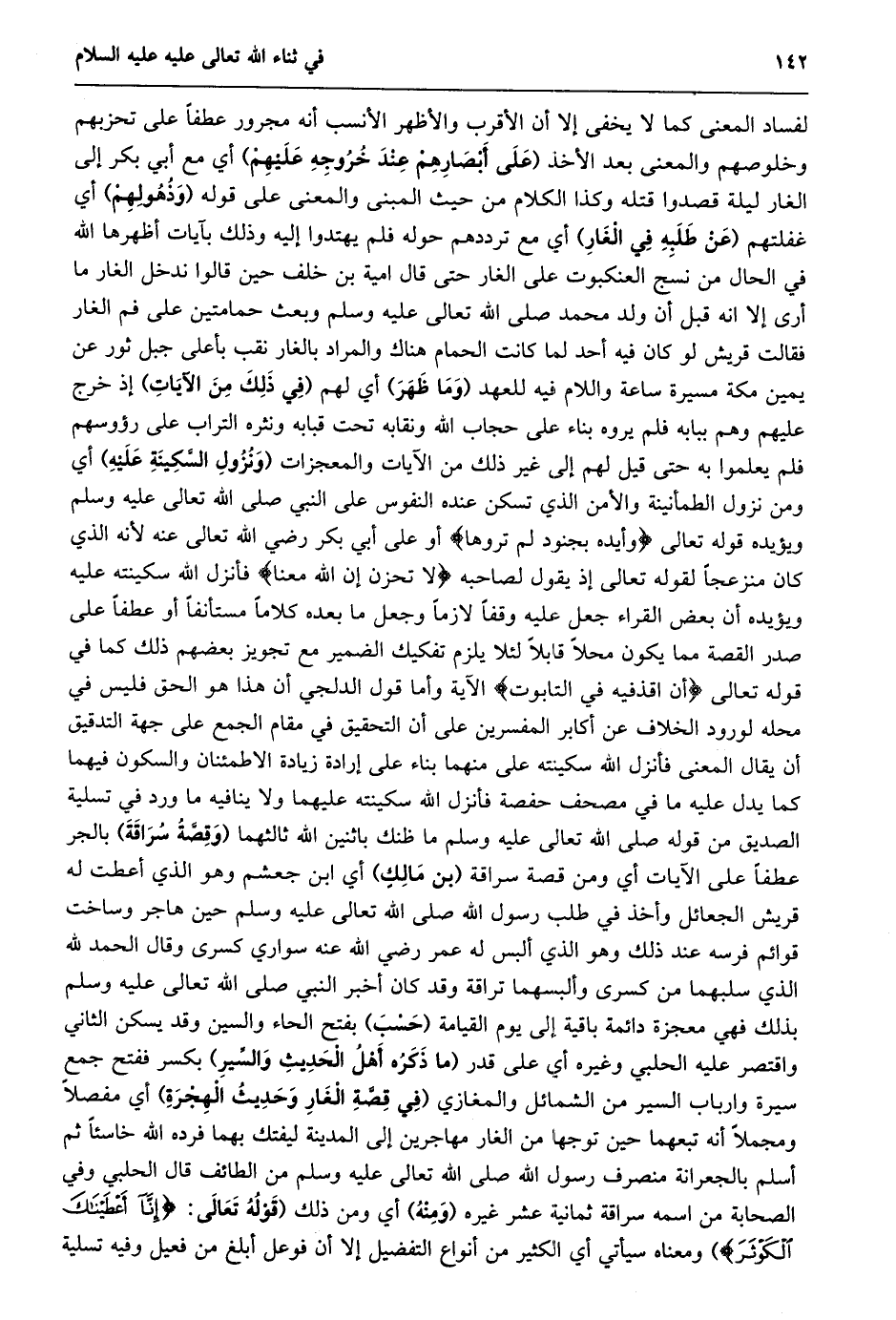 لفساد المعنى كما لا يخفى إلا أن الأقرب والأظهر الأنسب أنه مجرور عطفا على تحزبهم وخلوصهم والمعنى بعد الأخذ (على أبصارهم عند خروجه عليهم) أي مع أبي بكر إلى الغار ليلة قصدوا قتله وكذا الكلام من حيث المبنى والمعنى على قوله (وذهولهم) أي غفلتهم (عن طلبه في الغار) أي مع ترددهم حوله فلم يهتدوا إليه وذلك بآيات أظهرها الله في الحال من نسج العنكبوت على الغار حَتَّى قَالَ أُمَيَّةُ بْنُ خَلَفٍ حِينَ قَالُوا ندخل الغار ما أرى إلا انه قبل أن ولد محمد صلى الله تعالى عليه وسلم وبعث حمامتين عَلَى فَمِ الْغَارِ فَقَالَتْ قُرَيْشٌ لَوْ كَانَ فيه أحد لما كانت الحمام هناك والمراد بالغار نقب بأعلى جبل ثور عن يمين مكة مسيرة ساعة واللام فيه للعهد (وما ظهر) أي لهم (في ذلك من الآيات) إذ خرج عليهم وهم ببابه فلم يروه بناء على حجاب الله ونقابه تحت قبابه ونثره التراب على رؤوسهم فلم يعلموا به حتى قيل لهم إلى غير ذلك من الآيات والمعجزات (ونزول السّكينة عليه) أي ومن نزول الطمأنينة والأمن الذي تسكن عنده النفوس على النبي صلى الله تعالى عليه وسلم ويؤيده قوله تعالى وَأَيَّدَهُ بِجُنُودٍ لَمْ تَرَوْها أو على أبي بكر رضي الله تعالى عنه لأنه الذي كان منزعجا لقوله تعالى إذ يقول لصاحبه لا تَحْزَنْ إِنَّ اللَّهَ مَعَنا فأنزل الله سكينته عليه ويؤيده أن بعض القراء جعل عليه وقفا لازما وجعل ما بعده كلاما مستأنفا أو عطفا على صدر القصة مما يكون محلا قابلا لئلا يلزم تفكيك الضمير مع تجويز بعضهم ذلك كما في قوله تعالى أَنِ اقْذِفِيهِ فِي التَّابُوتِ الآية وأما قول الدلجي أن هذا هو الحق فليس في محله لورود الخلاف عن أكابر المفسرين على أن التحقيق في مقام الجمع على جهة التدقيق أن يقال المعنى فأنزل الله سكينته على منهما بناء على إرادة زيادة الاطمئنان والسكون فيهما كما يدل عليه ما في مصحف حفصة فأنزل الله سكينته عليهما ولا ينافيه ما ورد في تسلية الصديق من قوله صلى الله تعالى عليه وسلم ما ظنك باثنين الله ثالثهما (وقصّة سراقة) بالجر عطفا على الآيات أي ومن قصة سراقة (بن مالك) أي ابن جعشم وهو الذي أعطت له قريش الجعائل وأخذ في طلب رسول الله صلى الله تعالى عليه وسلم حين هاجر وساخت قوائم فرسه عند ذلك وهو الذي ألبس له عمر رضي الله عنه سواري كسرى وقال الحمد لله الذي سلبهما من كسرى وألبسهما تراقة وقد كان أخبر النبي صلى الله تعالى عليه وسلم بذلك فهي معجزة دائمة باقية إلى يوم القيامة (حسب) بفتح الحاء والسين وقد يسكن الثاني واقتصر عليه الحلبي وغيره أي على قدر (ما ذكره أهل الحديث والسّير) بكسر ففتح جمع سيرة وارباب السير من الشمائل والمغازي (في قصّة الغار وحديث الهجرة) أي مفصلا ومجملا أنه تبعهما حين توجها من الغار مهاجرين إلى المدينة ليفتك بهما فرده الله خاسئا ثم أسلم بالجعرانة منصرف رسول الله صلى الله تعالى عليه وسلم من الطائف قال الحلبي وفي الصحابة من اسمه سراقة ثمانية عشر غيره (ومنه) أي ومن ذلك (قوله تعالى: إِنَّا أَعْطَيْناكَ الْكَوْثَرَ) ومعناه سيأتي أي الكثير من أنواع التفضيل إلا أن فوعل أبلغ من فعيل وفيه تسلية