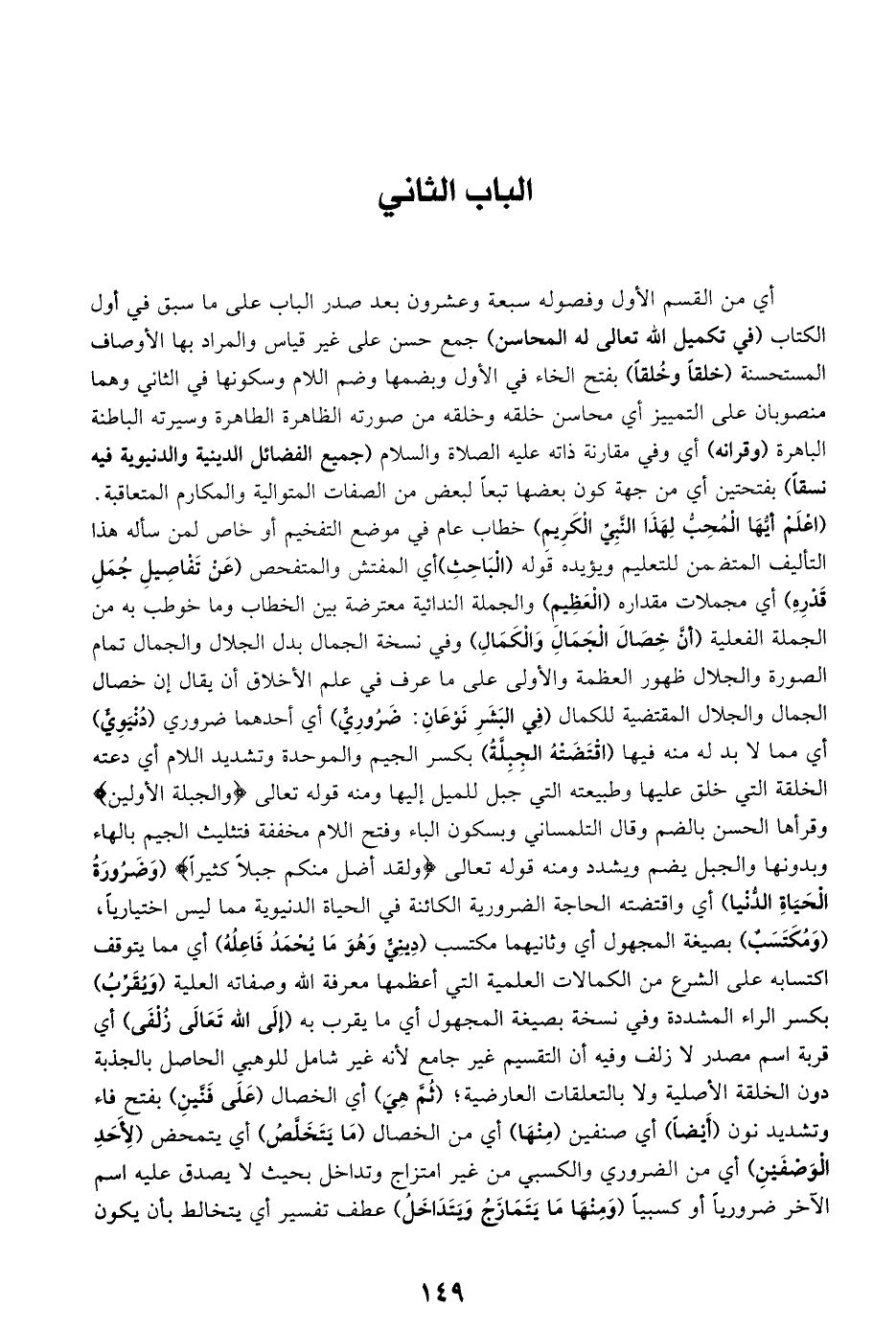 (اعلم أيّها المحبّ لهذا النّبيّ الكريم) خطاب عام في موضع التفخيم أو خاص لمن سأله هذا التأليف المتضمن للتعليم ويؤيده قوله (الباحث) أي المفتش والمتفحص (عن تفاصيل جمل قدره) أي مجملات مقداره (العظيم) والجملة الندائية معترضة بين الخطاب وما خوطب به من الجملة الفعلية (أنّ خصال الجمال والكمال) وفي نسخة الجمال بدل الجلال والجمال تمام الصورة والجلال ظهور العظمة والأولى على ما عرف في علم الأخلاق أن يقال إن خصال الجمال والجلال المقتضية للكمال (في البشر نوعان: ضروريّ) أي أحدهما ضروري (دنيويّ) أي مما لا بد له منه فيها (اقتضته الجبلّة) بكسر الجيم والموحدة وتشديد اللام أي دعته الخلقة التي خلق عليها وطبيعته التي جبل للميل إليها ومنه قوله تعالى وَالْجِبِلَّةَ الْأَوَّلِينَ وقرأها الحسن بالضم وقال التلمساني وبسكون الباء وفتح اللام مخففة فتثليث الجيم بالهاء وبدونها والجبل يضم ويشدد ومنه قوله تعالى وَلَقَدْ أَضَلَّ مِنْكُمْ جِبِلًّا كَثِيراً (وضرورة الحياة الدّنيا) أي واقتضته الحاجة الضرورية الكائنة في الحياة الدنيوية مما ليس اختياريا، (ومكتسب) بصيغة المجهول أي وثانيهما مكتسب (دينيّ وهو ما يحمد فاعله) أي مما يتوقف اكتسابه على الشرع من الكمالات العلمية التي أعظمها معرفة الله وصفاته العلية (ويقرّب) بكسر الراء المشددة وفي نسخة بصيغة المجهول أي ما يقرب به (إلى الله تعالى زلفى) أي قربة اسم مصدر لا زلف وفيه أن التقسيم غير جامع لأنه غير شامل للوهبي الحاصل بالجذبة دون الخلقة الأصلية ولا بالتعلقات العارضية؛ (ثمّ هي) أي الخصال (على فنّين) بفتح فاء وتشديد نون (أيضا) أي صنفين (منها) أي من الخصال (ما يتخلّص) أي يتمحض (لأحد الوصفين) أي من الضروري والكسبي من غير امتزاج وتداخل بحيث لا يصدق عليه اسم الآخر ضروريا أو كسبيا (ومنها ما يتمازج ويتداخل) عطف تفسير أي يتخالط بأن يكون
